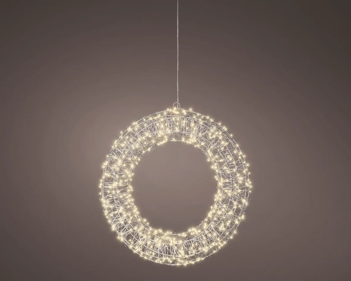 Refined and radiant, this silver wreath brings a gentle brilliance to any setting. Designed with delicate silver wire and filled with warm white micro LED lights, it glows with a soft, ethereal light that feels both modern and timeless. A coordinating silver cable offers a seamless, elegant presentation. Wherever displayed, this luminous wreath adds a festive shimmer that transforms your space with holiday charm.