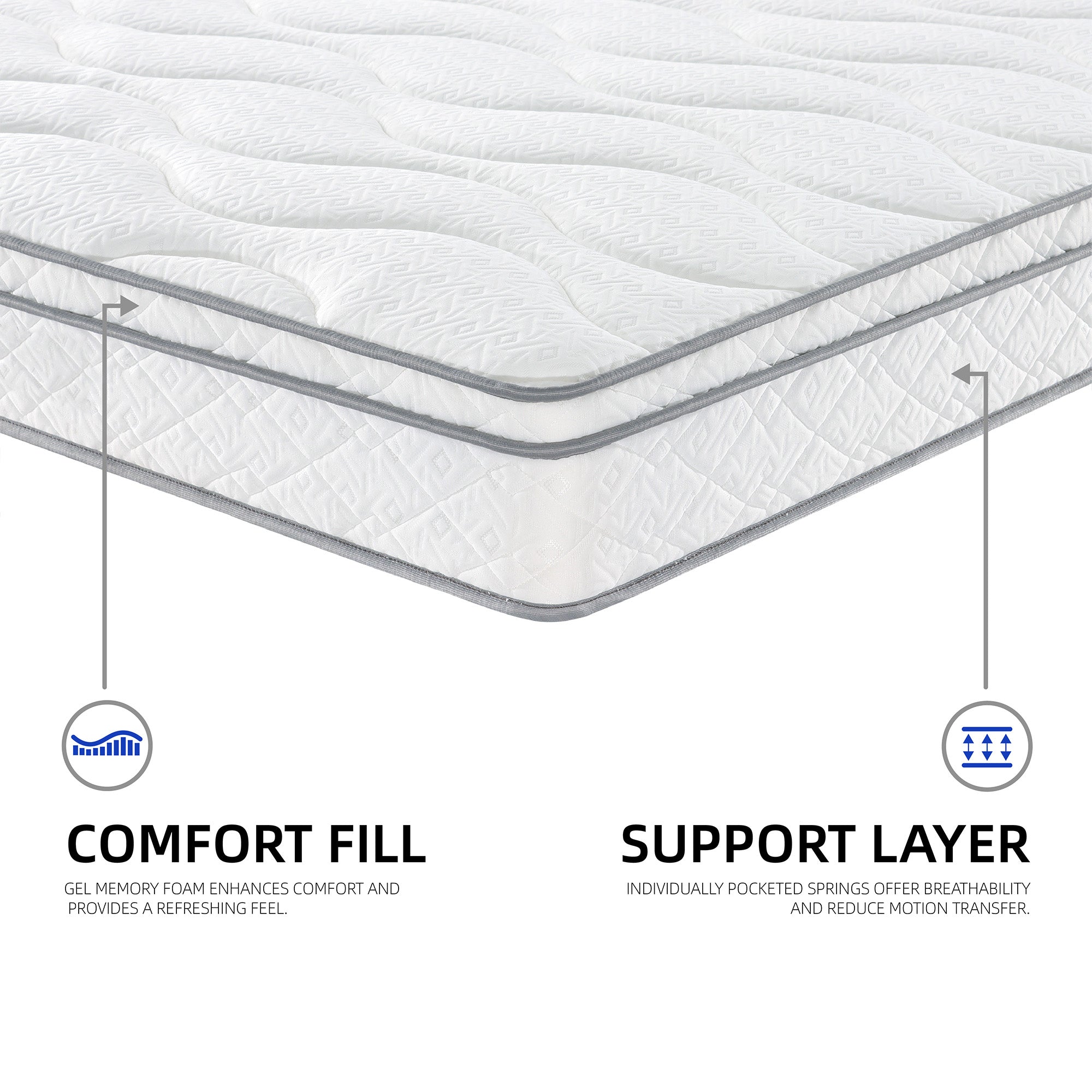?GEL MEMORY FOAM LAYER?: The mattress has an advanced blue gel memory foam layer. It regulates temperature and boosts airflow. The blue gel absorbs and dissipates body heat, keeping the mattress at an ideal sleeping temperature. Its perforated structure enhances breathability, creating a comfortable sleep environment for a restful night.