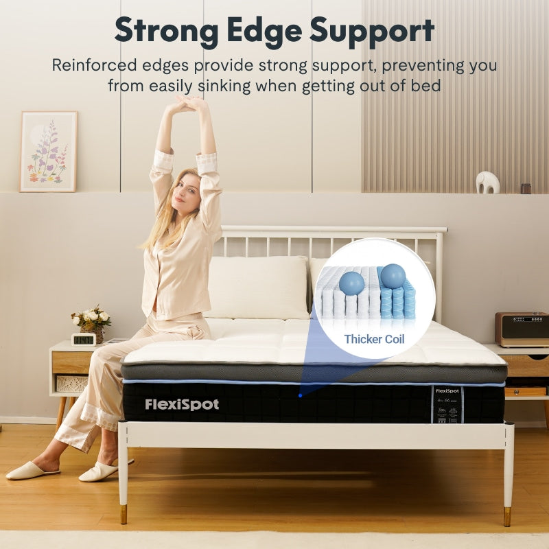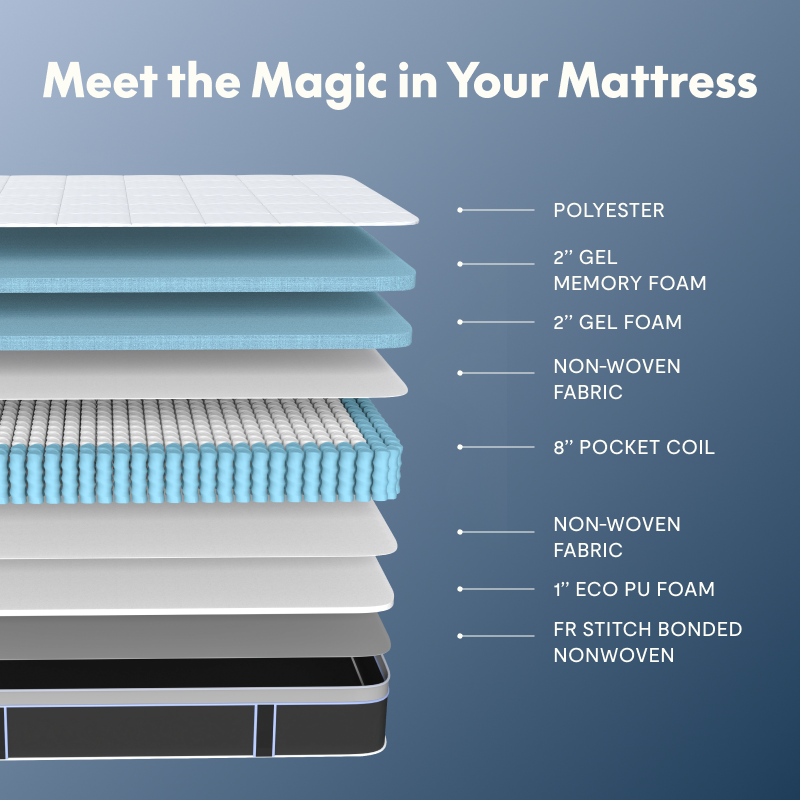 Our mattress is built to last with a robust design featuring 14-gaugesprings in the center, 13-gauge springs around the perimeter and 768 individually wrapped coils of queen size for enhanced support. The high-density foam layer, at 2.2 PCF, ensures that your nattress won't sag after a long night's sleep. Plus, the 5-inch thick foamlayer provides exceptional comfort, so you wake up feeling refreshed and well-rested.