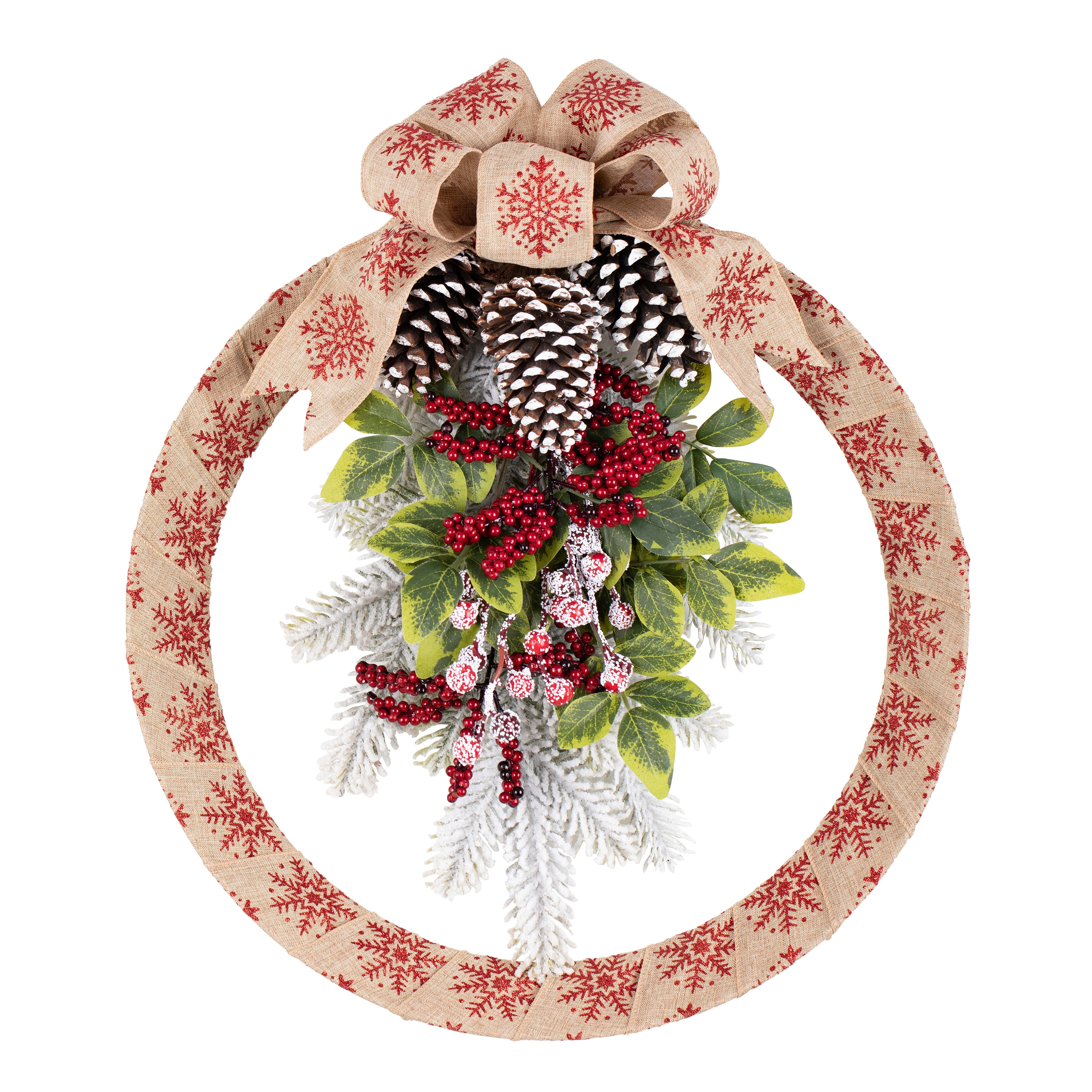 The Snowflake Homespun Wreath is the perfect solution for displaying a wreath between the front door and screen door! A new type of wreath, this Homespun Wreath features a metal frame wrapped in weather-resistant fabric Homespun style ribbon. A mixed artificial greenery spray consists of decorative PE leaves, real pinecones, and a mixture of faux red berries. A beautiful weather-resistant burlap bow features red glitter snowflakes ribbon and is the finishing touch to this new style of a classic wreath. Perfect for indoor and outdoor use! Measures 18-inch Diameter by 4 Inches Deep. Weighs 1.1 lbs.