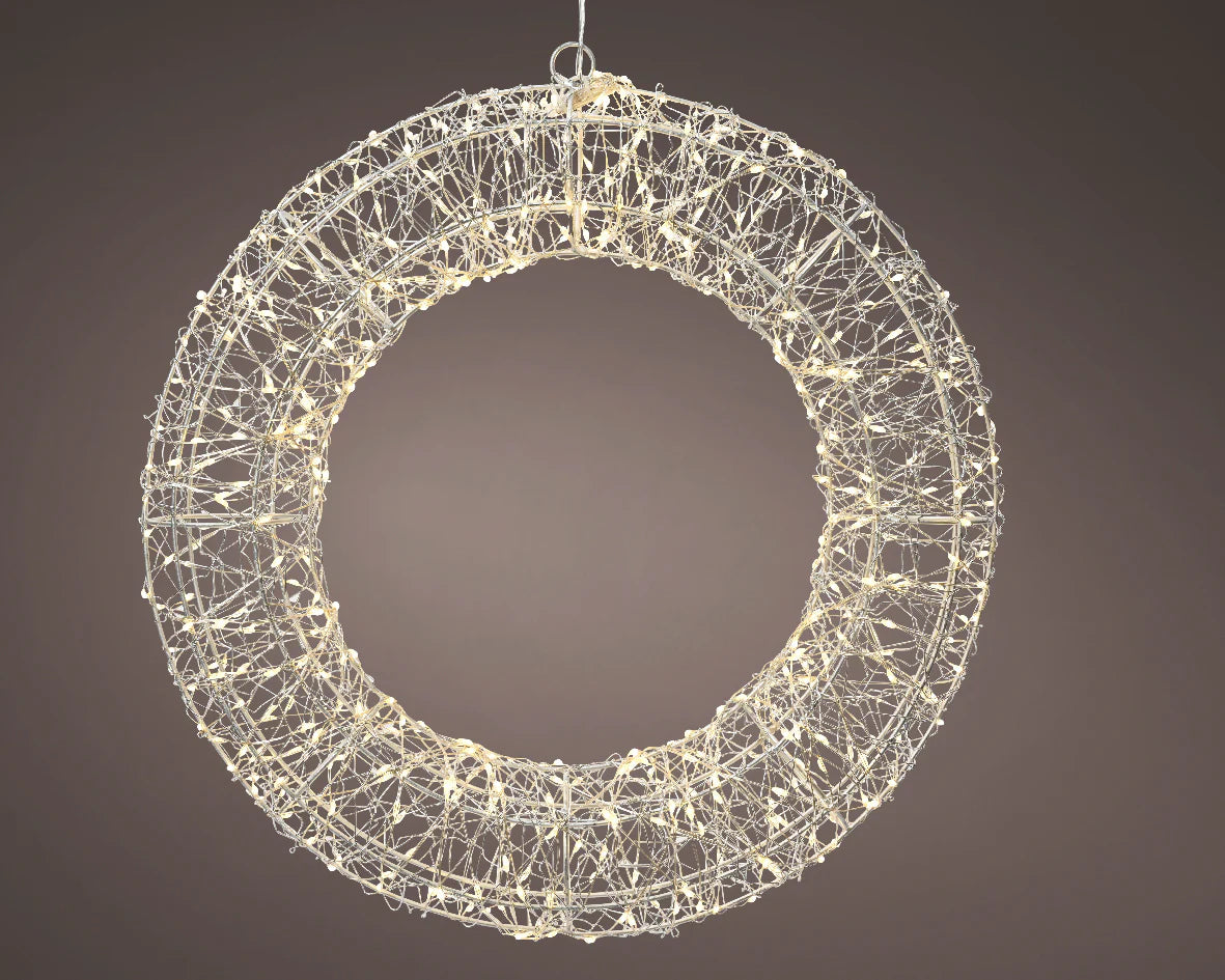 Elegant and luminous, this silver wreath casts a captivating glow that enchants both day and night. Intricately crafted from shimmering silver wire and illuminated by warm white micro LED lights, it radiates a soft, celestial brilliance. The matching silver cable blends seamlessly for a polished, floating effect. This radiant wreath brings a touch of festive magic to any space ready to shine with holiday warmth and wonder.