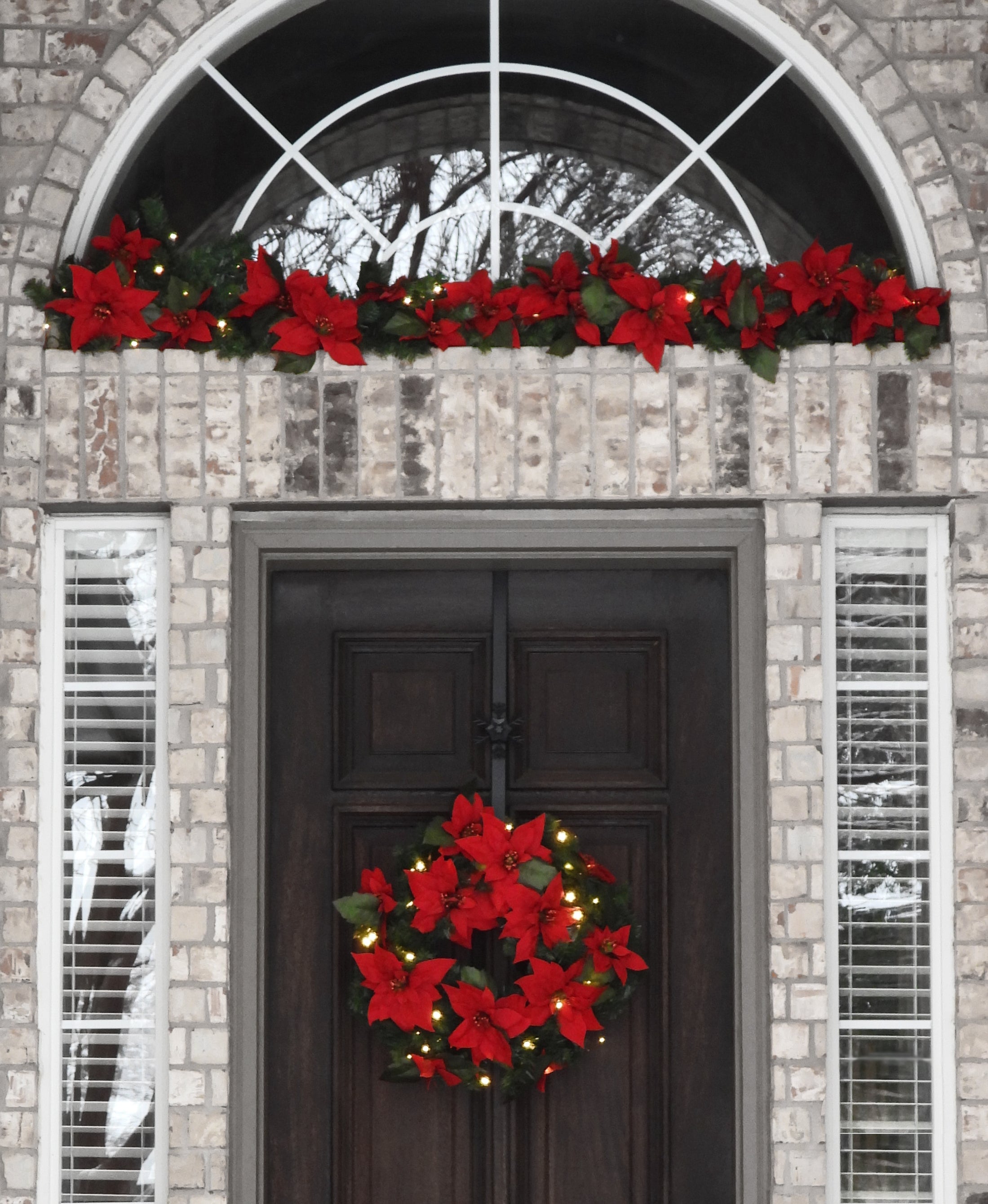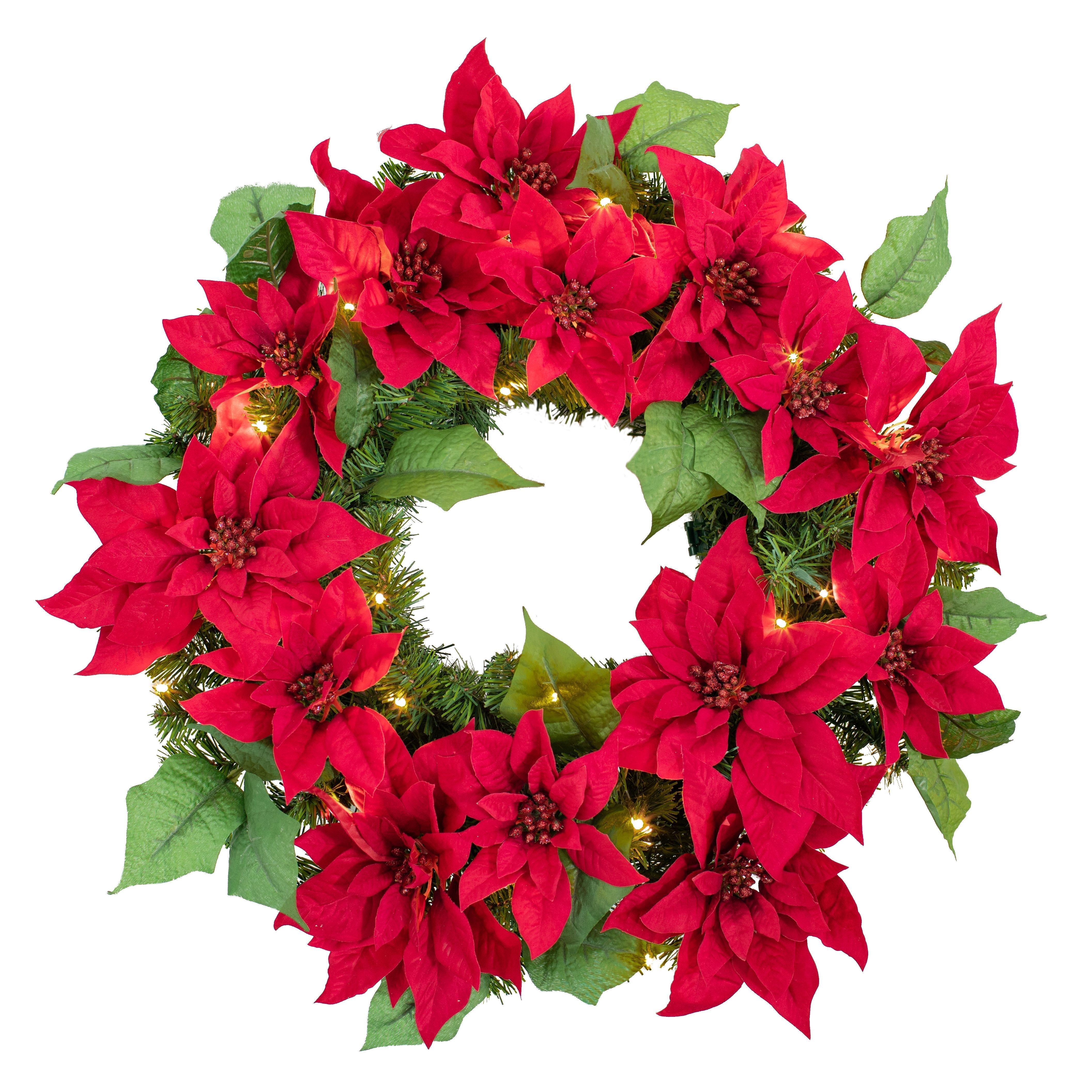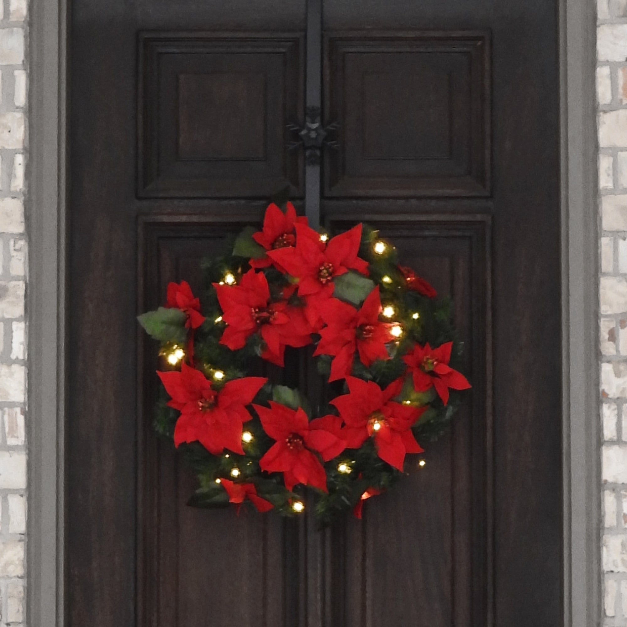 Sophisticated 24 Inch Poinsettia Wreath features vibrant red poinsettias and 90 PVC greenery tips (50% PVC/50% Other). Pre-lit with 30soft white LED lights with a built-in timer function that runs 6 hours on/18 hours off. The double wireframe is wrapped with PVC to prevent scratching the door while adding stability. The battery box locks into the frame which allows the wreath to lay flush against a flat surface. Requires 3 AA batteries not included. Weather safe for indoors or out. Measures 24-inch in Diameter x 8 Inches Deep and Weighs 2.4 lbs.