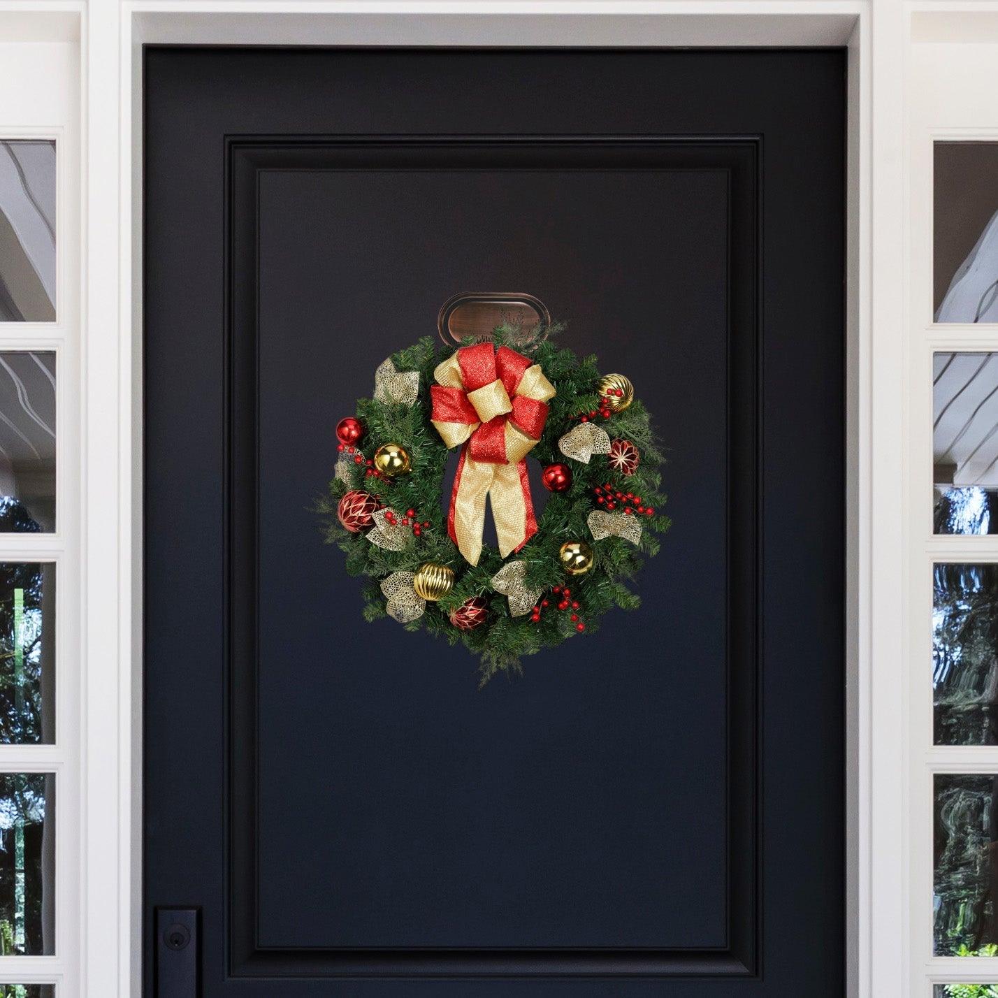 A stunning wreath in shades of red and gold - the Madison 24-inch wreath is perfect for any door or wall. It is accented with weather-safe ribbons and shatterproof ornaments on a PVC mixed greenery base, so it is ideal for outdoor settings as well as over a mantel inside. Pre-lit with 30 soft white battery operated LED lights with a built-in timer function that runs 6 hours on and 18 hours off.