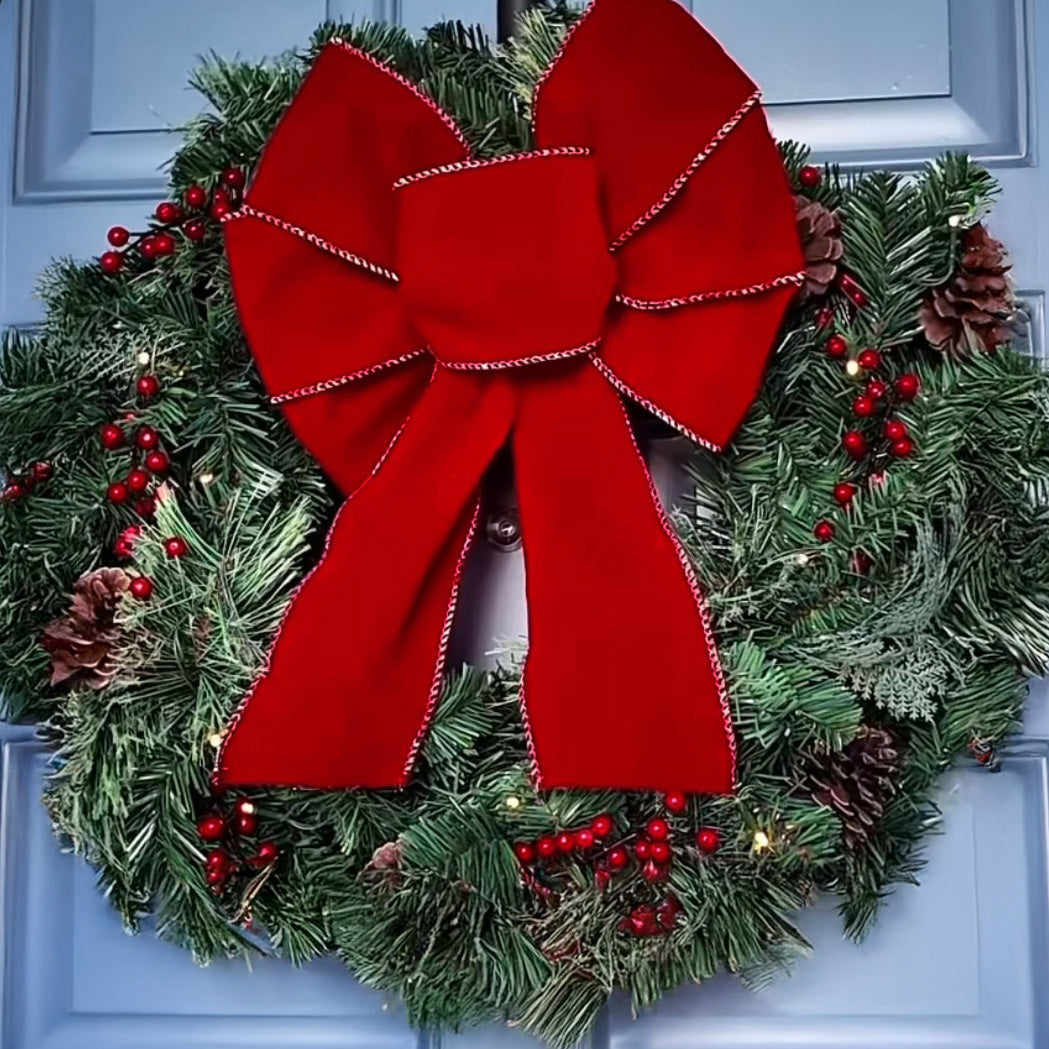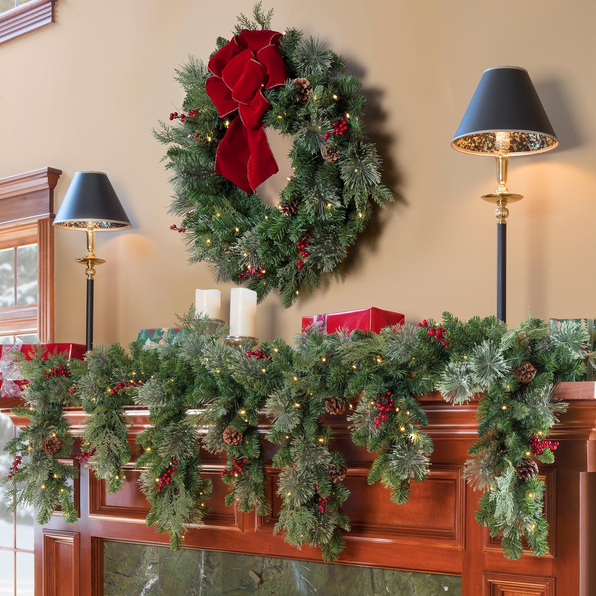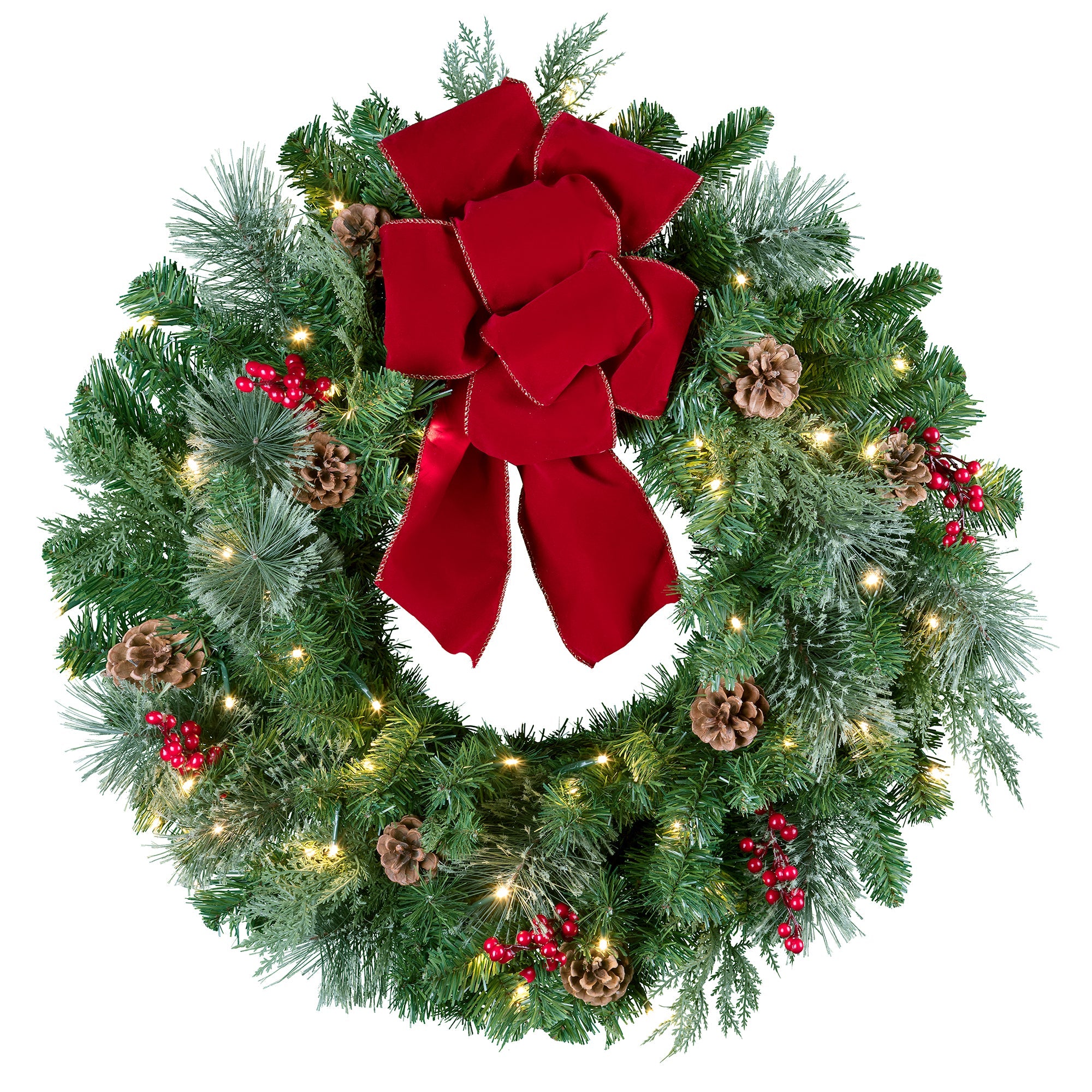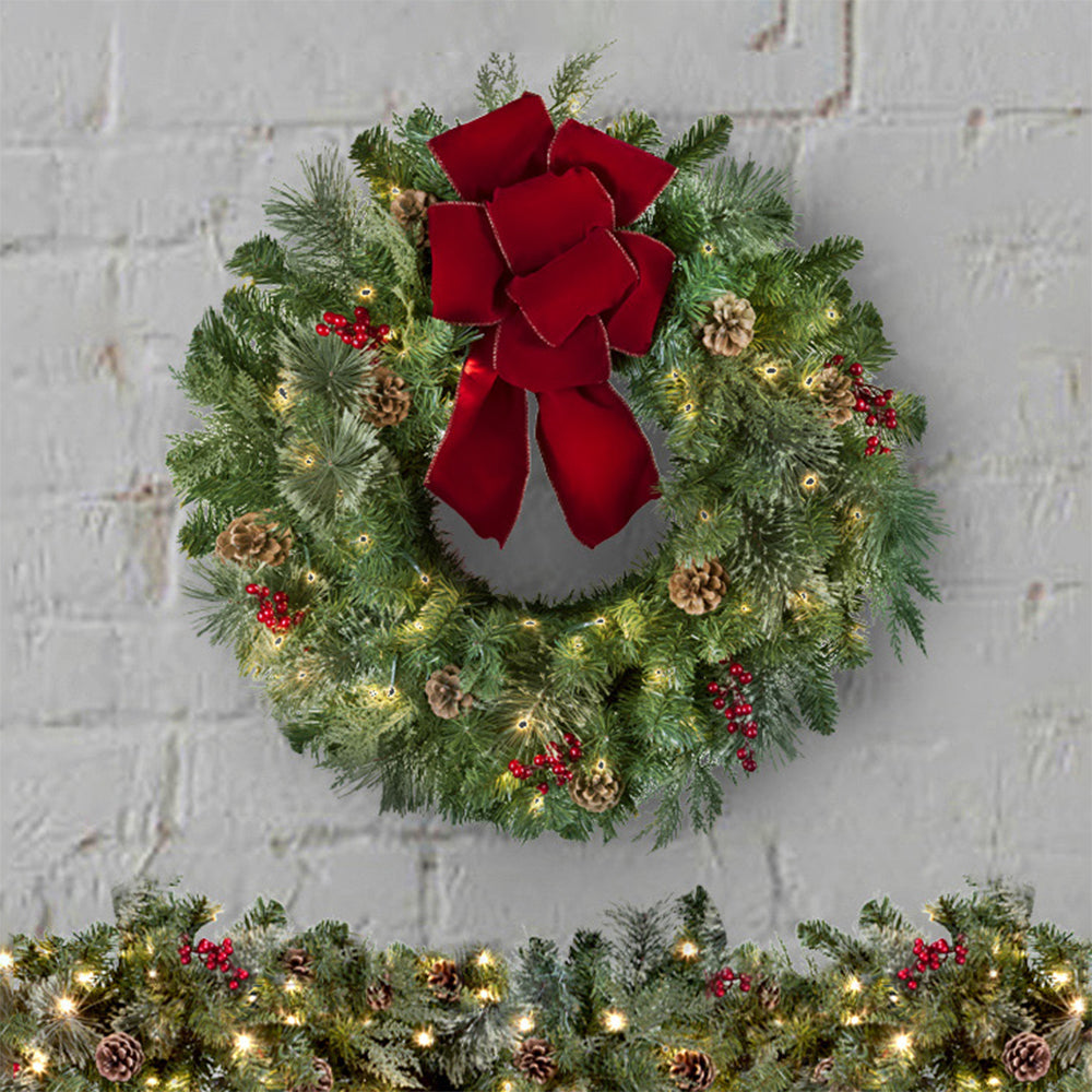 *Free Shipping* Perfect your Christmas decor with this 24 inch Classic style Pre-lit Christmas Wreath! This wreath showcases an assortment of 110 lush, mixed greenery tips, faux berries, and real pinecones. Pre-lit with 50 warm white LED lights and has a battery box that contains a built-in timer function that starts a countdown when turned on which runs 6 hours on and 18 hours off. The PVC mixed greenery is wrapped around a double frame giving this wreath depth and dimension wherever you hang it. A beautiful weather-safe dark red velvet bow is the finishing touch to this classic wreath. Perfect for indoor and outdoor use!