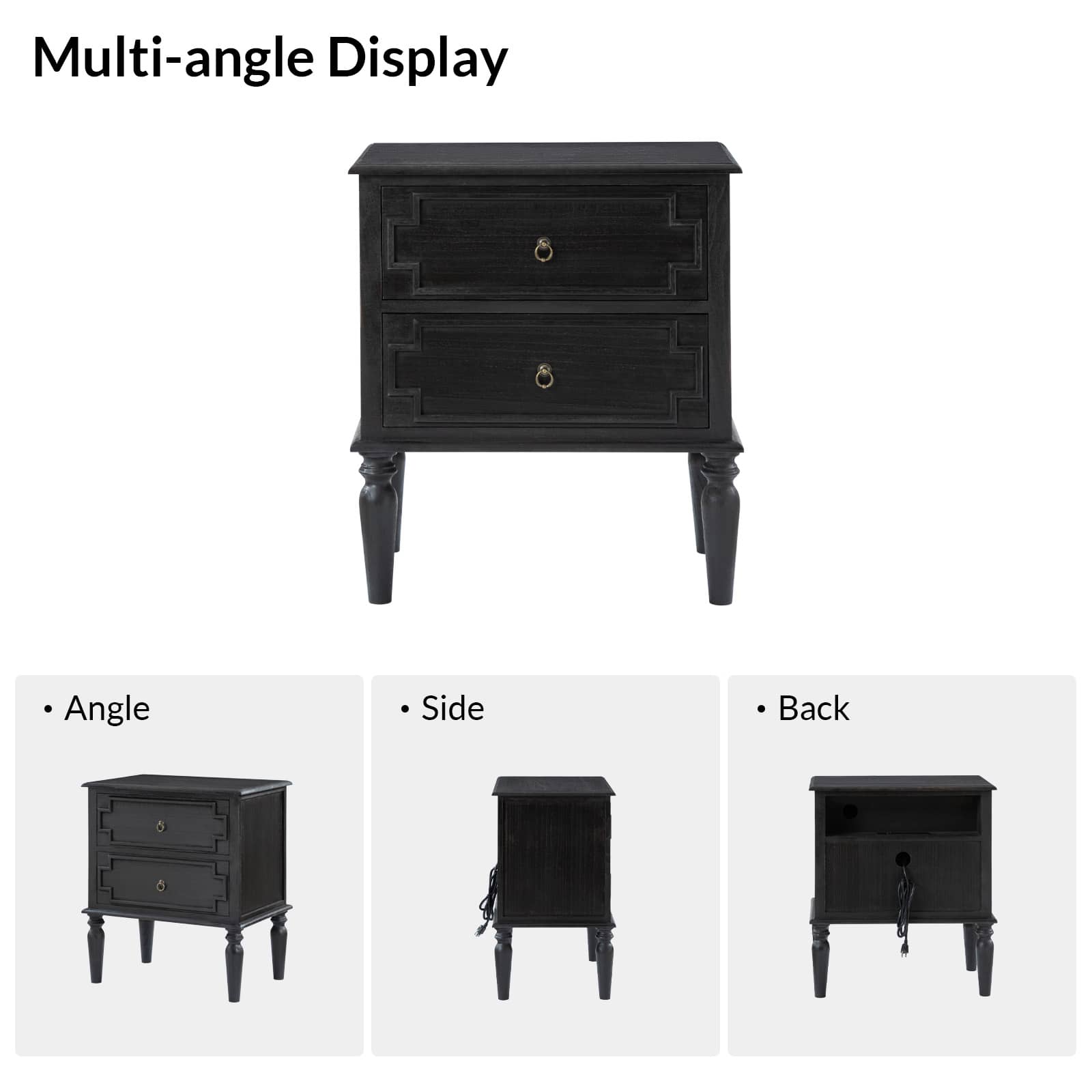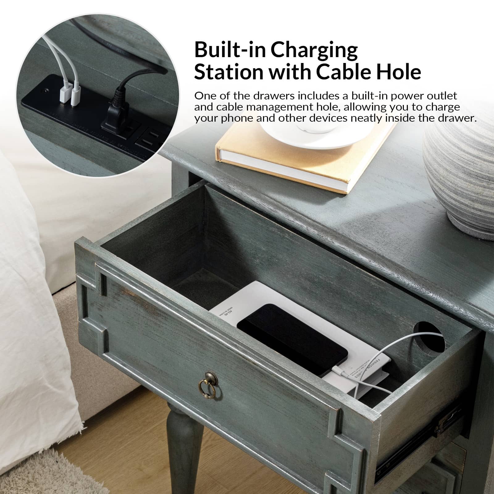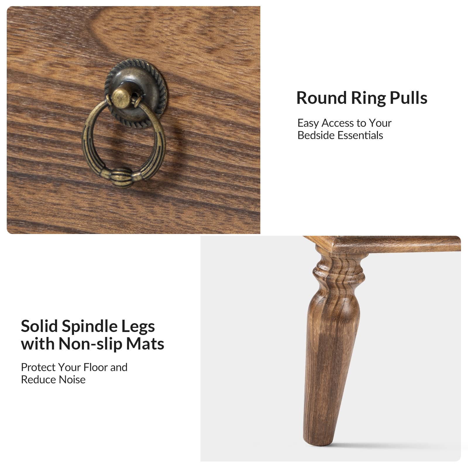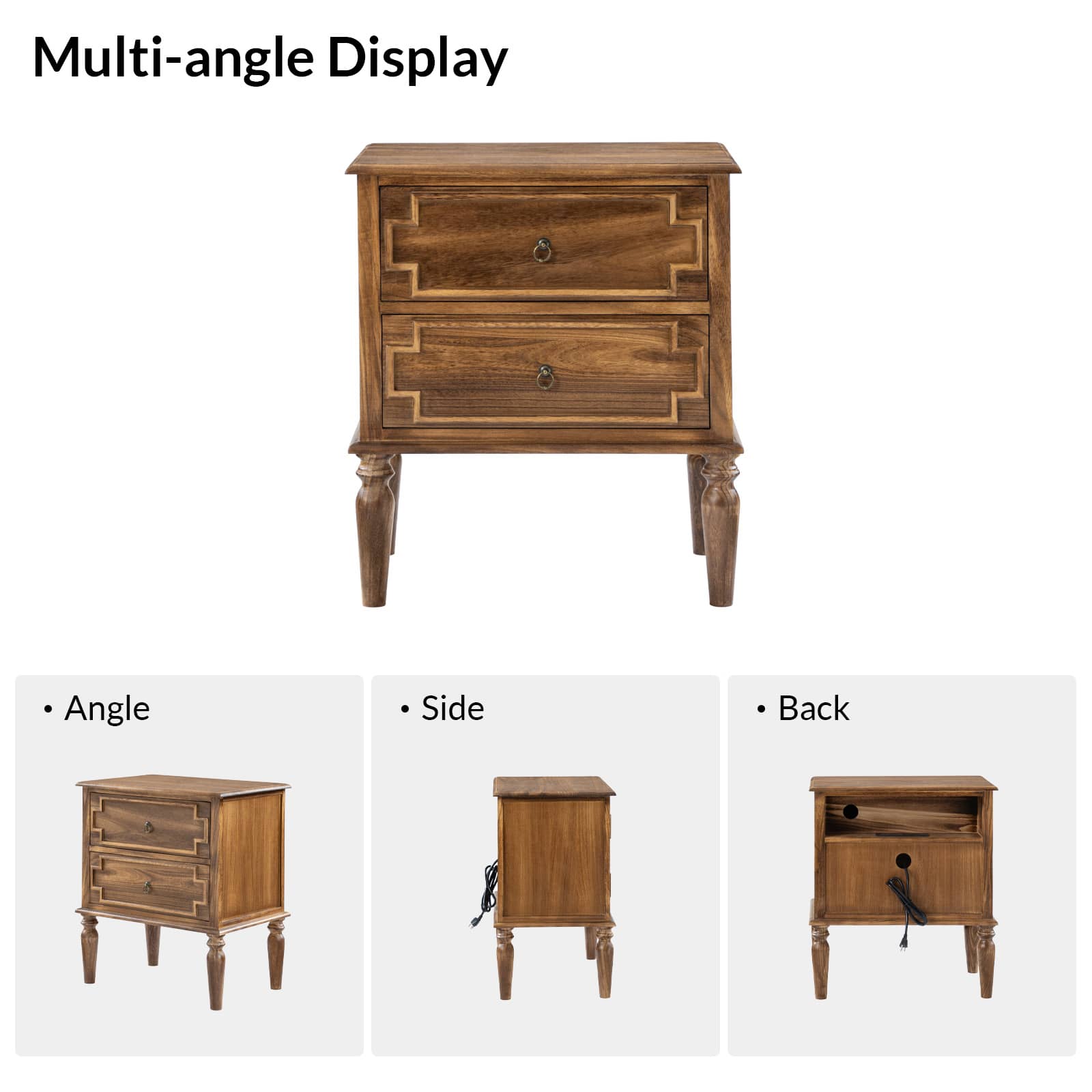 The charming 2-drawer nightstand seamlessly blends farmhouse and transitional styles, suitable for adding a touch of rustic elegance to your bedroom. Constructed from solid wood, it features a warm, natural finish that highlights the wood's grain. The nightstand is adorned with decorative wood trim on the drawer faces, enhancing its classic appeal. Equipped with round ring pulls, the drawers open smoothly to reveal ample storage space. One of the drawers is thoughtfully designed with a built-in charging station and cable management hole, allowing you to keep your phone charged while keeping cords neatly out of sight. The nightstand stands on elegant spindle legs with cushioned pads to protect your floors. Whether you're aiming for a cozy country vibe or a transitional look, this versatile piece blends seamlessly into any decor, making it an addition to your bedroom or guest room.