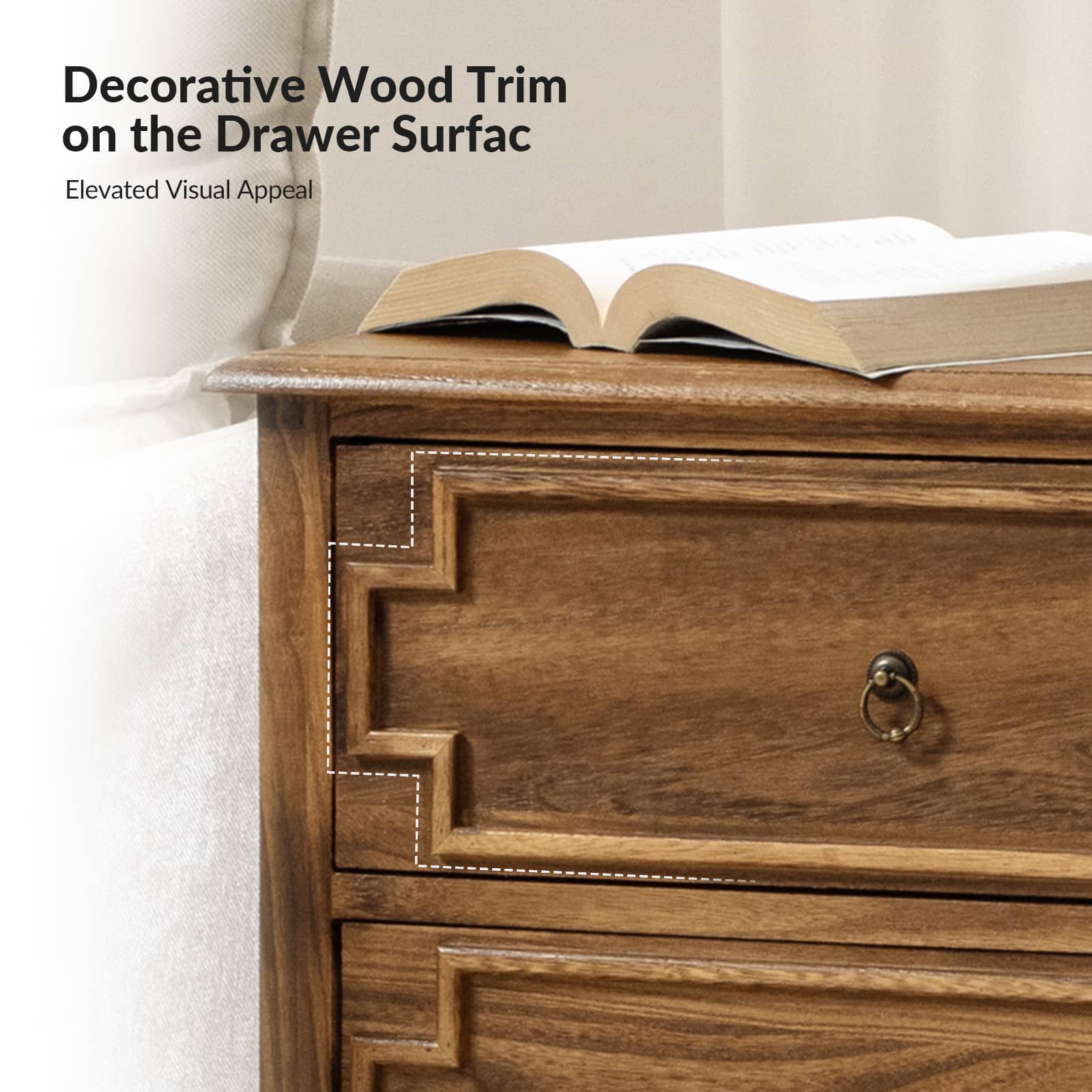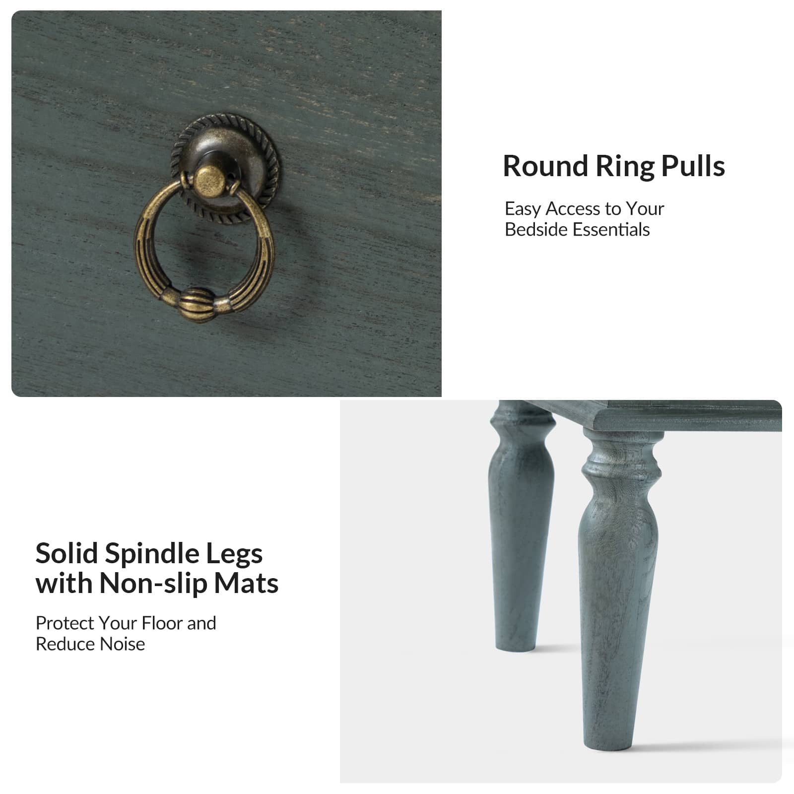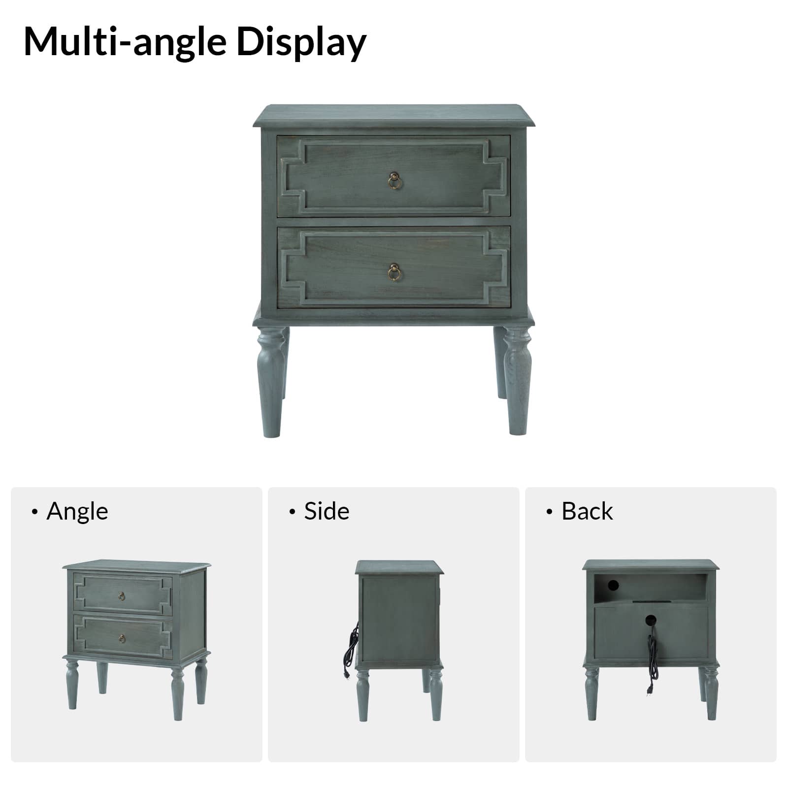 The charming 2-drawer nightstand seamlessly blends farmhouse and transitional styles, suitable for adding a touch of rustic elegance to your bedroom. Constructed from solid wood, it features a warm, natural finish that highlights the wood's grain. The nightstand is adorned with decorative wood trim on the drawer faces, enhancing its classic appeal. Equipped with round ring pulls, the drawers open smoothly to reveal ample storage space. One of the drawers is thoughtfully designed with a built-in charging station and cable management hole, allowing you to keep your phone charged while keeping cords neatly out of sight. The nightstand stands on elegant spindle legs with cushioned pads to protect your floors. Whether you're aiming for a cozy country vibe or a transitional look, this versatile piece blends seamlessly into any decor, making it an addition to your bedroom or guest room.