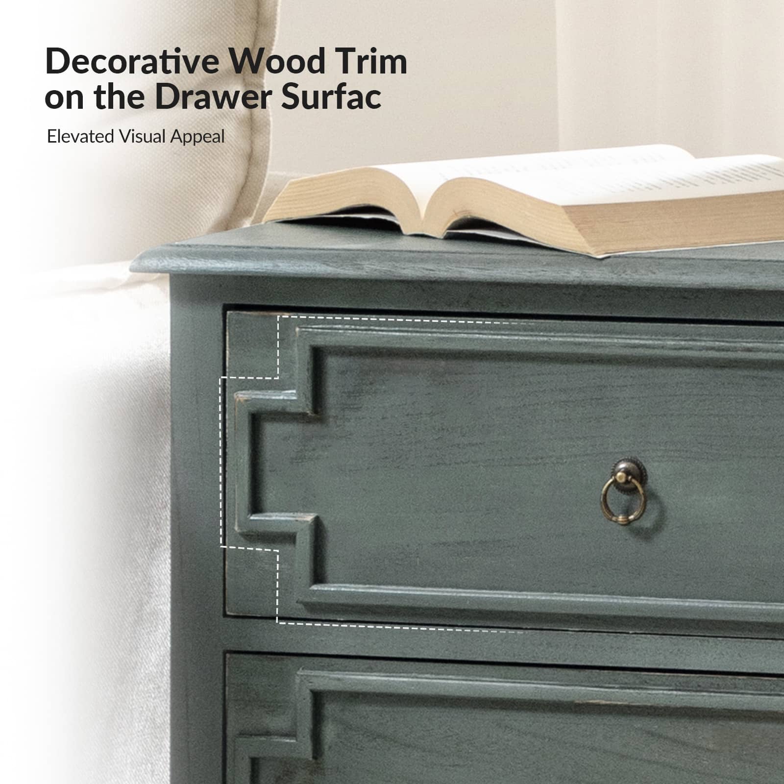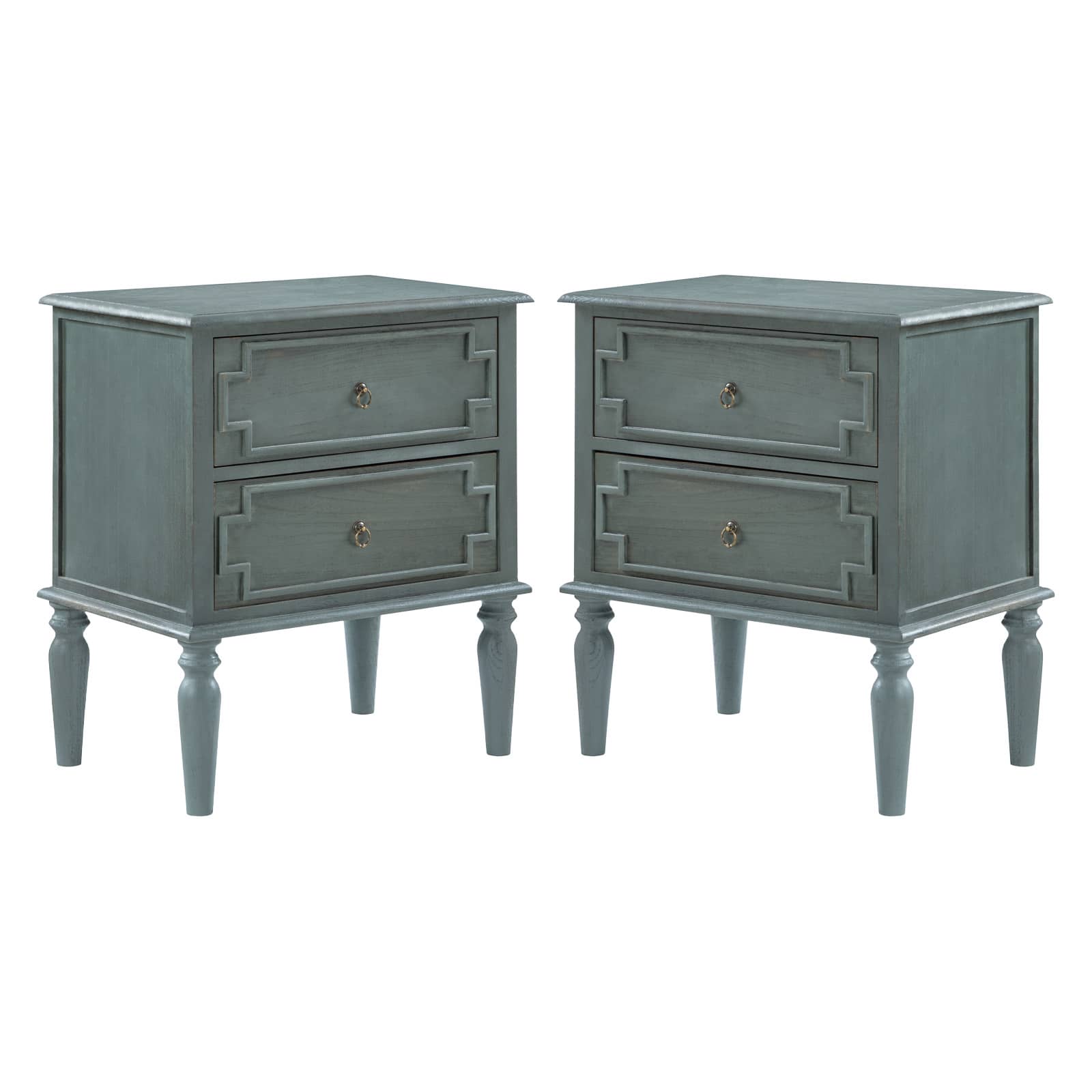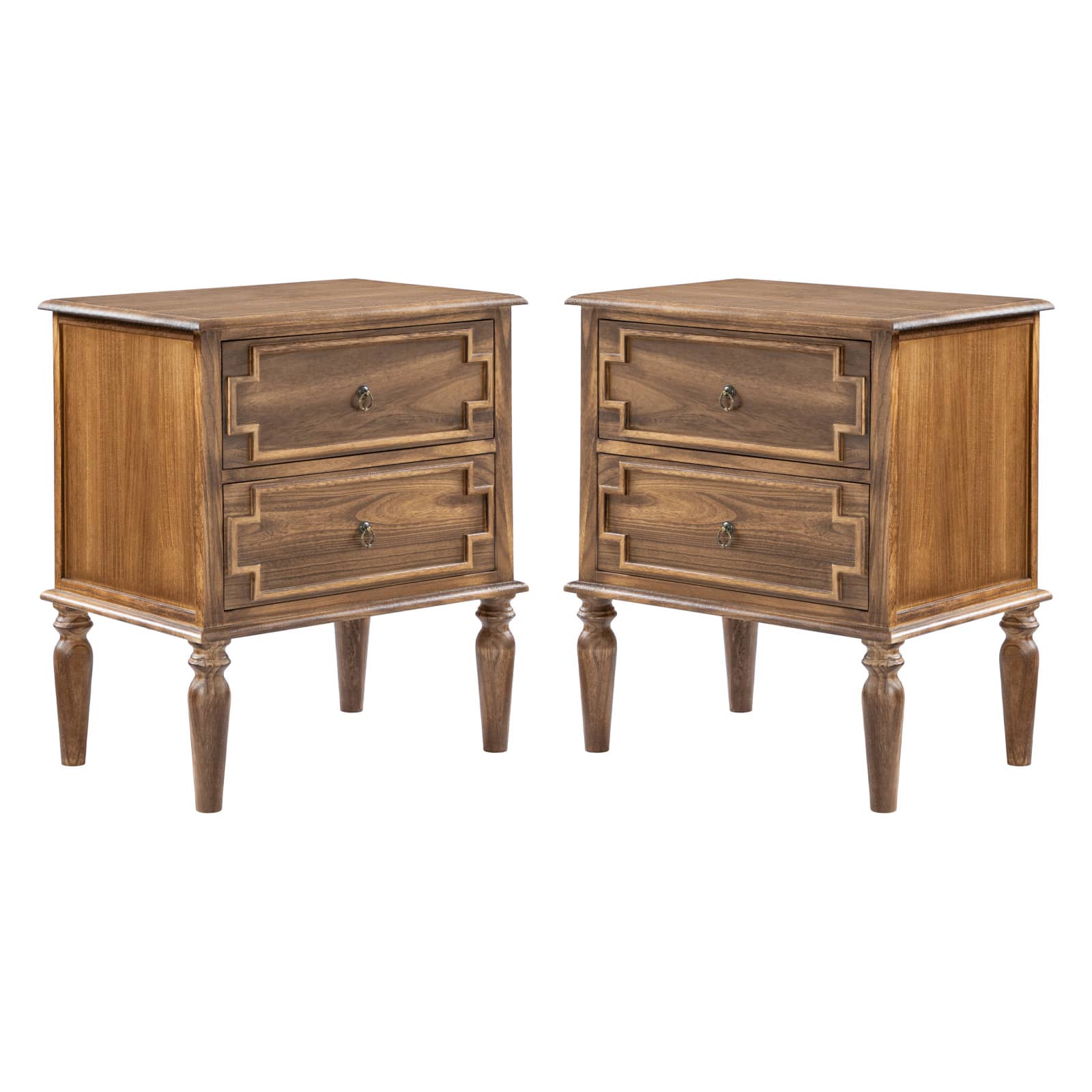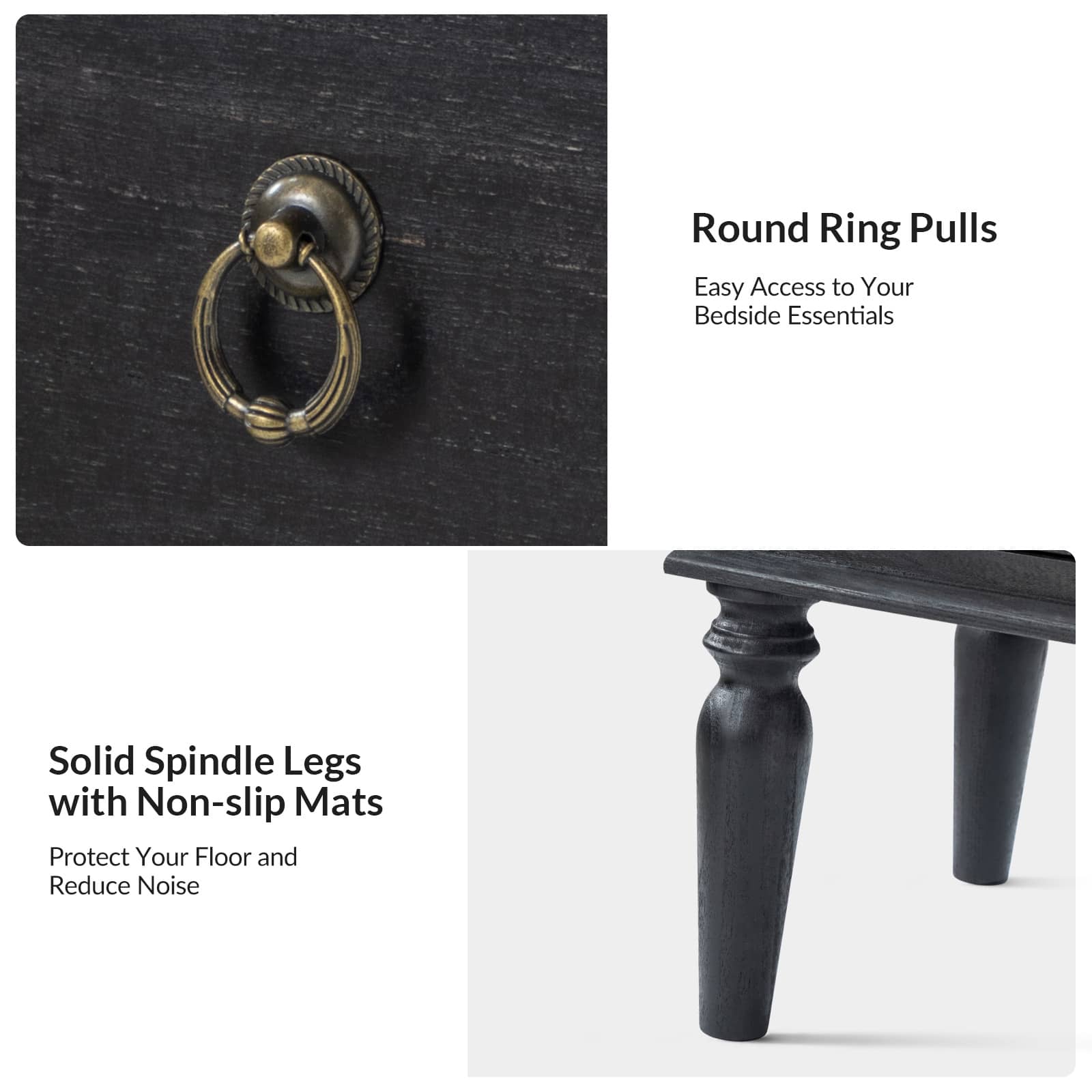 The charming 2-drawer nightstand seamlessly blends farmhouse and transitional styles, suitable for adding a touch of rustic elegance to your bedroom. Constructed from solid wood, it features a warm, natural finish that highlights the wood's grain. The nightstand is adorned with decorative wood trim on the drawer faces, enhancing its classic appeal. Equipped with round ring pulls, the drawers open smoothly to reveal ample storage space. One of the drawers is thoughtfully designed with a built-in charging station and cable management hole, allowing you to keep your phone charged while keeping cords neatly out of sight. The nightstand stands on elegant spindle legs with cushioned pads to protect your floors. Whether you're aiming for a cozy country vibe or a transitional look, this versatile piece blends seamlessly into any decor, making it an addition to your bedroom or guest room.