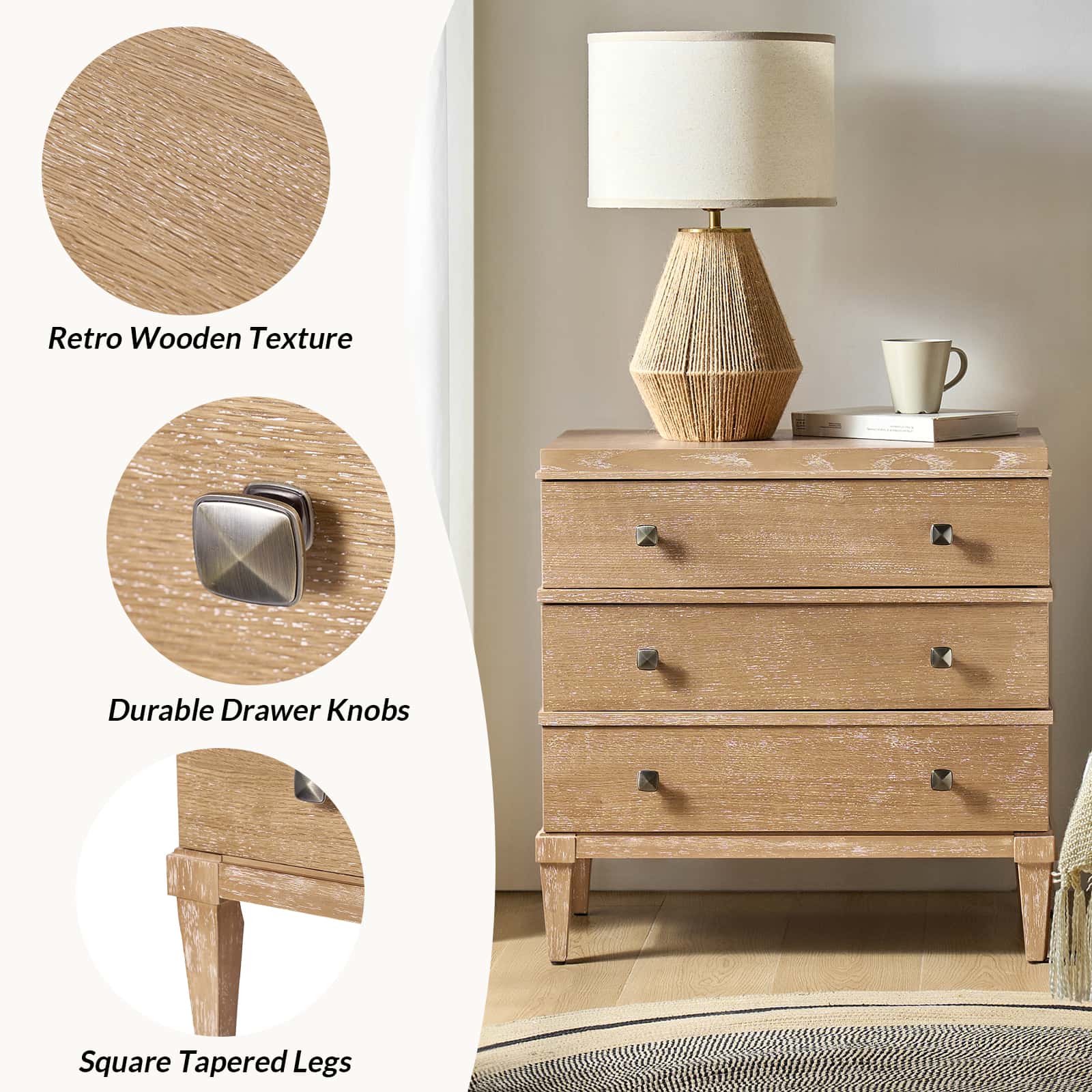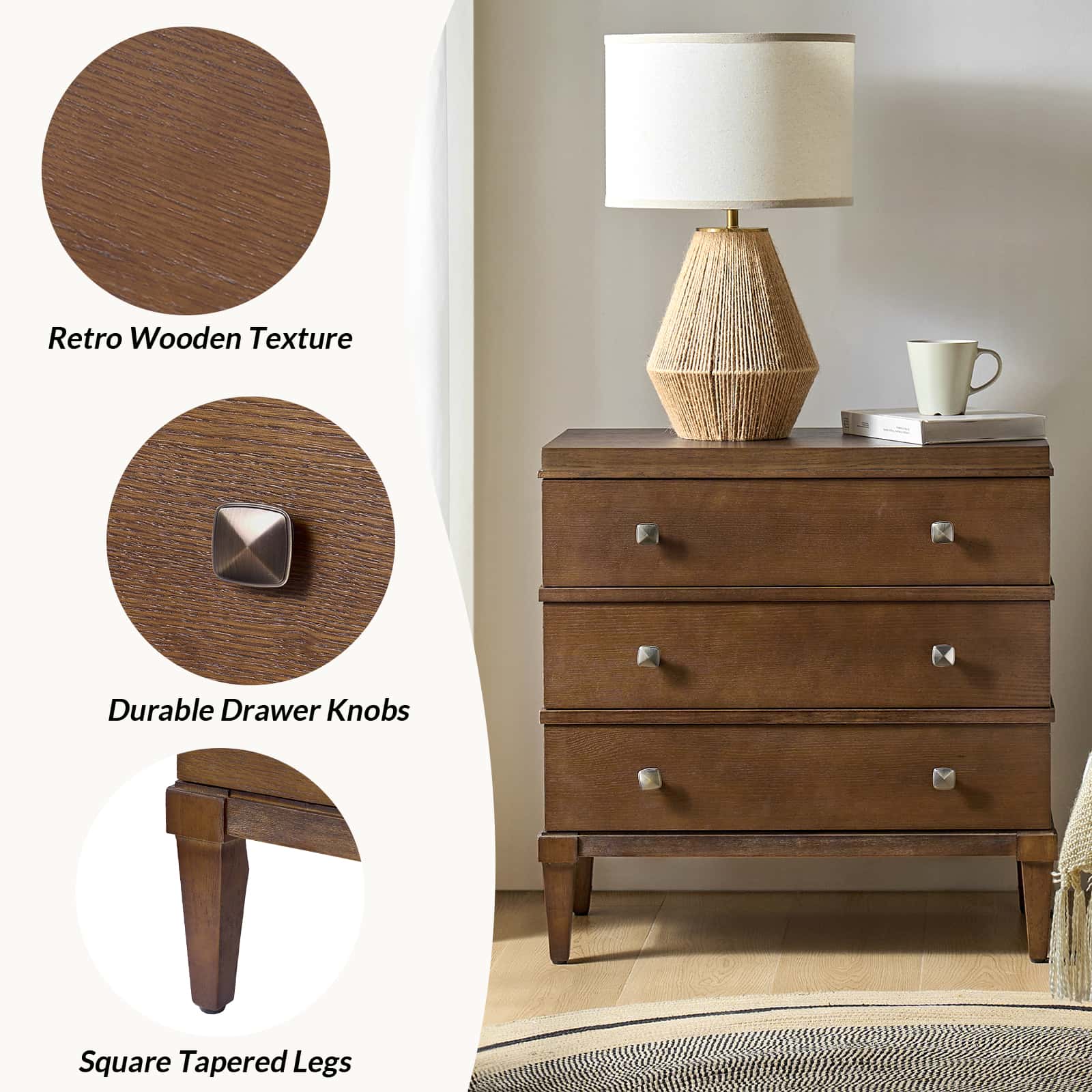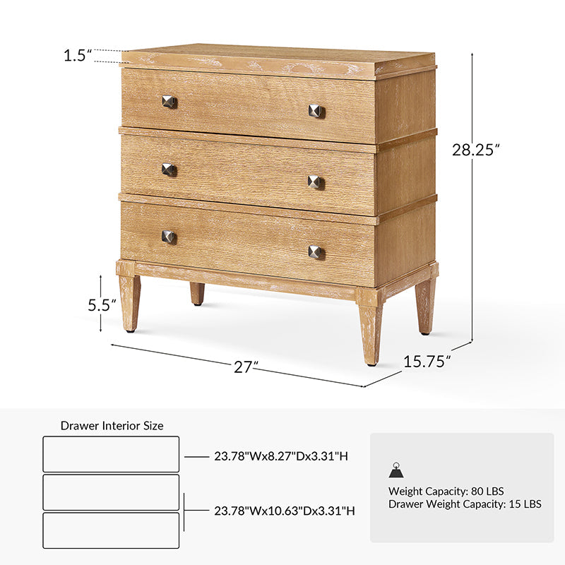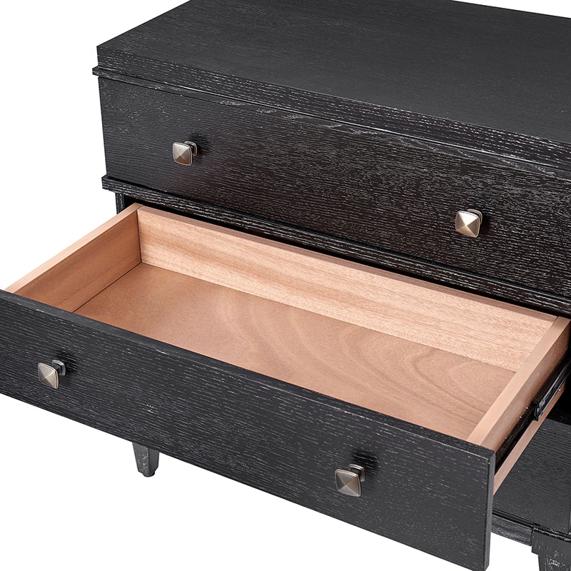 This transitional nightstand combines modern functionality with classic design elements. Featuring a sleek square metal knob that adds a contemporary touch, it offers both style and convenience. The nightstand is with square tapered legs, providing a sturdy foundation and an elegant silhouette. Three spacious drawers offer ample storage, while the top drawer is equipped with a hidden charging station at the back, making it easy to keep your devices powered without clutter. This versatile nightstand is suitable for bedrooms or living spaces, offering a blend of timeless design and modern convenience that suits a wide range of decor styles. Its thoughtful design ensures both practicality and a refined aesthetic for your home.