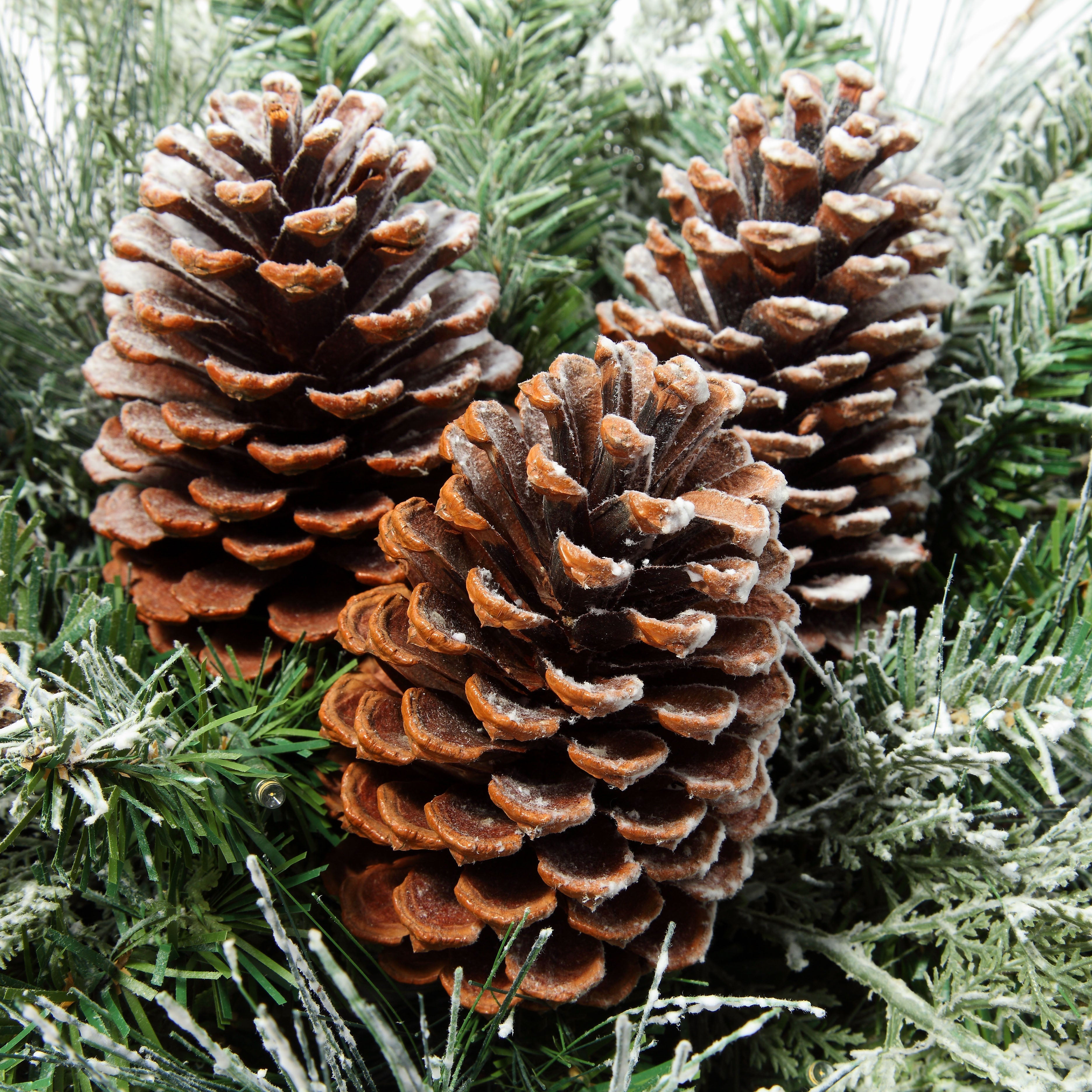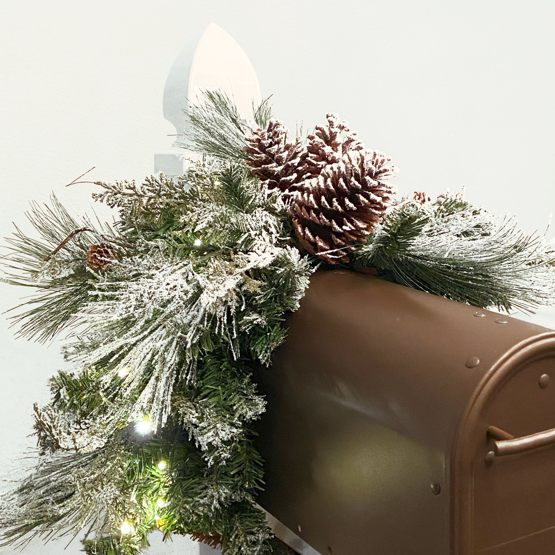 Softly flocked and down-swept, the Snowfall Pine mailbox swag will add an elegant touch to your front yard. It is accented with pinecones on a PVC mixed greenery base, so it is ideal for outdoor settings. Pre-strung with 30 soft white LED lights with a built-in timer function that runs 6 hours on, 18 hours off.