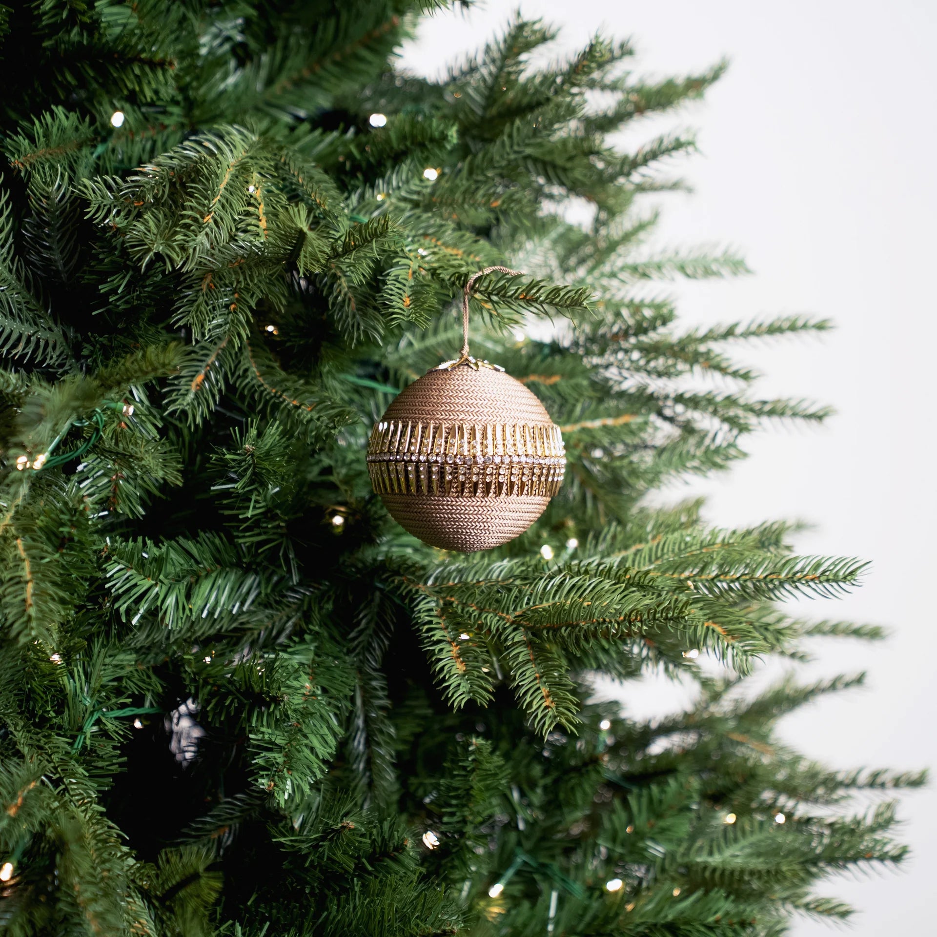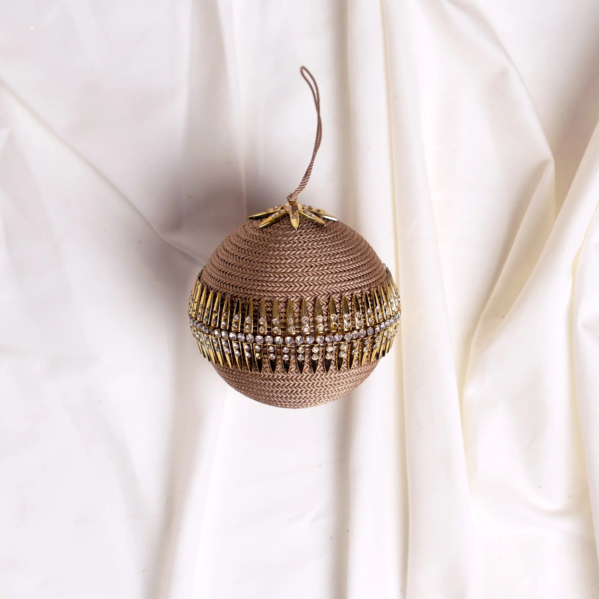 Add a bold, modern edge to your holiday décor with this 4" brown gold jeweled ball ornament, featuring a richly textured herringbone base accented by a dramatic band of gold spikes and clear crystals. Sleek and striking, it’s perfect for luxe, contemporary, or fashion-forward Christmas themes.