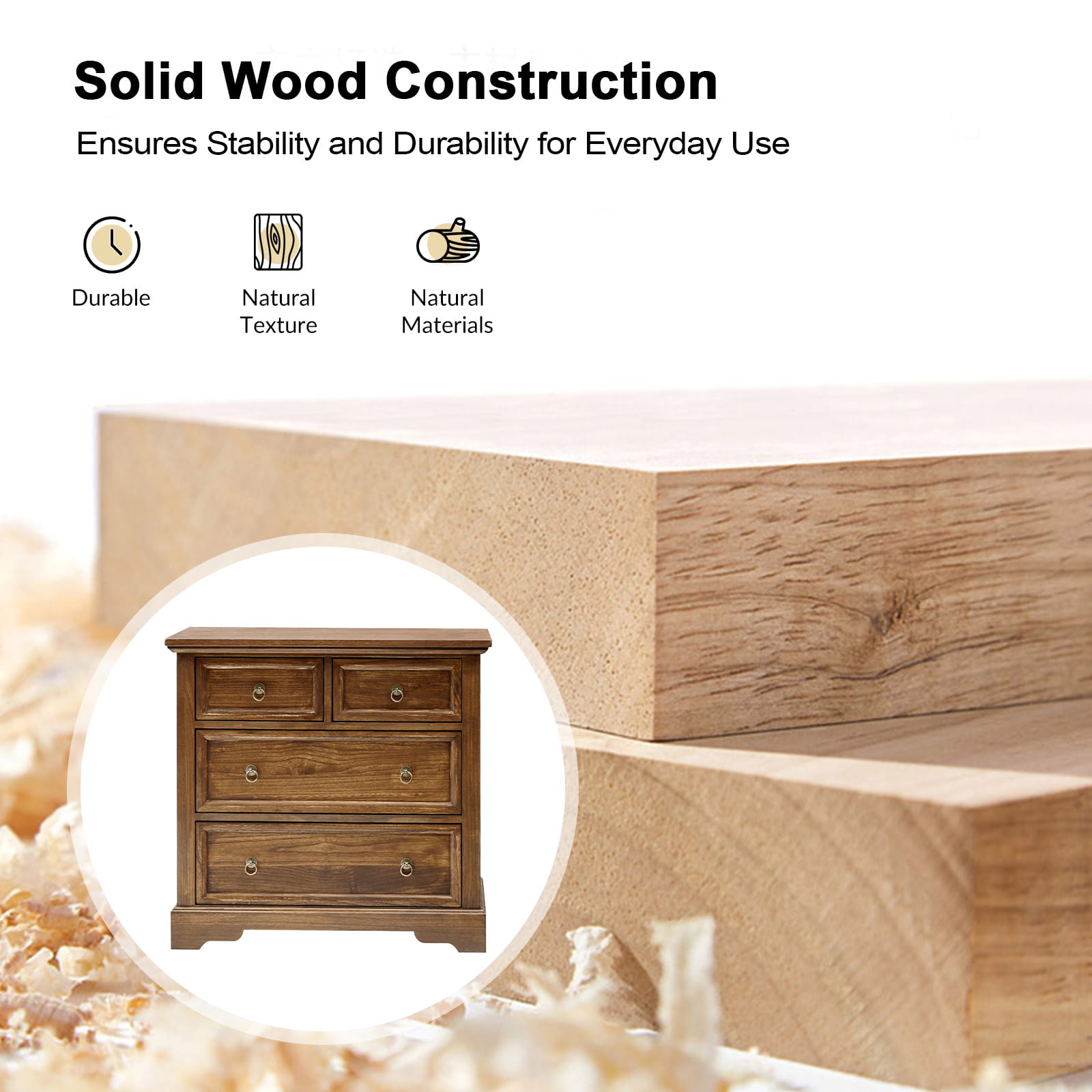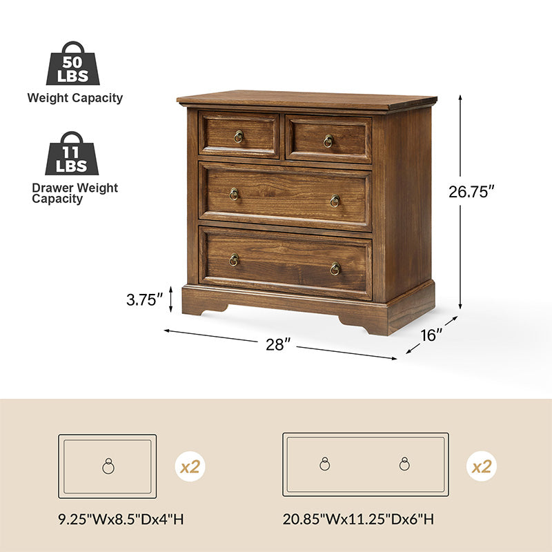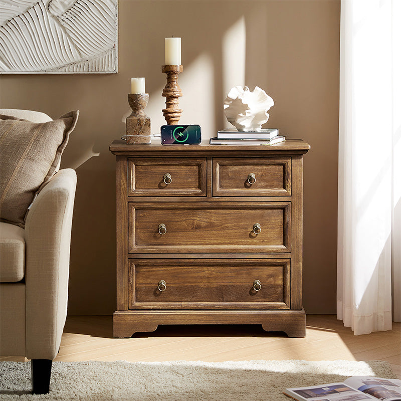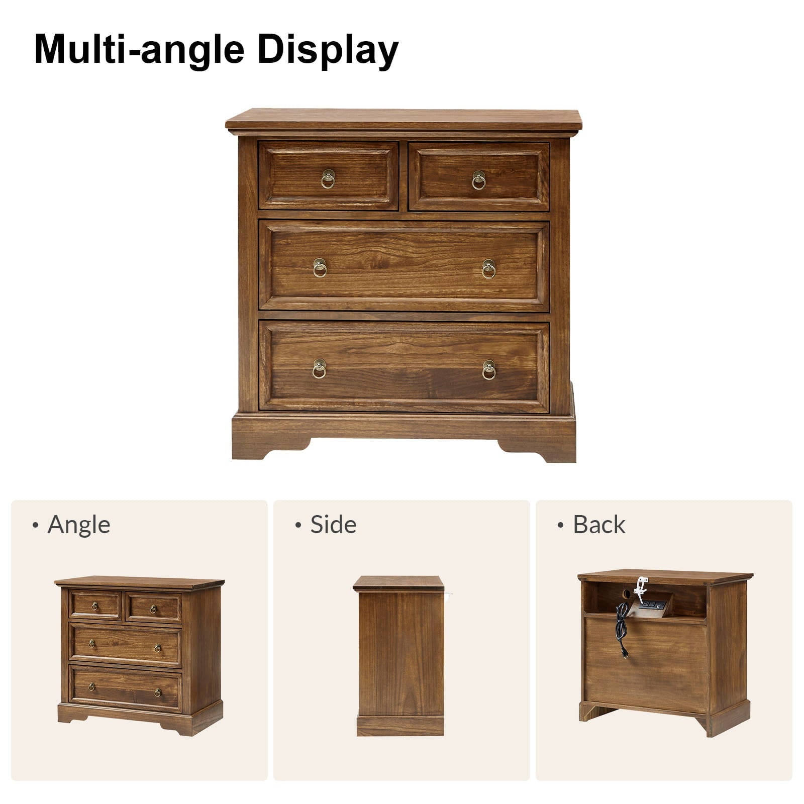 Introducing the solid wood nightstand, designed for both functionality and elegance. Crafted from solid paulownia wood, this nightstand features four spacious drawers, providing ample storage for all your bedside essentials. Each drawer is adorned with sleek metal knobs, adding a touch of sophistication to the design. Equipped with built-in power outlets and USB ports, it ensures easy access to charging your devices, making it suitable for modern lifestyles. The sturdy paulownia wood legs provide excellent support, enhancing the durability while maintaining a lightweight structure. This nightstand seamlessly combines classic craftsmanship with modern convenience, making it an ideal addition to any bedroom setting, whether you're aiming for a traditional, contemporary, or rustic look.