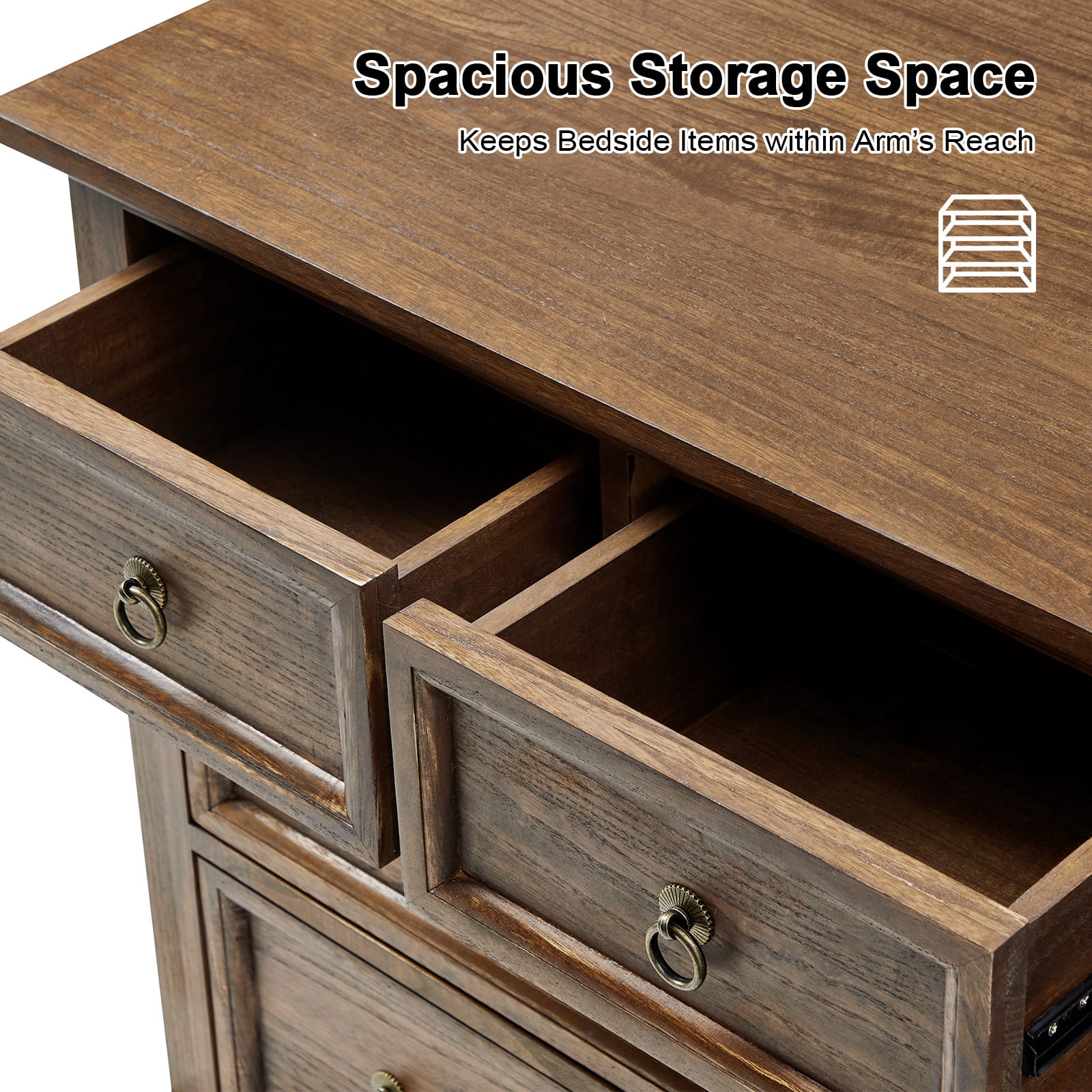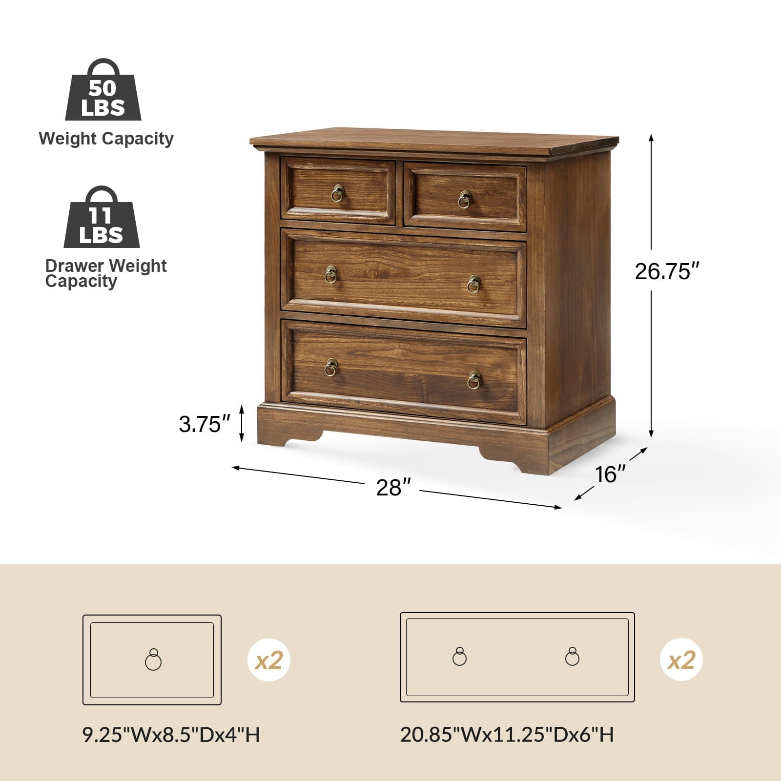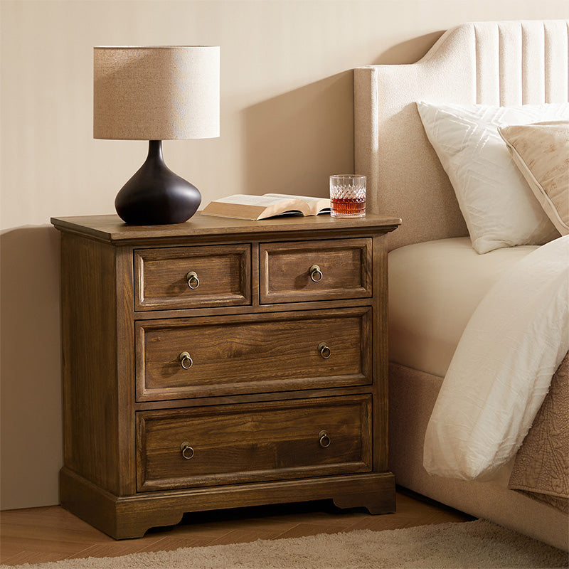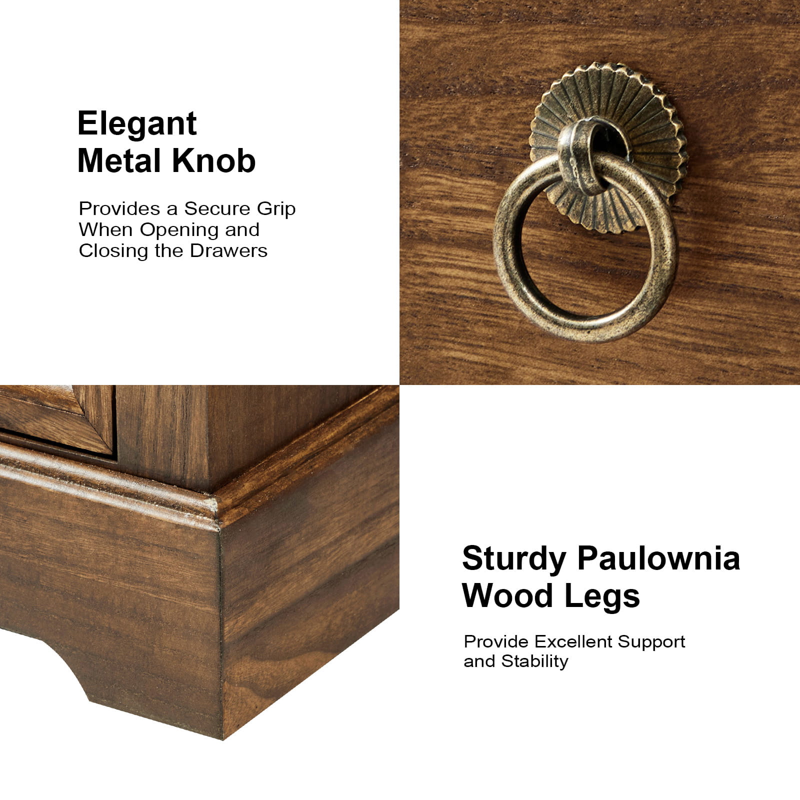 Introducing the solid wood nightstand, designed for both functionality and elegance. Crafted from solid paulownia wood, this nightstand features four spacious drawers, providing ample storage for all your bedside essentials. Each drawer is adorned with sleek metal knobs, adding a touch of sophistication to the design. Equipped with built-in power outlets and USB ports, it ensures easy access to charging your devices, making it suitable for modern lifestyles. The sturdy paulownia wood legs provide excellent support, enhancing the durability while maintaining a lightweight structure. This nightstand seamlessly combines classic craftsmanship with modern convenience, making it an ideal addition to any bedroom setting, whether you're aiming for a traditional, contemporary, or rustic look.