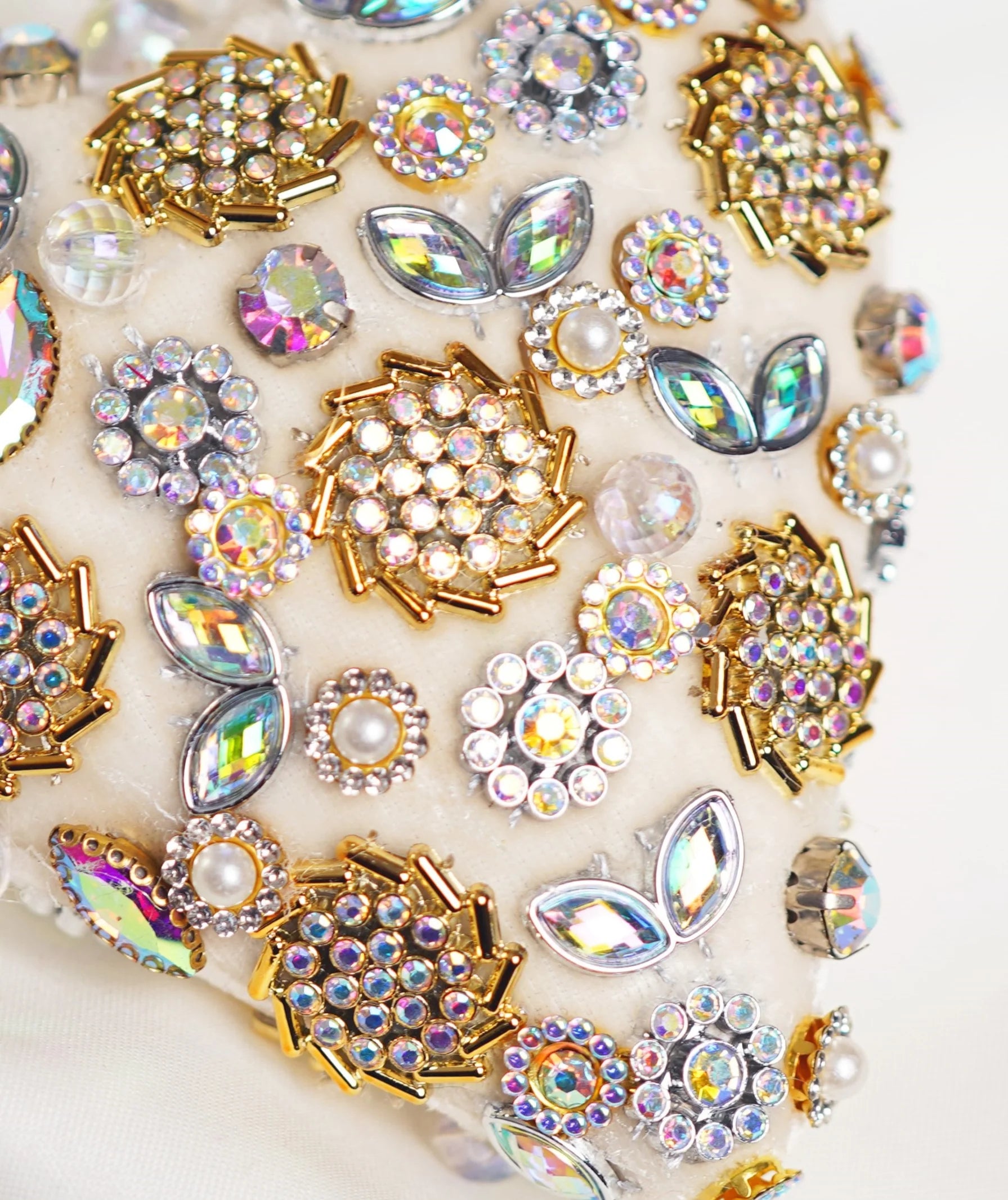 Celebrate elegance and romance with this 4" ivory jeweled heart ornament, adorned with a lavish mix of gold and silver floral motifs, sparkling crystals, and lustrous pearls. The soft ivory base enhances the brilliance of the intricate embellishments, making it a perfect addition to luxurious, vintage, or love-themed holiday décor.