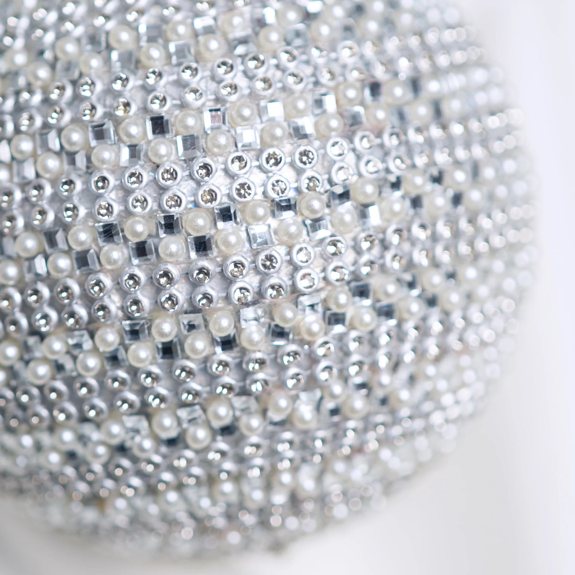 Capture the magic of winter with this 4" ivory snowy pearl ball ornament, fully encrusted with a dazzling mix of pearls, silver beads, and crystal accents. Its frosted, textured finish evokes a snow-kissed elegance, perfect for winter wonderland, icy glam, or classic white Christmas themes.