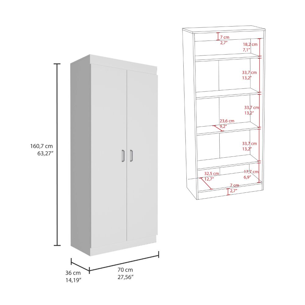 The Varese Pantry Cabinet is the perfect fit for any kitchen. Can provide functionality in a bedroom, living room, office, or any other room that would need a large storage unit. With five internal shelves(9,9'' H X 13,2''H X 13,2''W X 13,2''H X 6,9''H) that sit neatly behind two sleek doors. All metal doorknobs and hinges provide an all-around better quality product—functionality and style working in perfect harmony. Designed with elegant white manufactured wood.