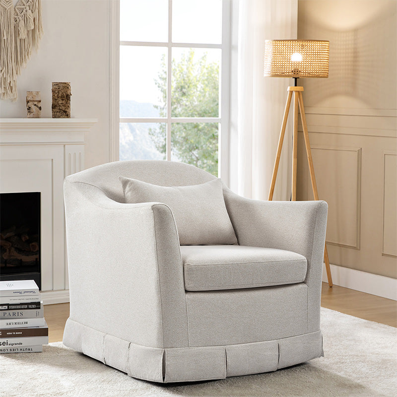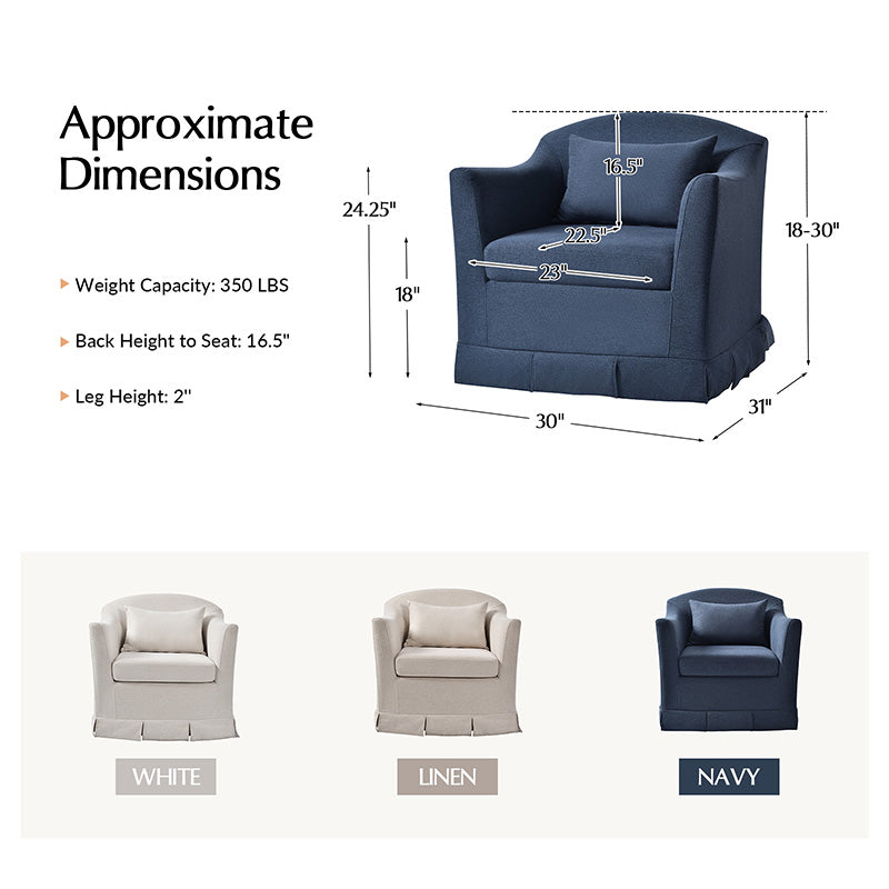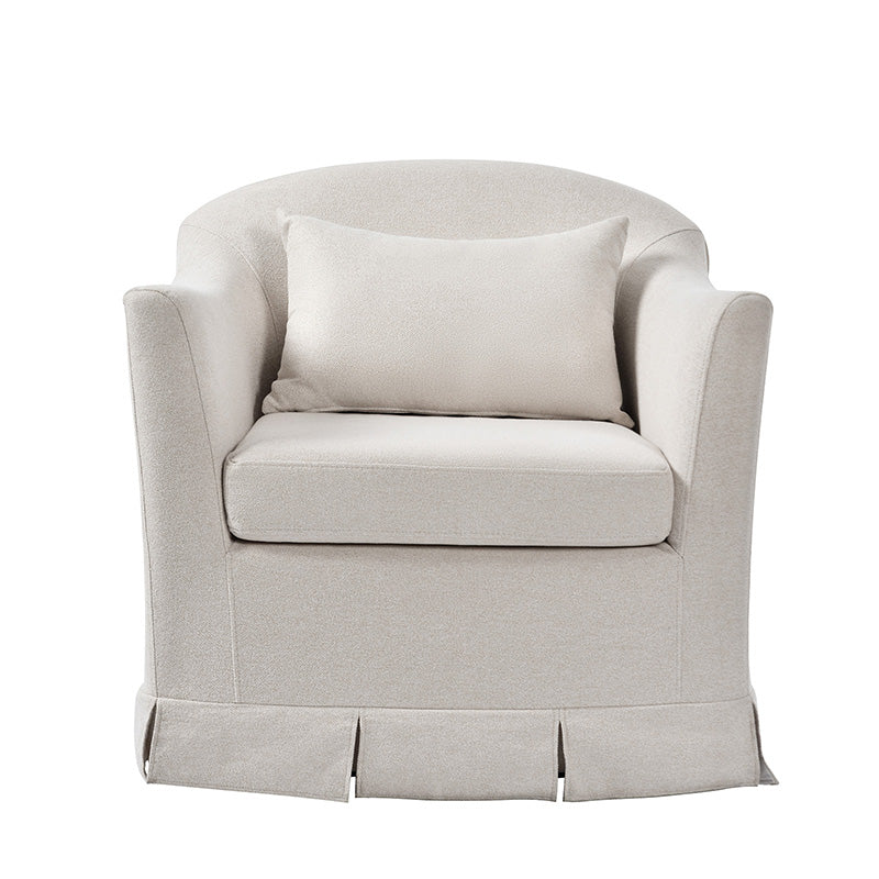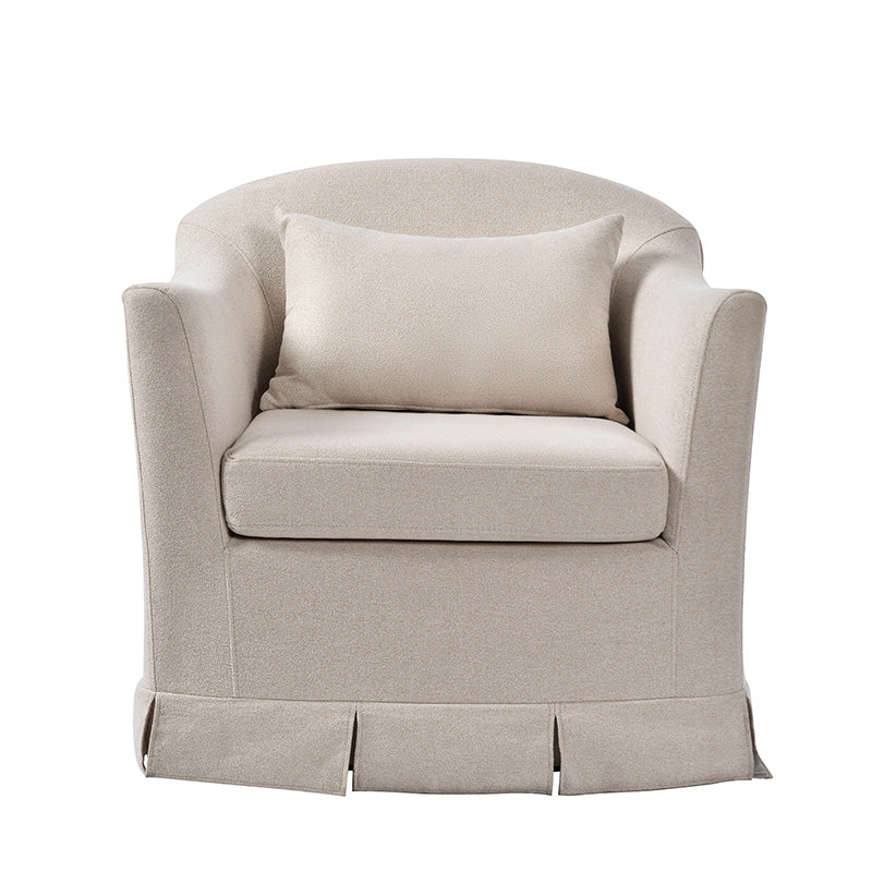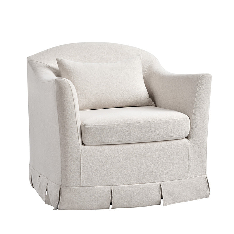 Enhance your living space with this modern slipcovered armchair. Its graceful barrel back embraces you in comfort, creating a cozy spot for relaxation or conversation. The 360-degree swivel base allows for effortless movement, making it suitable for working, socializing, or enjoying your favorite views without leaving your seat. This armchair features a removable slipcover, making cleaning and maintenance a breeze. The fabric is durable yet soft to the touch, ensuring comfort while offering the convenience of easy care. The box-pleated skirt with delicate ruffle details adds a touch of sophistication, bringing a subtle charm to modern interiors. Filled with quality cushioning, it provides support for extended sitting, making it ideal for reading, lounging, or simply unwinding after a long day. Whether placed in a living room, bedroom, or study, this slipcovered swivel armchair offers a perfect mix of style and function.