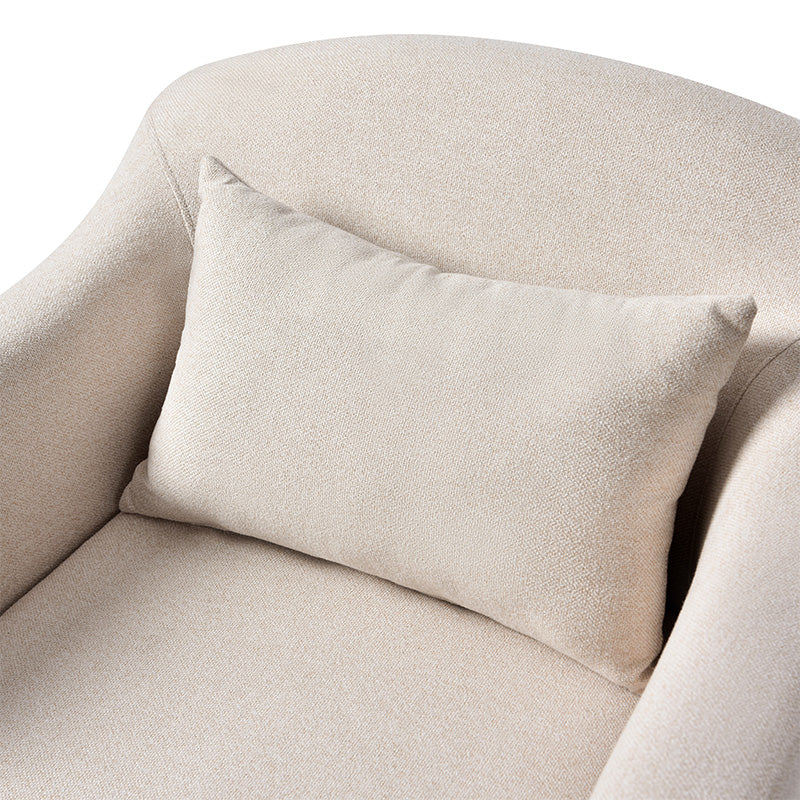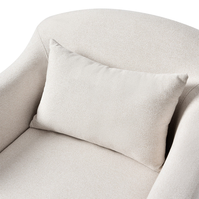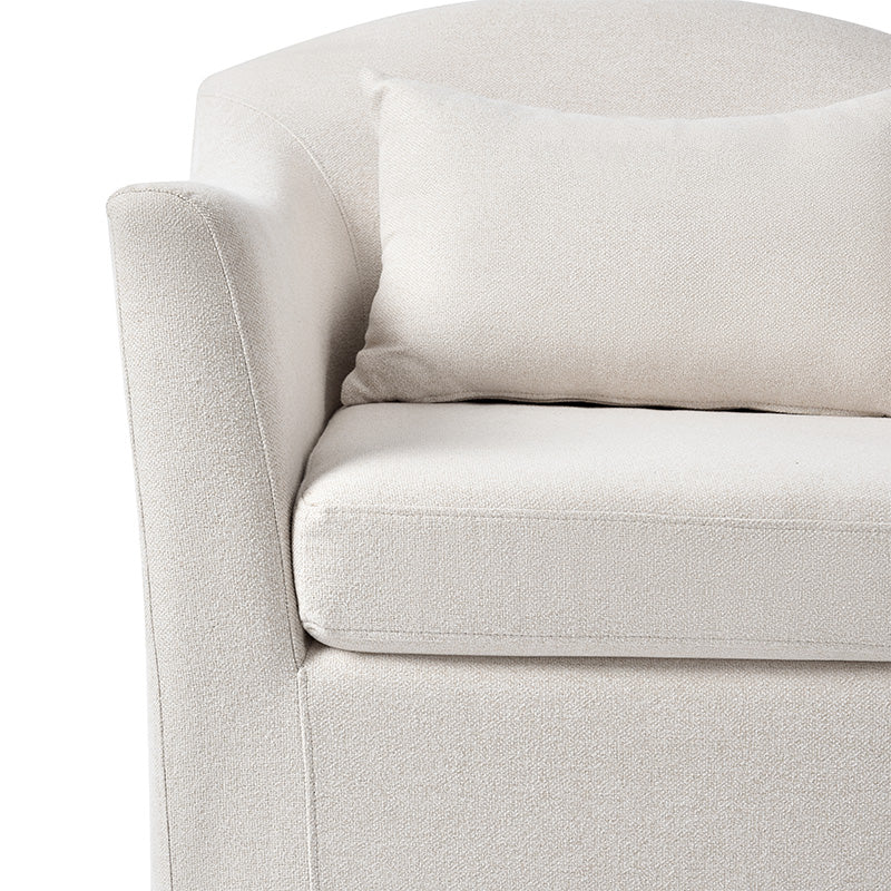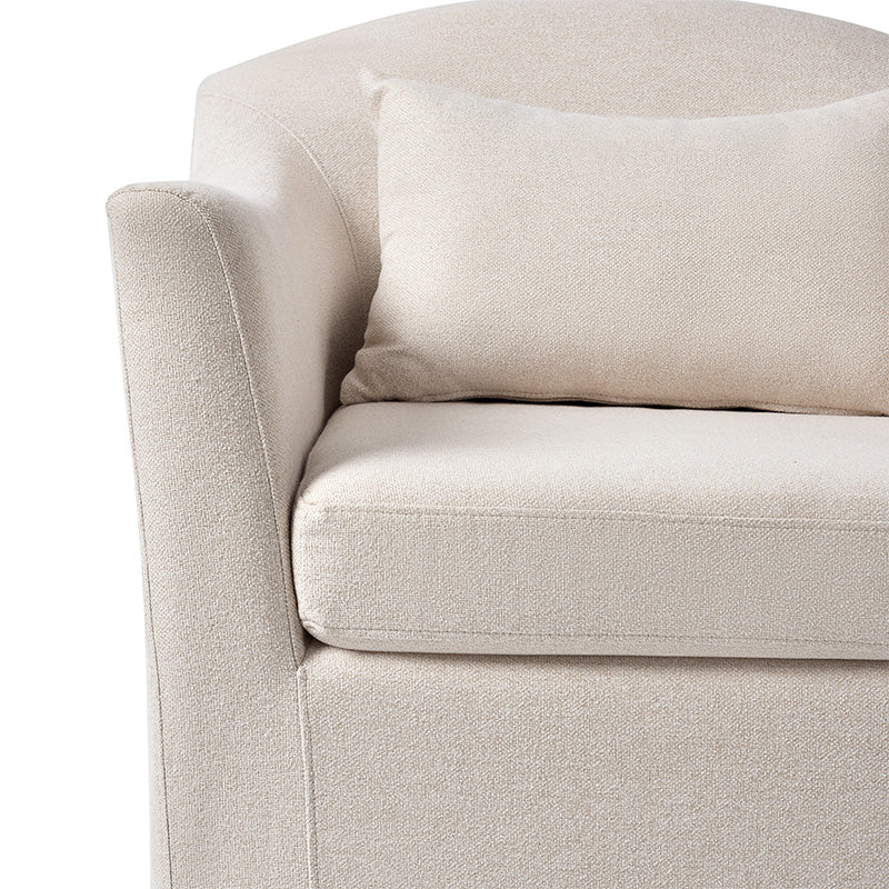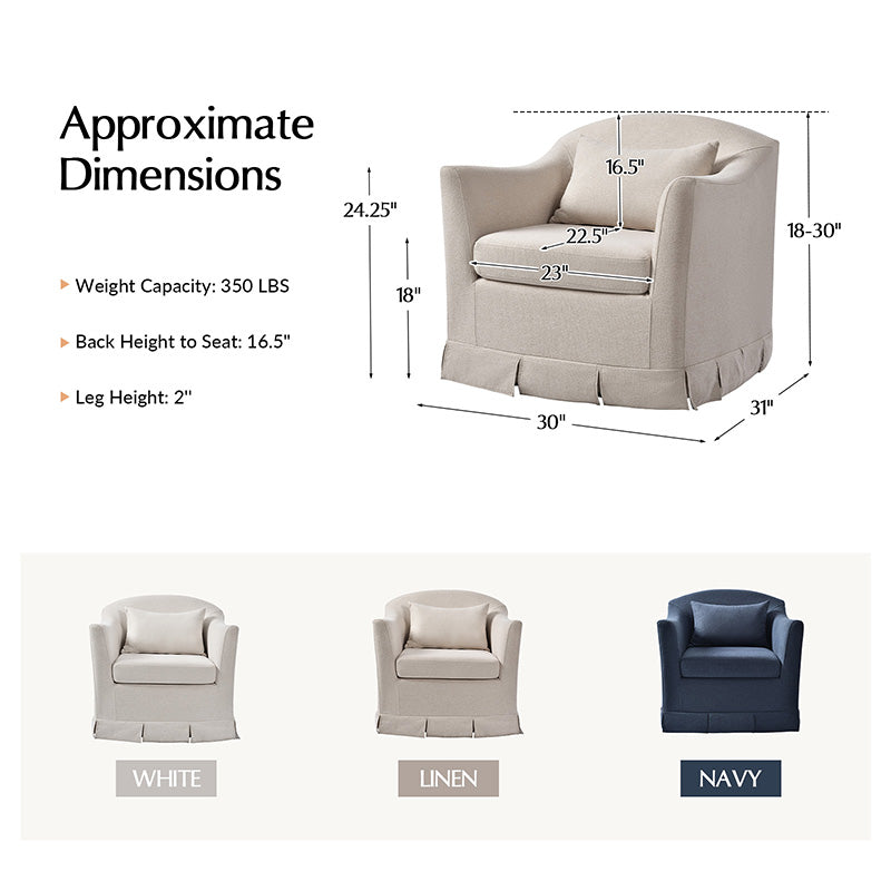 Enhance your living space with this modern slipcovered armchair. Its graceful barrel back embraces you in comfort, creating a cozy spot for relaxation or conversation. The 360-degree swivel base allows for effortless movement, making it suitable for working, socializing, or enjoying your favorite views without leaving your seat. This armchair features a removable slipcover, making cleaning and maintenance a breeze. The fabric is durable yet soft to the touch, ensuring comfort while offering the convenience of easy care. The box-pleated skirt with delicate ruffle details adds a touch of sophistication, bringing a subtle charm to modern interiors. Filled with quality cushioning, it provides support for extended sitting, making it ideal for reading, lounging, or simply unwinding after a long day. Whether placed in a living room, bedroom, or study, this slipcovered swivel armchair offers a perfect mix of style and function.