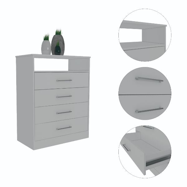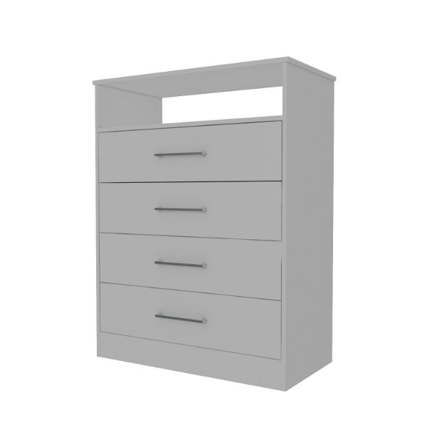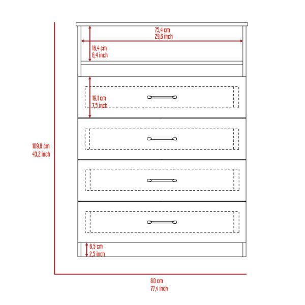 The Continental four-drawer dresser offers a timeless modern look with a beautiful finish and plenty of different storage options available. In its features, the top base also functions as a TV stand for up to a 47" flat screen with its matching base, with 4 drawers 7.5 Height x 29.6 Width x 14.2Depth this dresser will cover any storage needs you may have. An added feature is the open top shelf, always nice when you can keep your most used items like books, headphones, or your cell phone handy. At 43" tall and with all metal hardware and handles, this is a great addition to your bedroom. Designed with elegant Black Wengue, White manufactured wood.