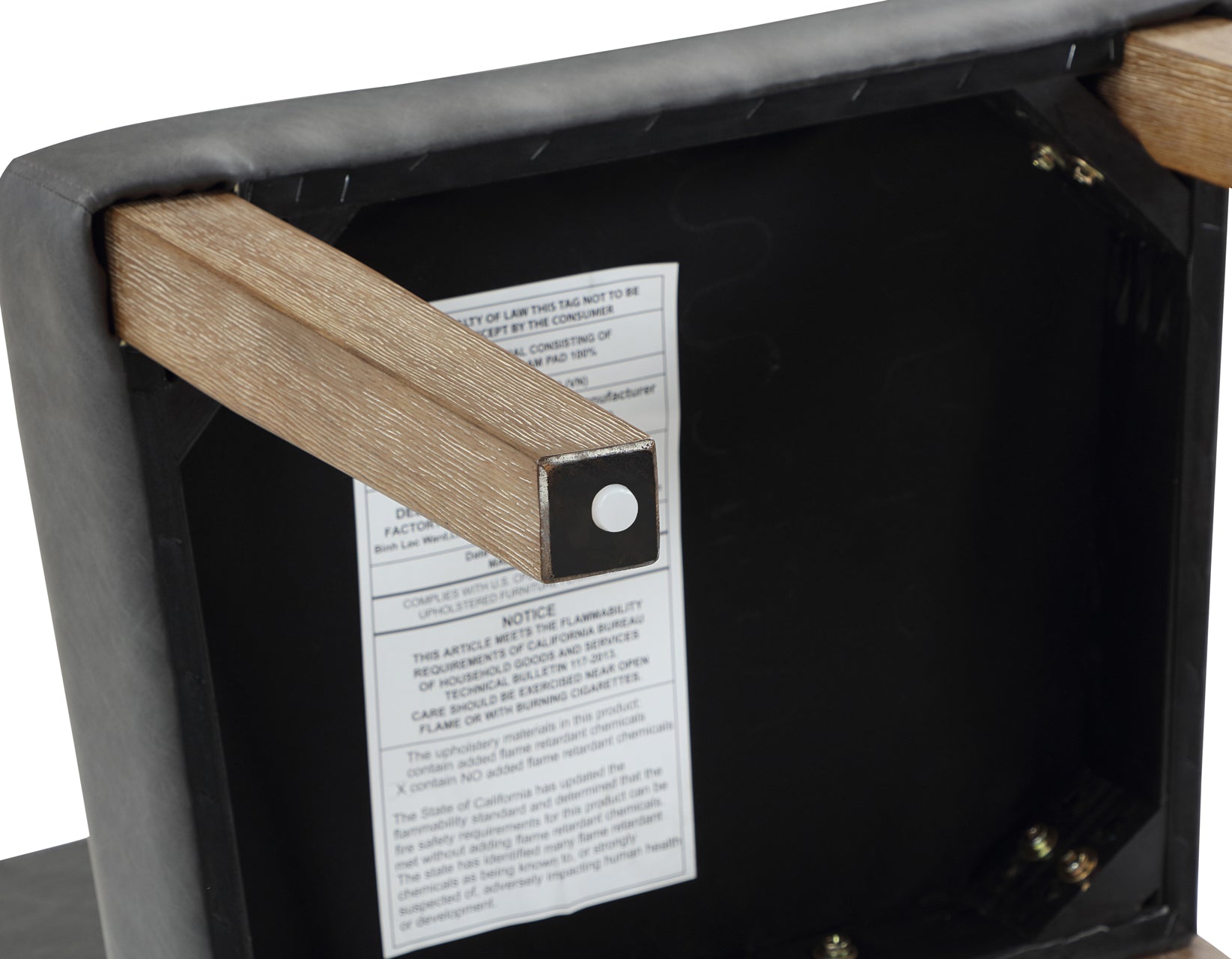 - Expertly crafted of Asian hardwood solids, 1.1 density foam and gray vegan leather cover