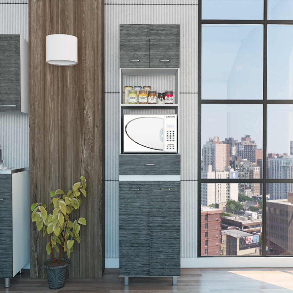 The Caribe Microwave Cabinet, this pantry has a lot of features that will cover all the extra storage needs in your kitchen and a good microwave cabinet. It features a bottom two door Cabinet for big kitchen items like pots and pans with an interior shelf, Top Two door cabinet (13.1-inch High), a spacious top surface to place a microwave or other appliances, a middle shelf for easy access to frequently used items such as condiments, jars, and small items and handy middle drawer to store silverware and other items. Designed with elegant Smokey Oak -White, White manufactured wood.