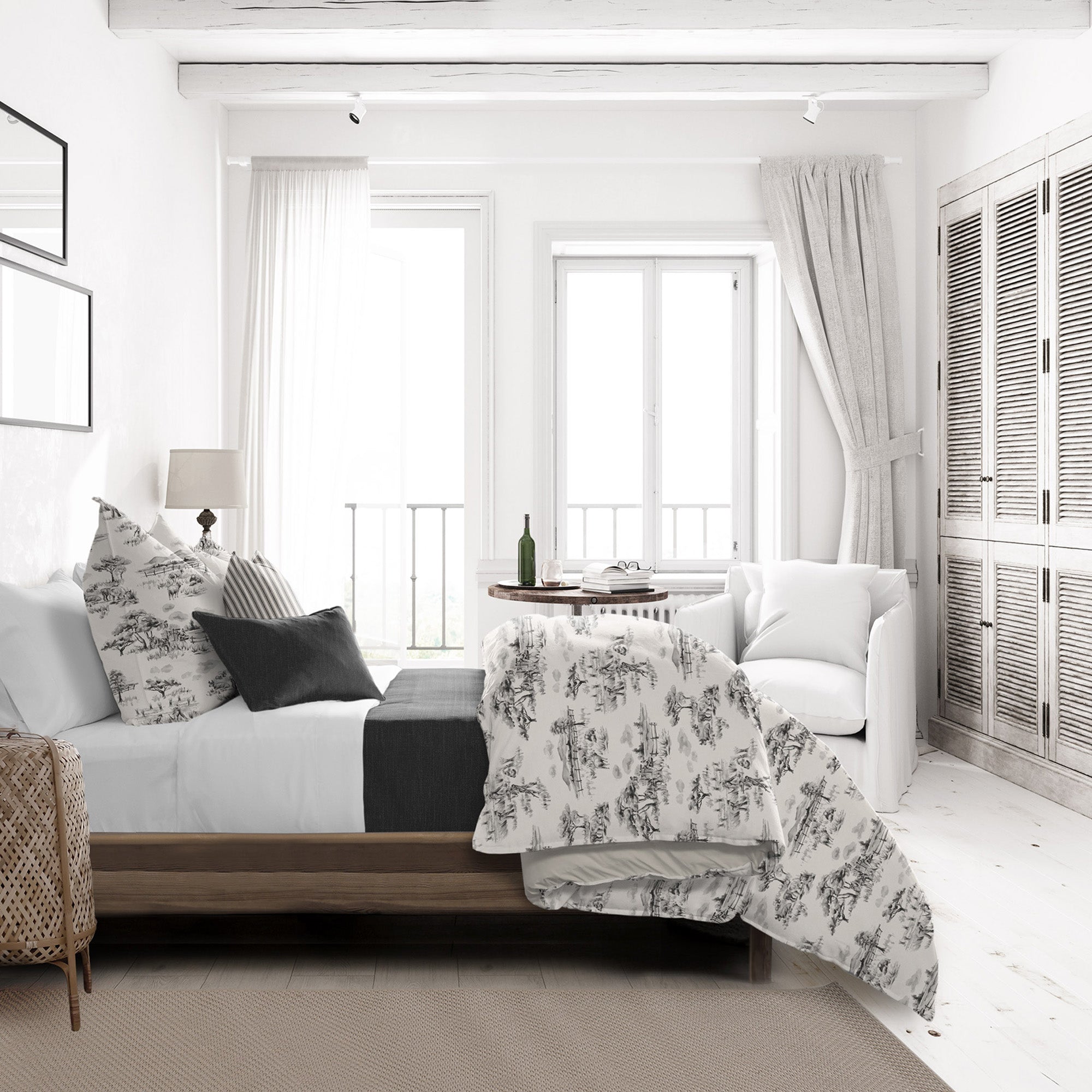 Auclair's French-inspired toile pattern is a depiction of a simple French countryside in shades of classic gray and cream. Toile is a timeless design relevant today and sure to please for years to come.