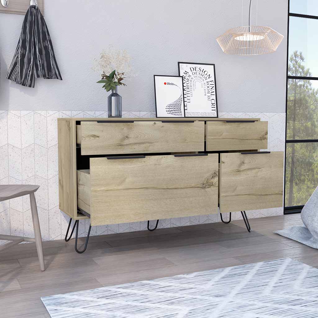 Augusta Double Dresser, With its four drawers (12,9’’H X 6,6" H X 28,1’’W)( 12,9’’H X 6,6’’H X 16,8’’w) and hairpin legs, the Augusta Double Dresser is the perfect way to add some extra storage to your room while giving it a sleek contemporary edge. The top of the dresser is ideal for displaying decorative items. So if you're looking for a stylish and practical way to organize your belongings, look no further than the Augusta Double Dresser. Designed with elegant light oak manufactured wood finish.
