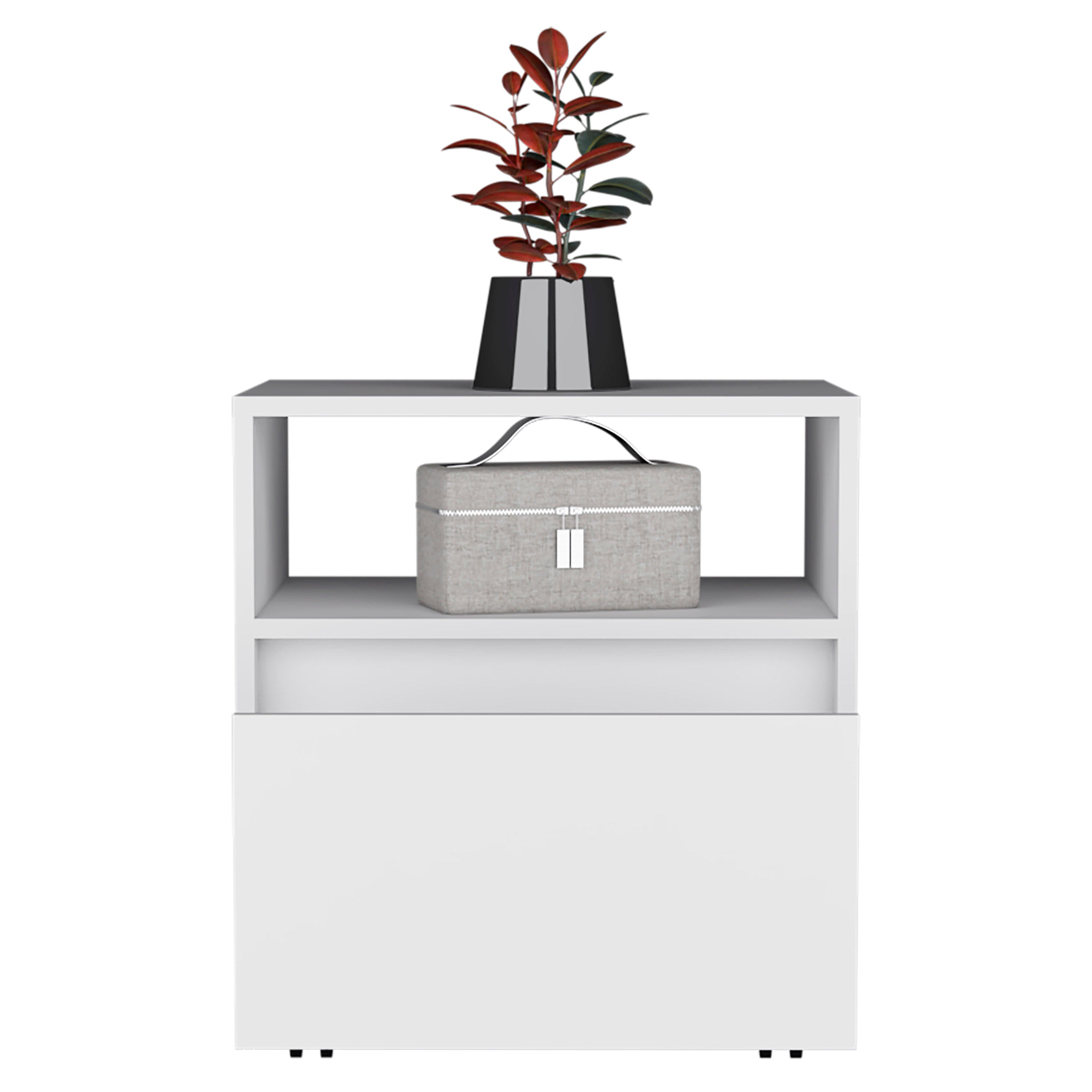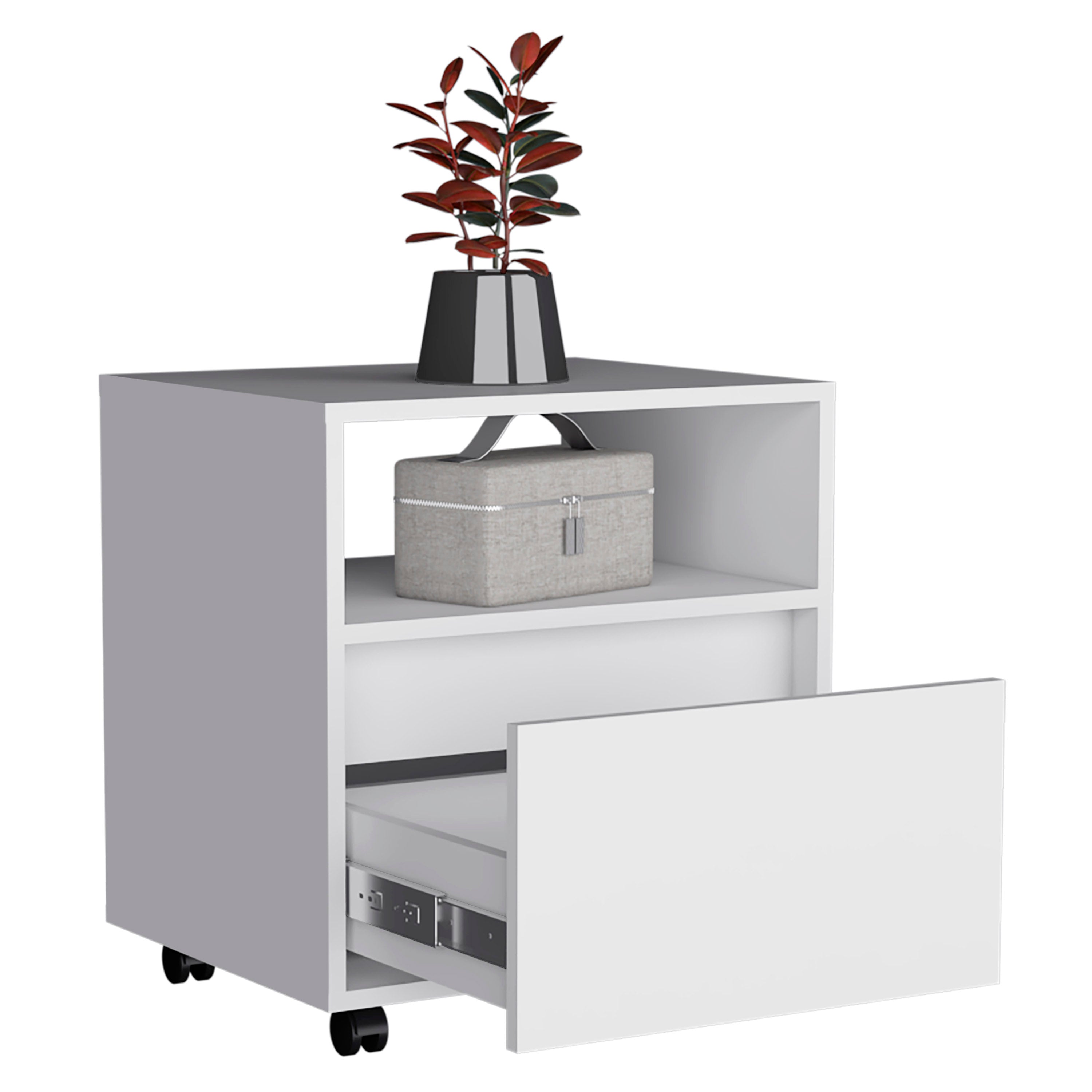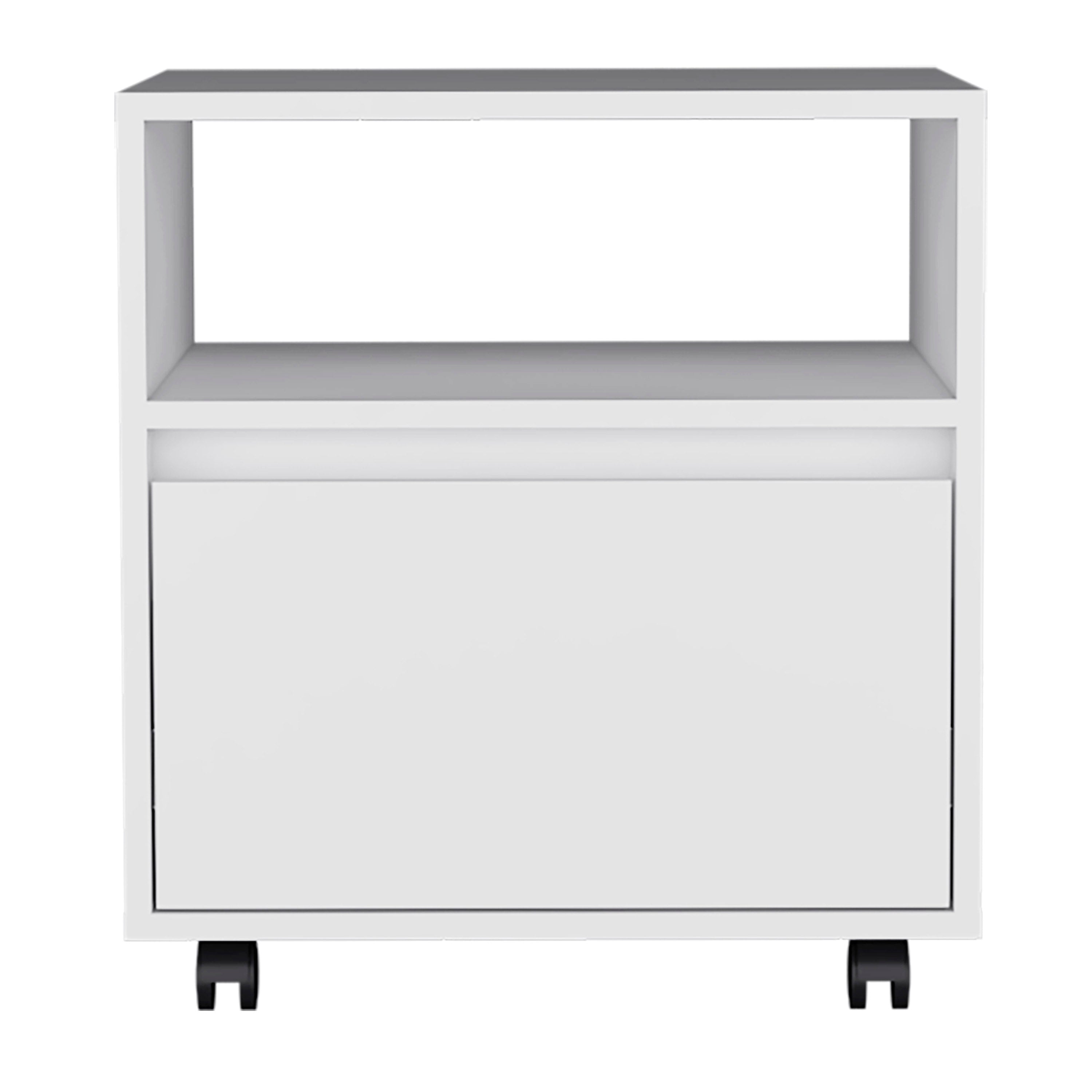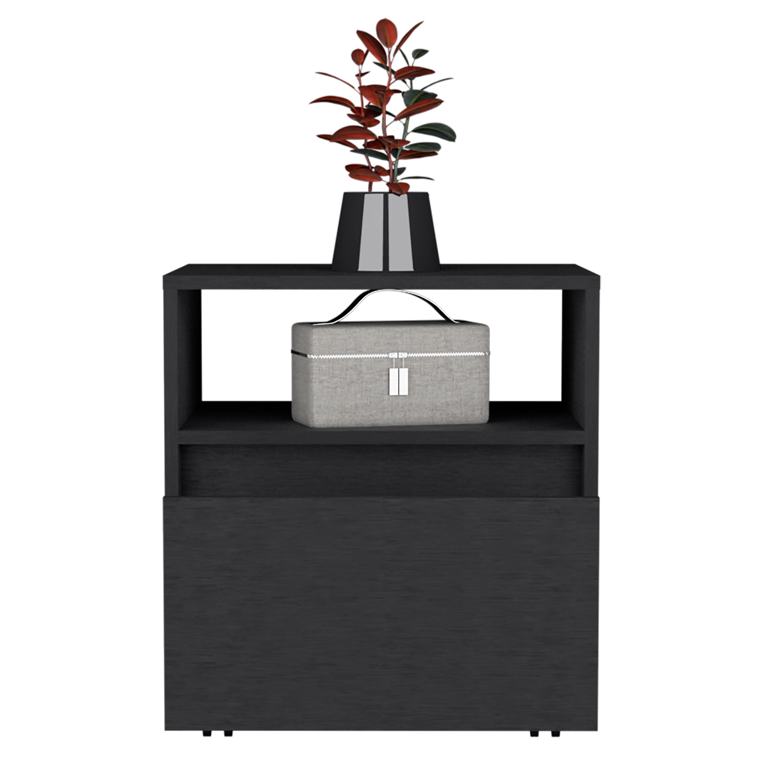 Do you want a nightstand that is stylish and functional? The Austin Nightstand has you covered! It's elegantly designed with a sleek modern look and offers plenty of functionality. Thanks to its casters, it's easy to move around, so you can place it wherever you need it in your bedroom. The spacious drawer (15,5"W X 4,3"H X 13,2"D) is perfect for keeping all your things tidy, and the open shelf provides storage for books or magazines. Plus, the wide top surface offers plenty of space for your essentials. Designed with an elegant black manufactured wood finish.