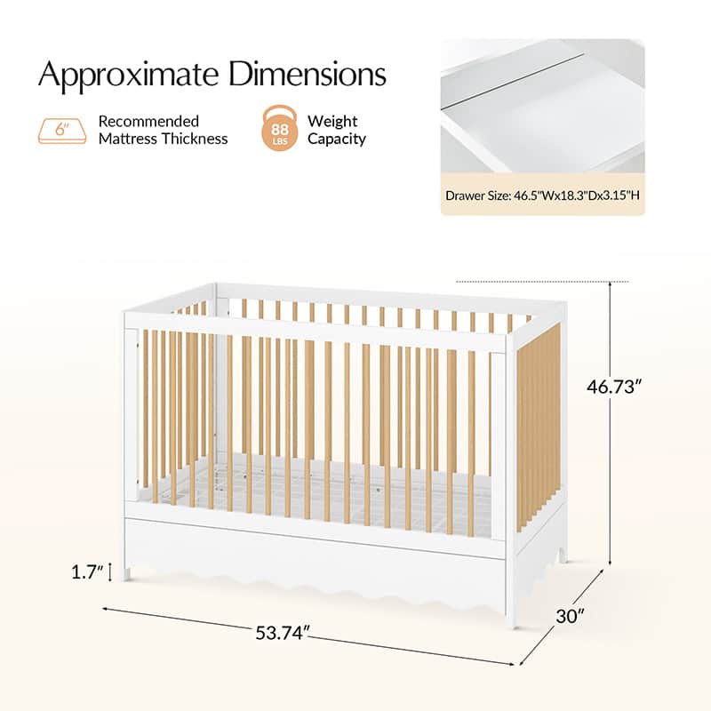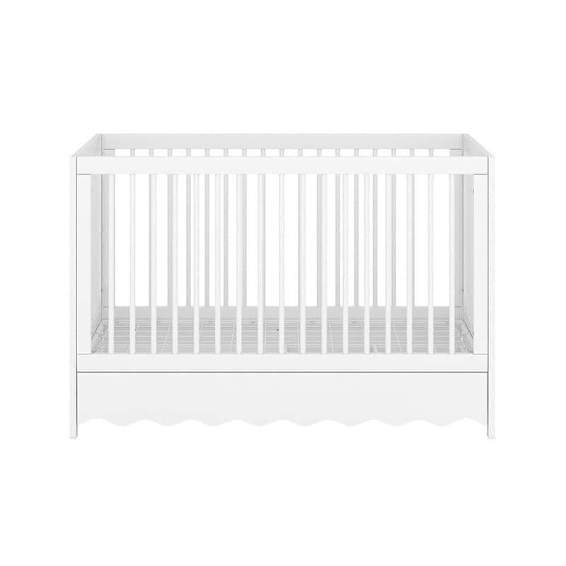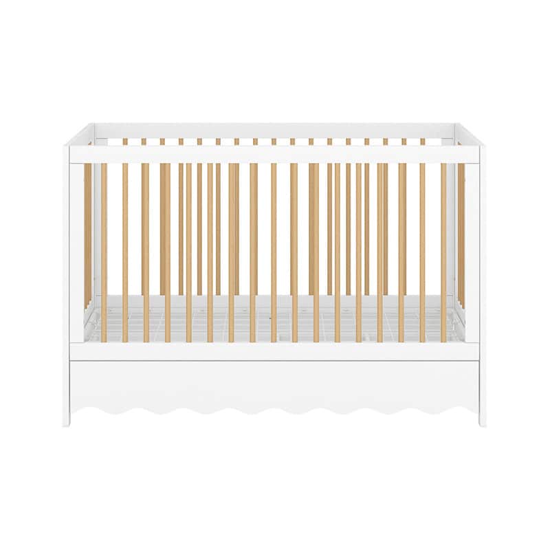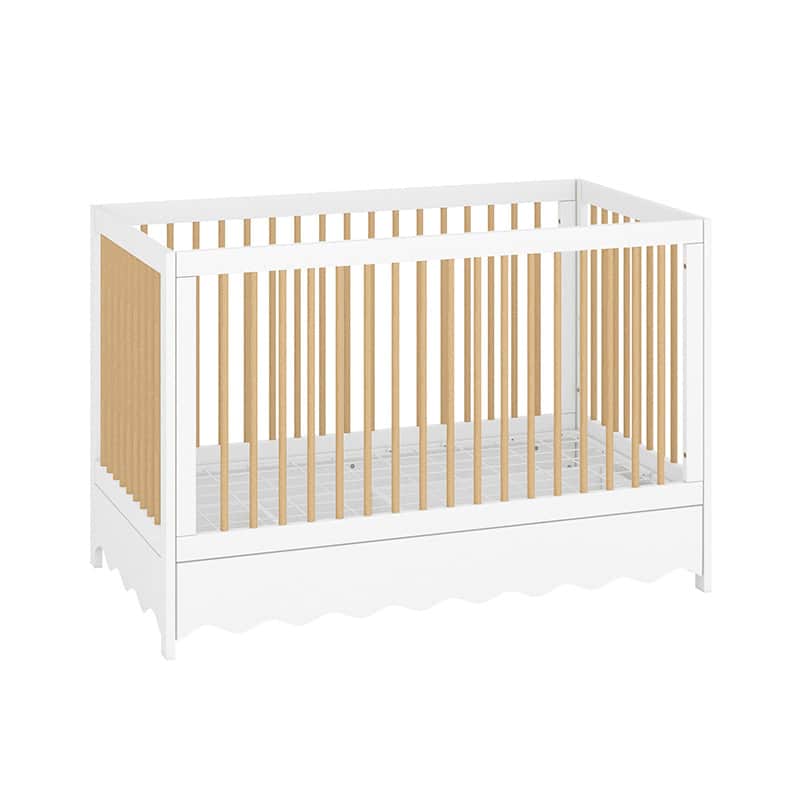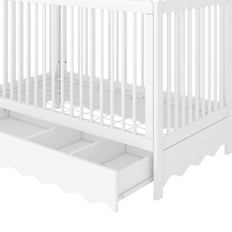 This modern baby cot combines style and functionality, featuring a divisional storage drawer for easy organization. It can be converted into a toddler bed with the included conversion accessories, making it versatile as your child grows. The cot offers three adjustable bedboard height settings, allowing for customization as your baby develops. Its design includes a charming wave pattern decoration and rounded corners for safety. The bed frame and legs are made of solid rubber wood, ensuring both sturdiness and elegance. suitable for a contemporary nursery, this cot blends practicality with aesthetic appeal.