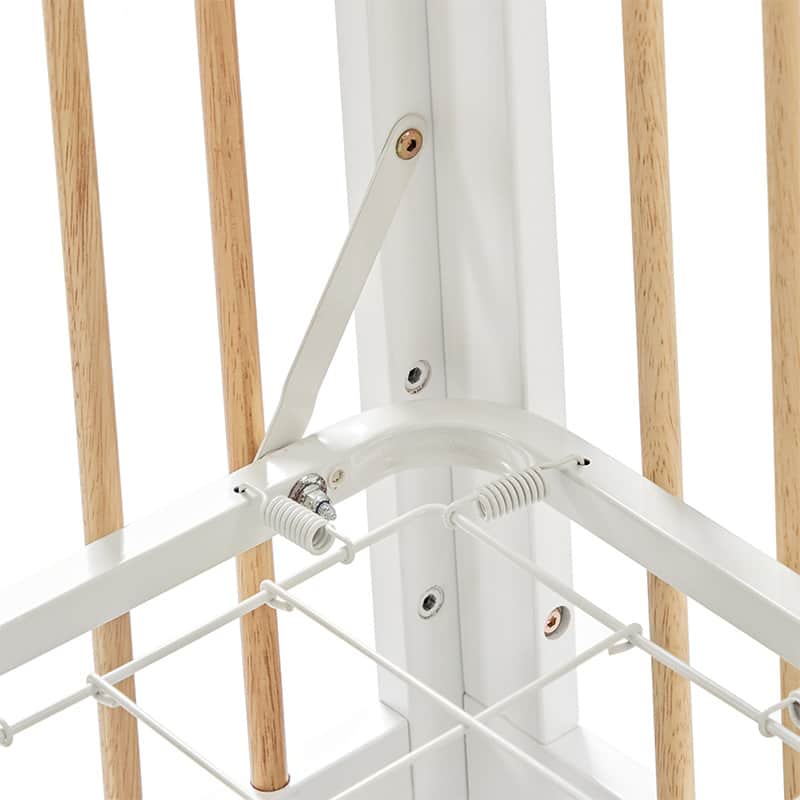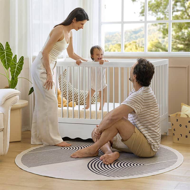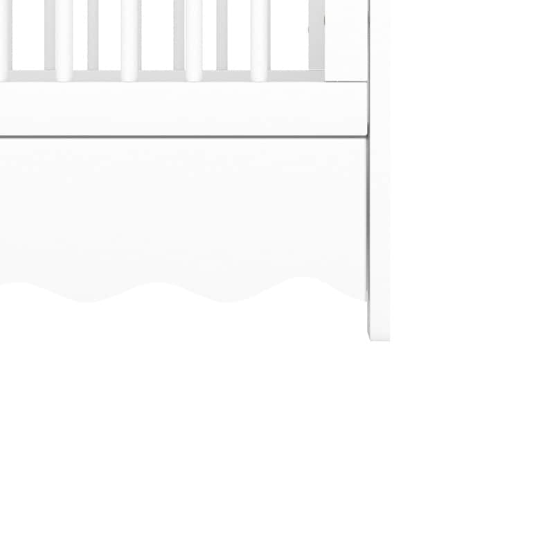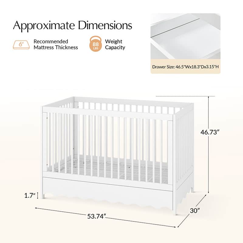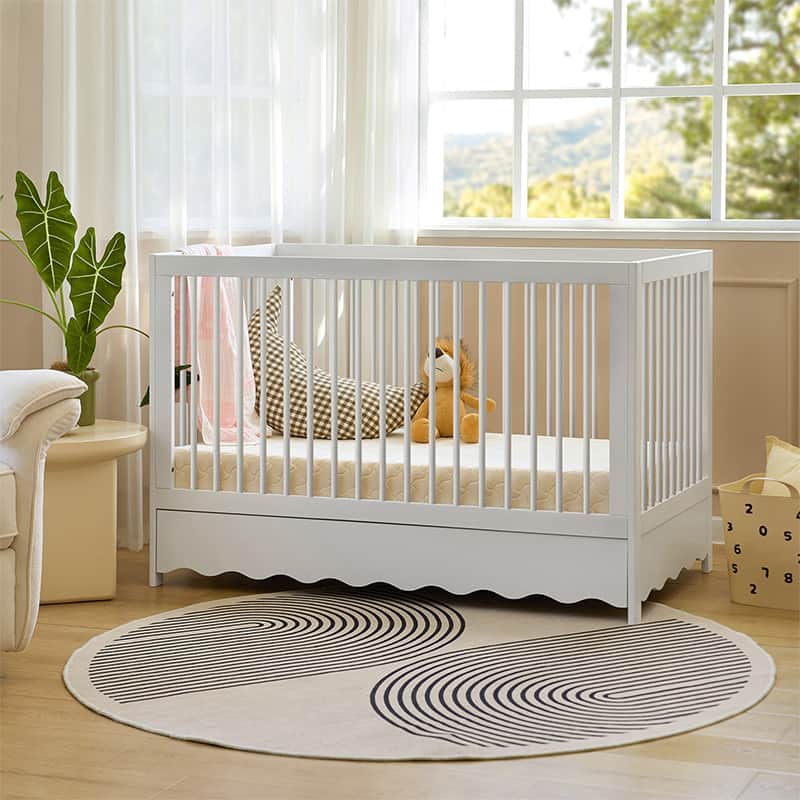 This modern baby cot combines style and functionality, featuring a divisional storage drawer for easy organization. It can be converted into a toddler bed with the included conversion accessories, making it versatile as your child grows. The cot offers three adjustable bedboard height settings, allowing for customization as your baby develops. Its design includes a charming wave pattern decoration and rounded corners for safety. The bed frame and legs are made of solid rubber wood, ensuring both sturdiness and elegance. suitable for a contemporary nursery, this cot blends practicality with aesthetic appeal.
