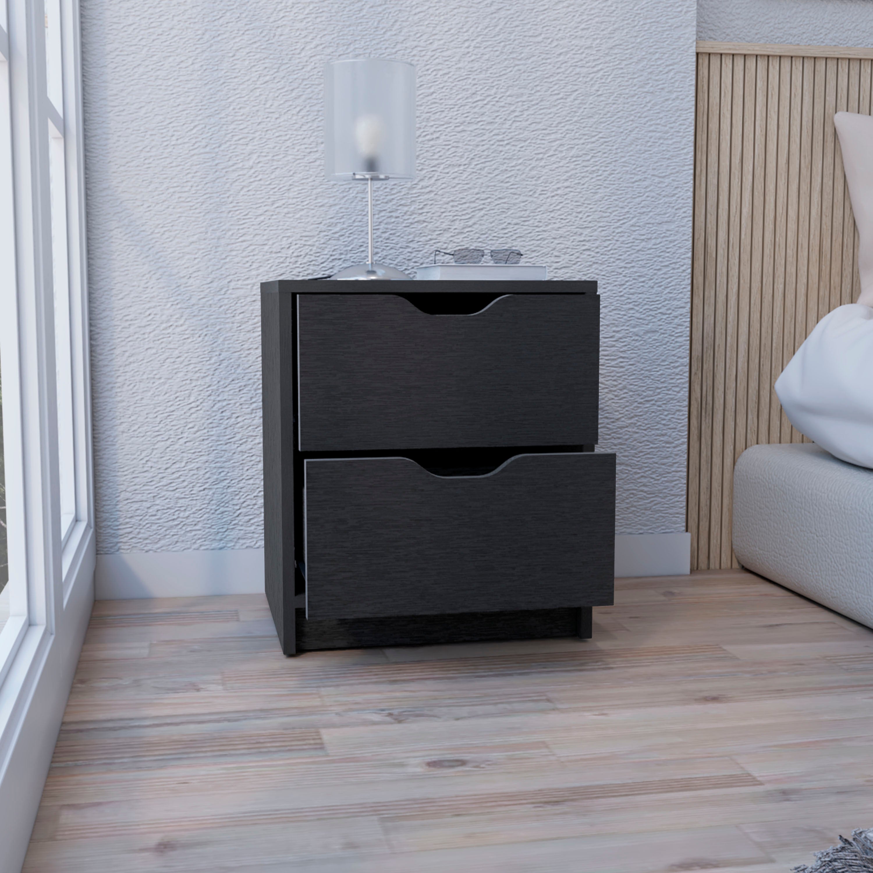 Have fun designing and decorating your room with the Basel 2 Drawers Nightstand! This beautiful piece of furniture offers clever, sleek modern styling so you can enjoy extra storage. The two spacious drawers' convenient pull-out system allows easy access to clothes, books, personal items, or other essentials. Plus, there's plenty of room on the top surface for any favorite decor or simply as a place for your cell phone or remote control. Add a stylish yet versatile touch and charm to your room, save time, and add the Basel 2 Drawers Nightstand to your home today!