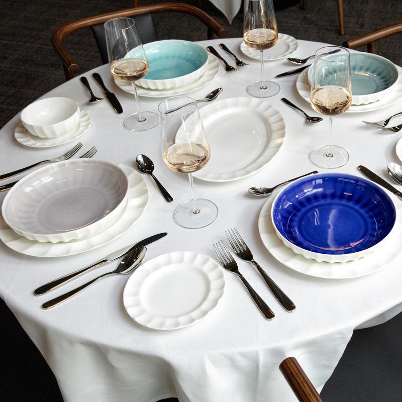 With elegant scalloped shapes and translucent brushed colors, the Parasol collection lives in unique space between both traditional and modern design. This strong contrast is clean and well defined – making a powerful statement to any tabletop presentation.