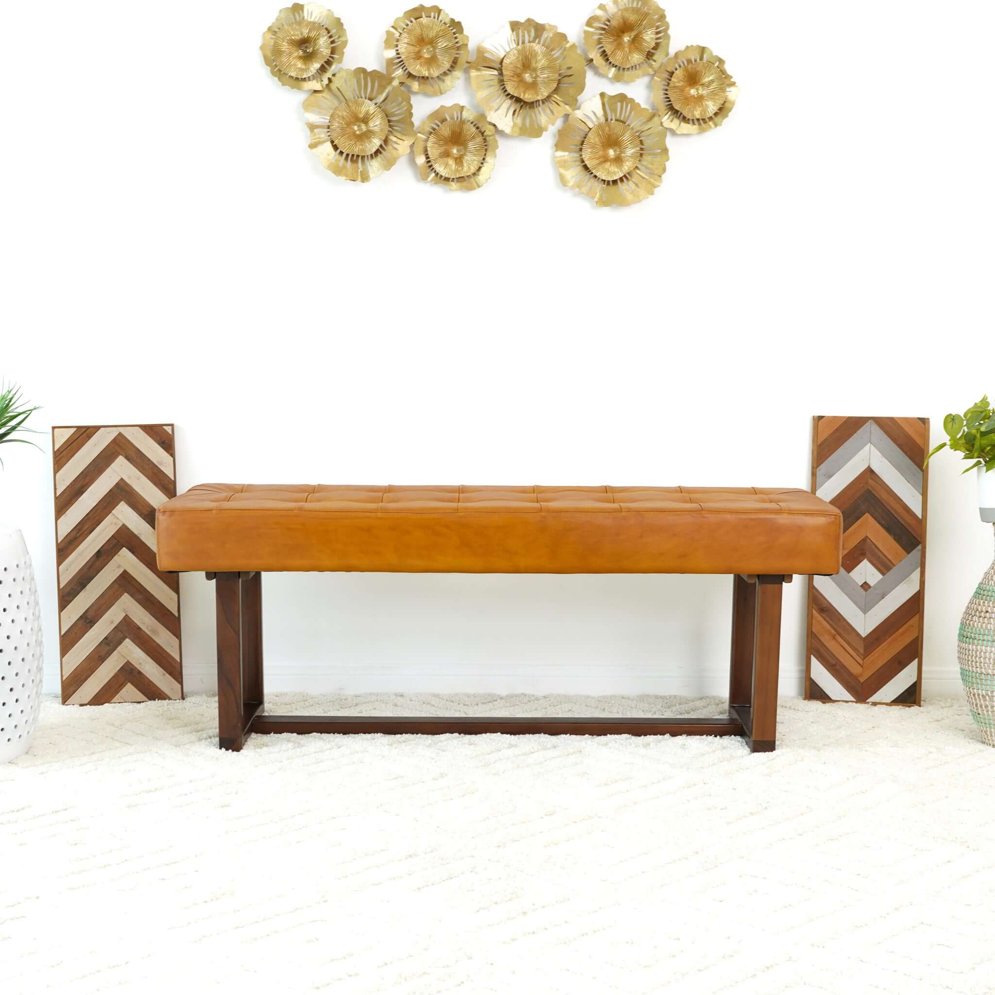 A Mid-Century modern update to a retro classic, the Espresso upholstered bench is gorgeously adaptable. Its seat cushion is crafted of high-quality genuine leather and filled with high-density foam providing comfortable sitting for up to 2. This Tan accent bench is constructed of a sturdy solid wood frame and boasts tapered solid wood legs in a rich finish to convey a refined aesthetic with a hint of mid-century flair. Can be cleaned with a non-abrasive cleaning solution followed by a quick microfiber cloth. Removable legs allow for simple delivery for tight spaces. Available in a variety of timeless colors, you're sure to find something that matches your decor. PARTIAL ASSEMBLY REQUIRED