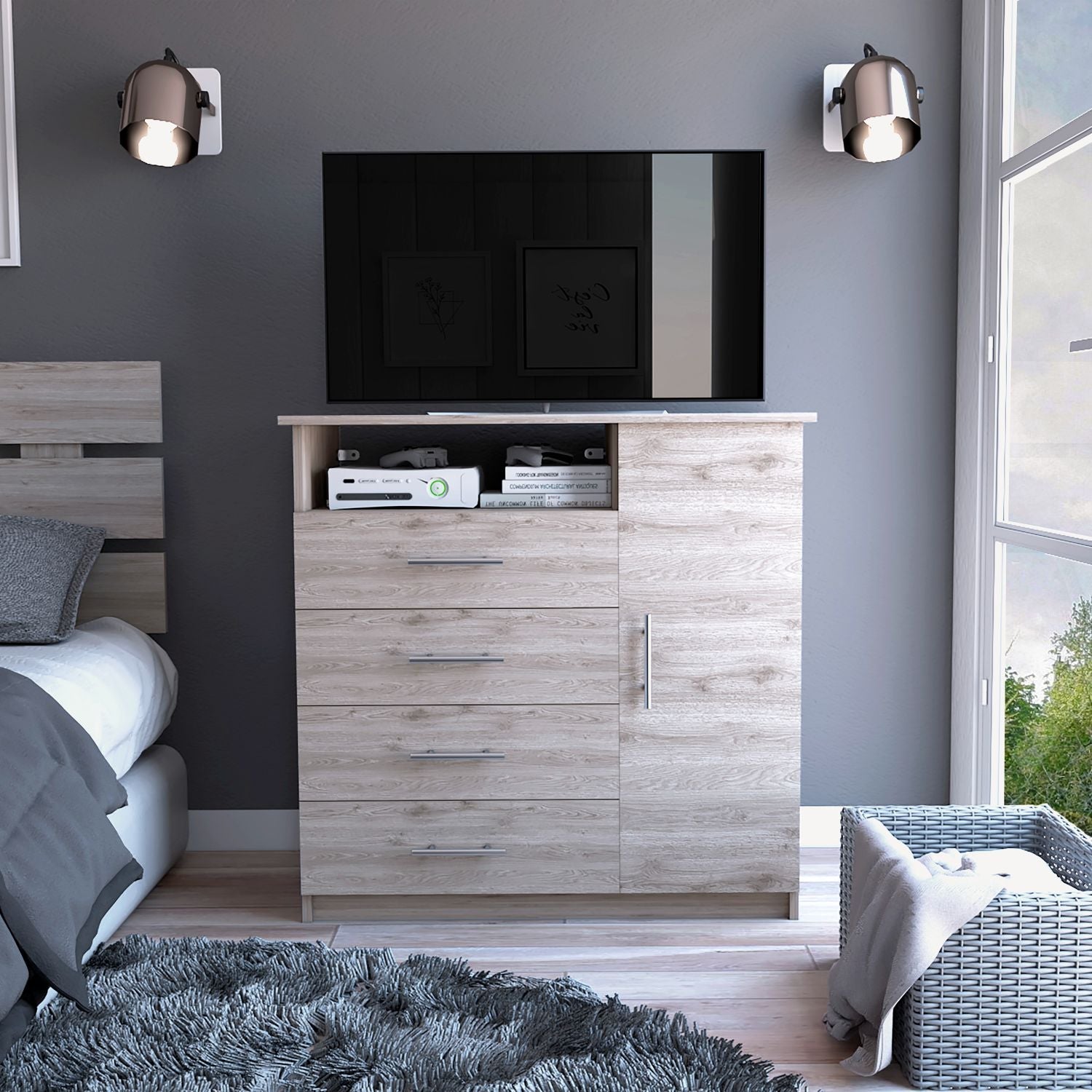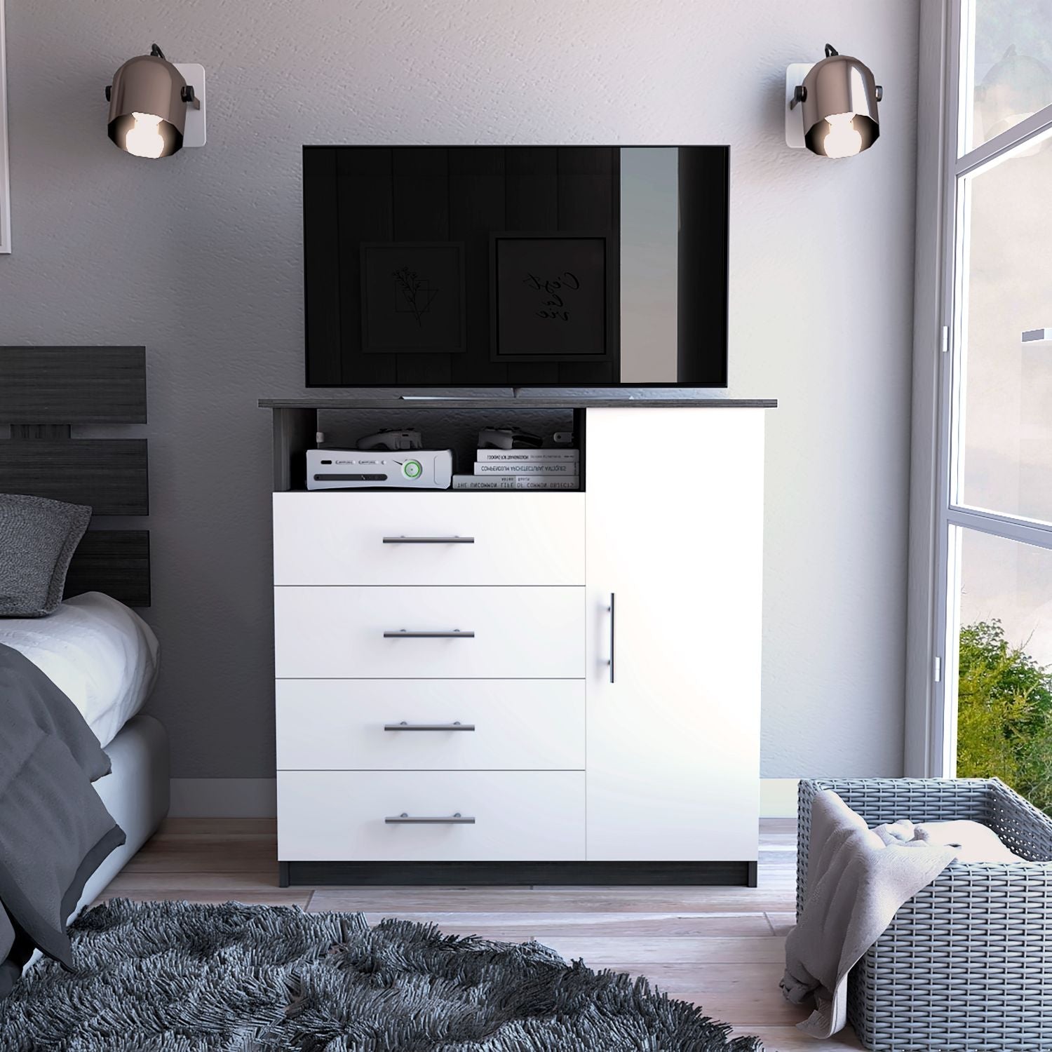 Sierra 4 Drawer Dresser is the perfect solution if you're looking for an excellent dresser with the possibility of a TV Stand. This drawer includes a single-door dresser (31,8''H X 12,2''W) that offers a modern timeless look with different storage options with its four ample drawers(6,4''H X 21,6''W). The top base also works as a TV stand (up to 40" Flat screen with their proper base) (35,8''W X 18'') and one open shelf (20,8''W X 5,9''H)