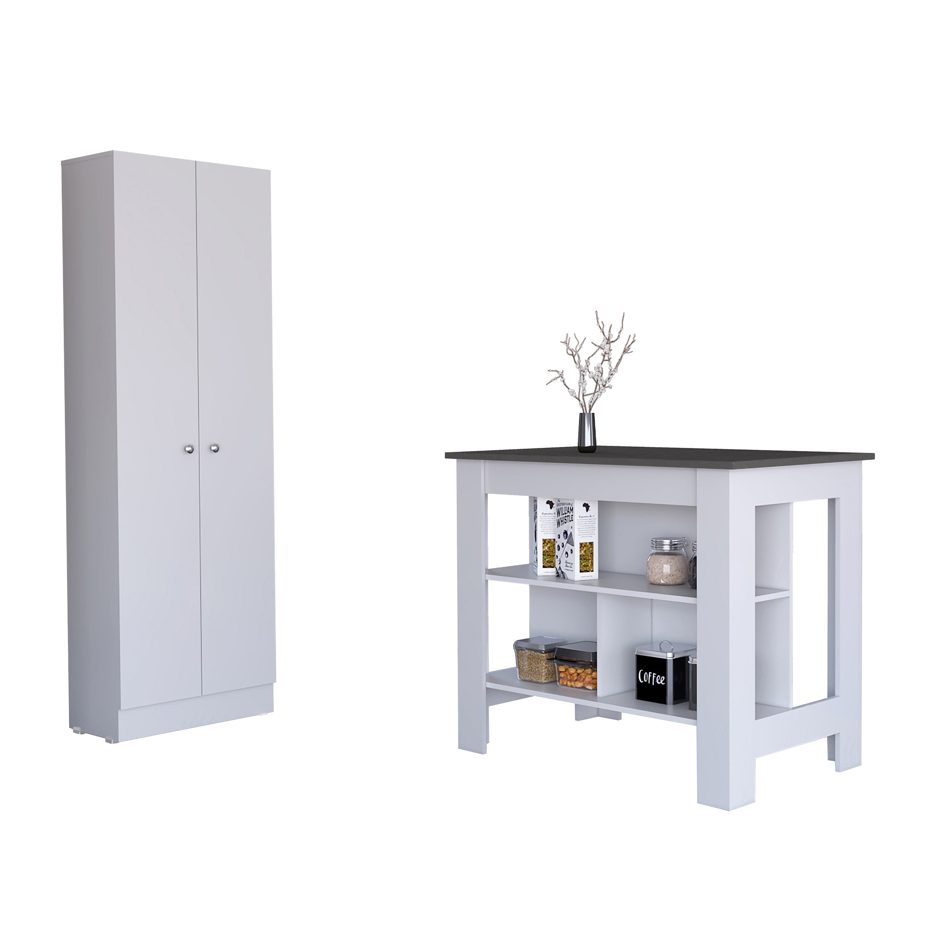 | Looking for a top-of-the-line kitchen set that will make your cooking space more sophisticated and elegant? Look no further than the Charlotte Kitchen Set! This set is designed with exclusive and resistant manufactured wood in a white-onyx finish, making it a standout piece in any kitchen. With its sleek lines and graceful curves, the Charlotte Kitchen Set will become your best ally in the kitchen. Whether you’re whipping up a quick meal or hosting a dinner party, this set will add a touch of class to your cooking space. The Cala Kitchen Island is the star of the show, with its beautiful design and ergonomic size. The wide surface (27,7"D X 40,5"W) is perfect for preparing food or enjoying a meal, and the multiple low shelves provide extra storage. The set includes a kitchen pantry, perfect for adding extra storage to your kitchen. The pantry features a spacious double-door cabinet and multiple interior shelves, making it easy to keep all your kitchen essentials neat. Dimensions: Furniture 1, Cala Kitchen Island Width: 40,5” Height: 35,4” Depth: 27,5” Furniture 2, Multistorage Kitchen Pantry Width: 23,6” Height: 70,8” Depth: 11,8” |