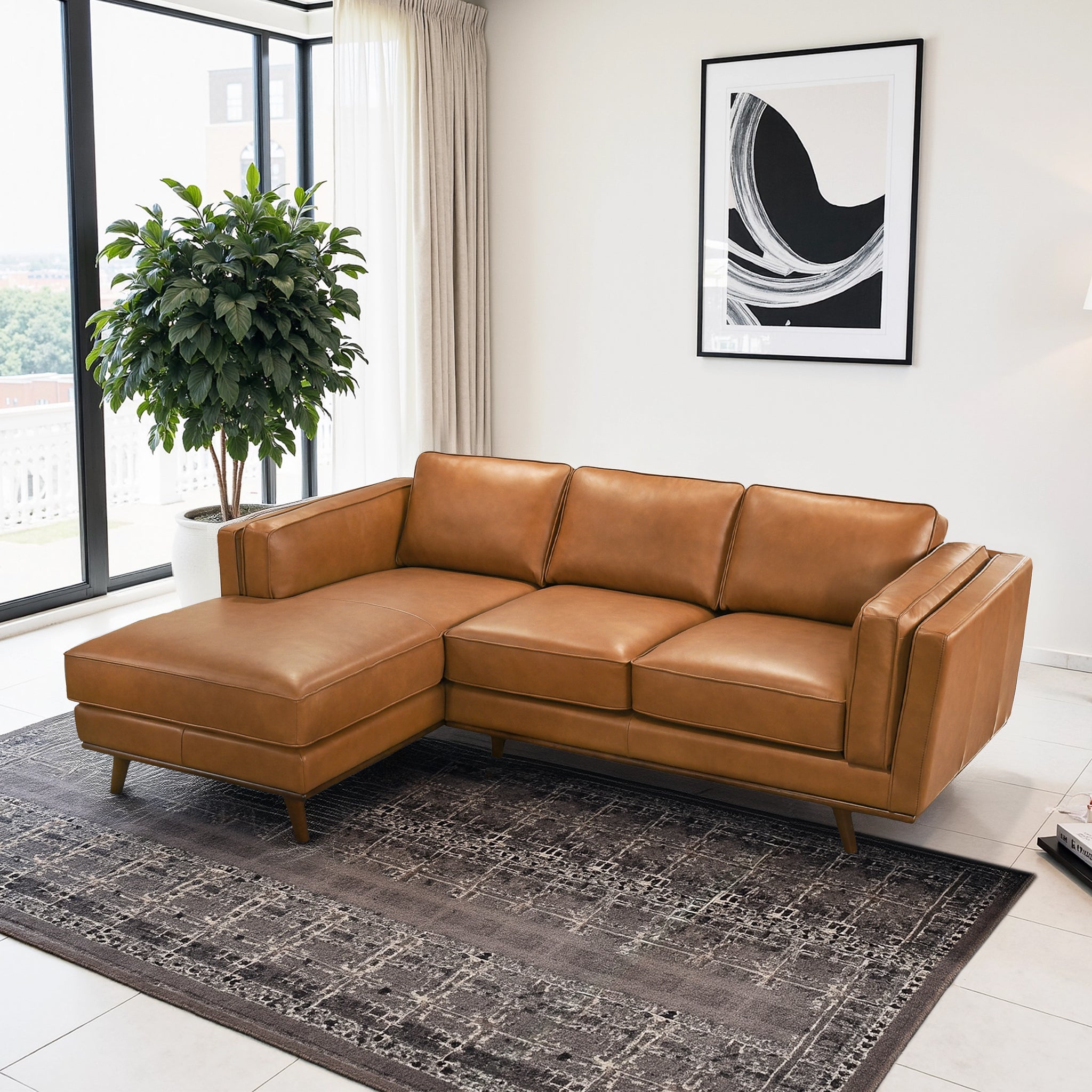 Anchor your space in mid-century modern style with the Chase tan genuine leather left sectional. Combining durable, top-quality craftsmanship and high-density foam this sofa will provide you with great comfort and undoubtedly become the centerpiece of your living room, den, urban loft, condo or home office. It is made of genuine leather and can be cleaned with a non-abrasive cleaning solution followed by a quick microfiber cloth. Removable legs allow for simple delivery for tight spaces. Available in a variety of timeless colors, you're sure to find something that matches your decor