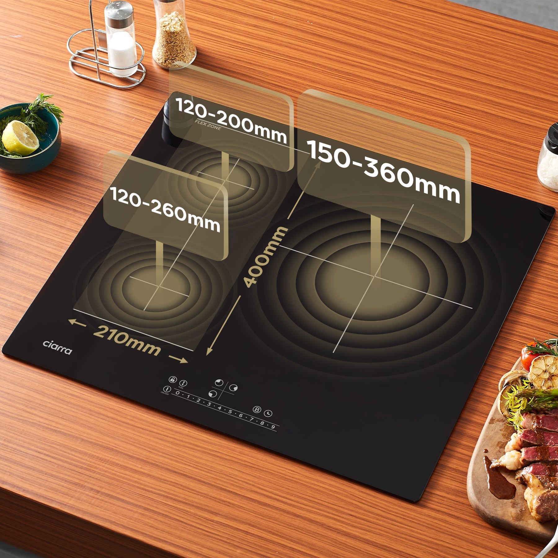 The two cooking zones on the left can be combined to work as one big flex zone; so you can fit larger or longer cookwares. The cookware can be moved freely within the flex zone area, the induction hob will automatically detect the cookwares, and start working in the previous setting. The flex zone gives your more flexibility when cooking and frying at a simple touch.