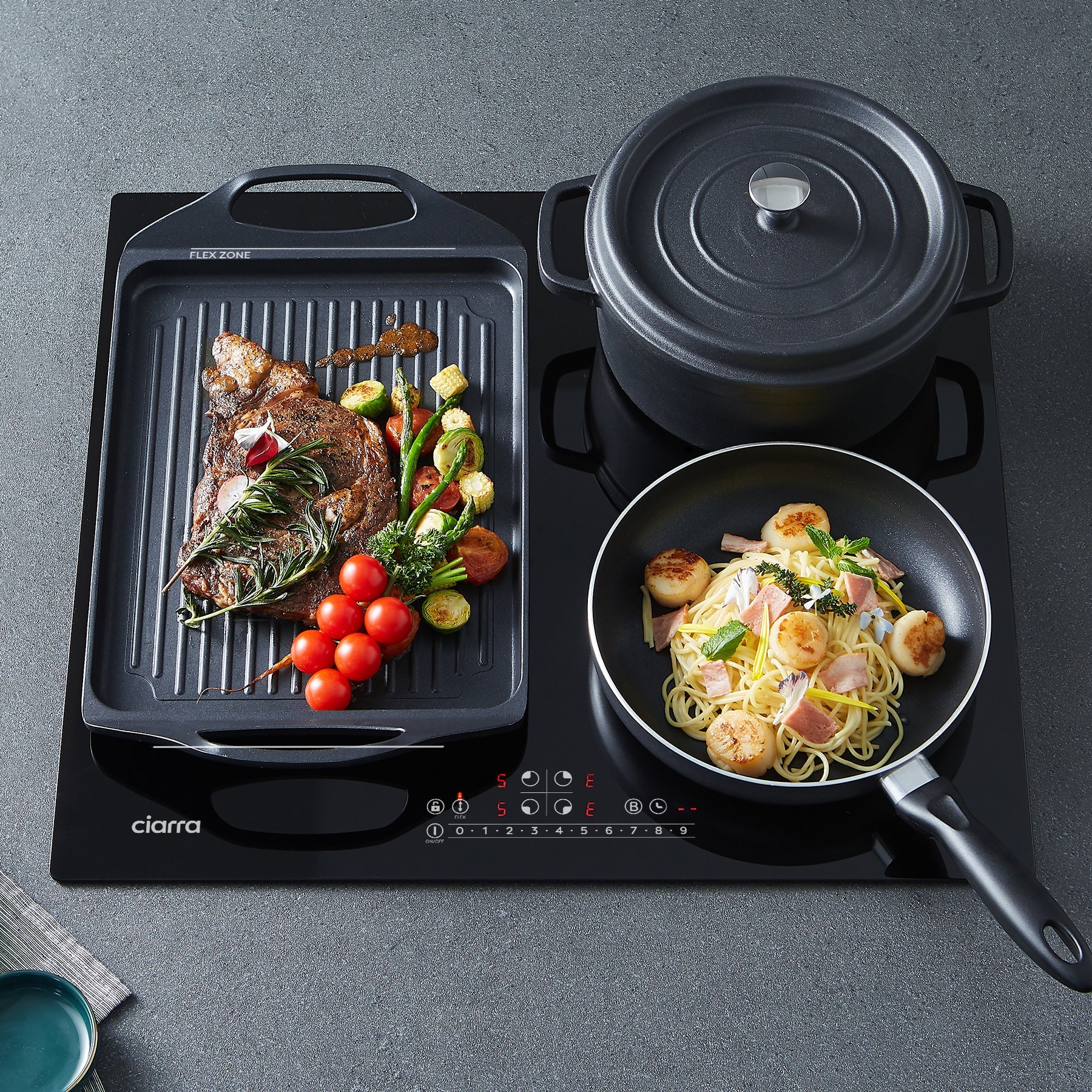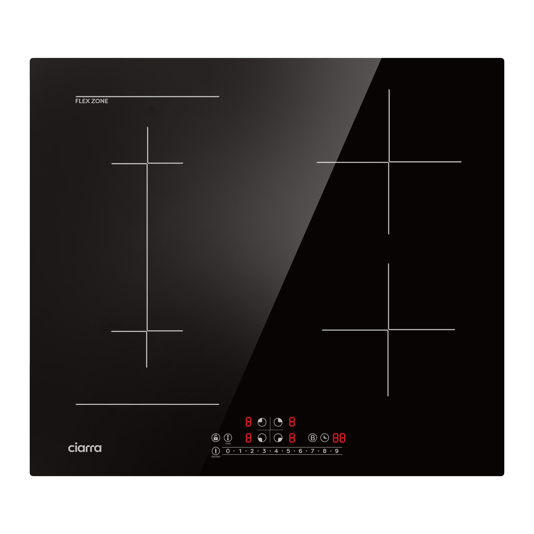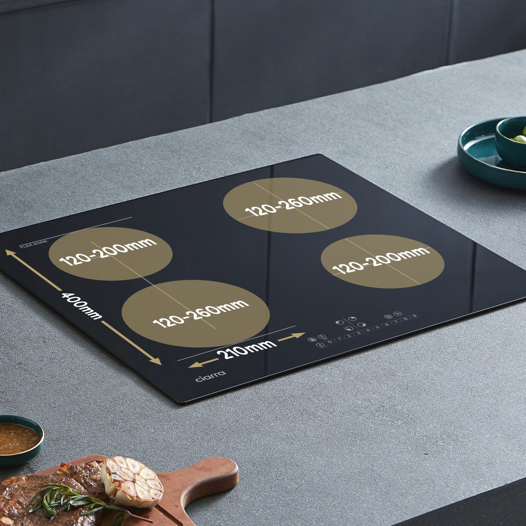 The two cooking zones on the left can be combined to work as one big flex zone; so you can fit larger or longer cookwares. The cookware can be moved freely within the flex zone area, the induction hob will automatically detect the cookwares, and start working in the previous setting. The flex zone gives your more flexibility when cooking and frying at a simple touch.