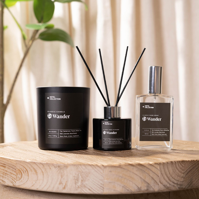 Crafted in collaboration with Wander, this serene signature scent was designed to evoke the luxury of your favorite getaway. Crisp white tea opens the journey, unfolding into quiet lavender fields and settling into the gentle warmth of cashmere. Airy, elegant, and endlessly inviting—Wander transforms any space into a refined escape.