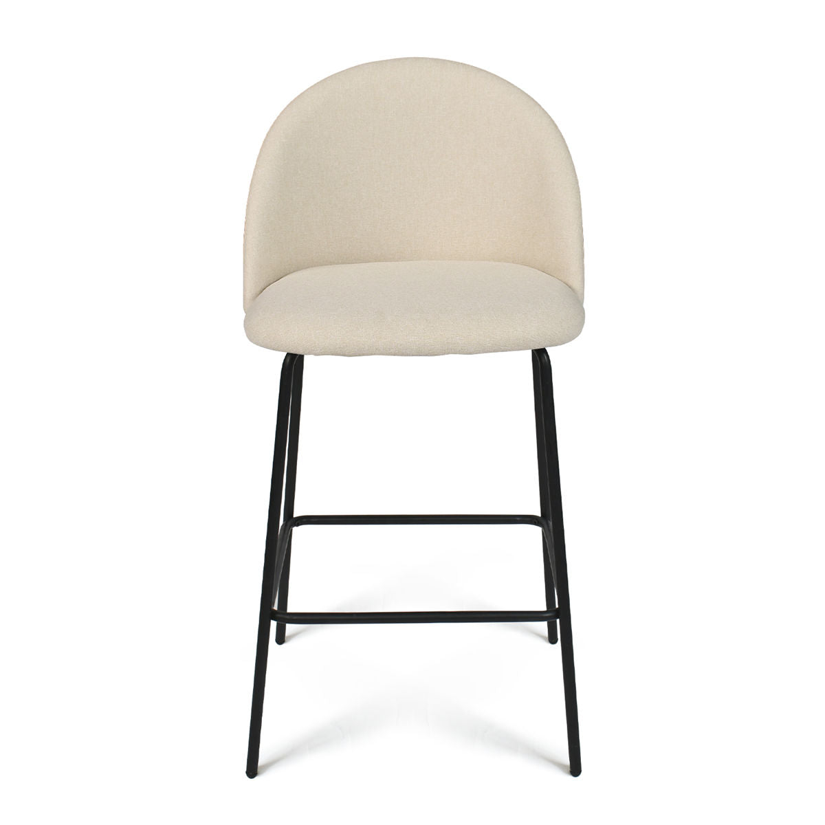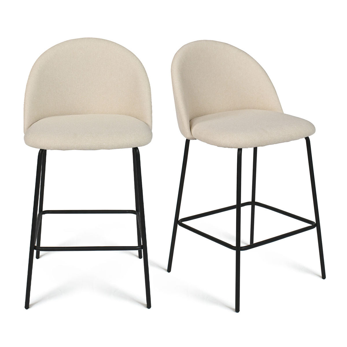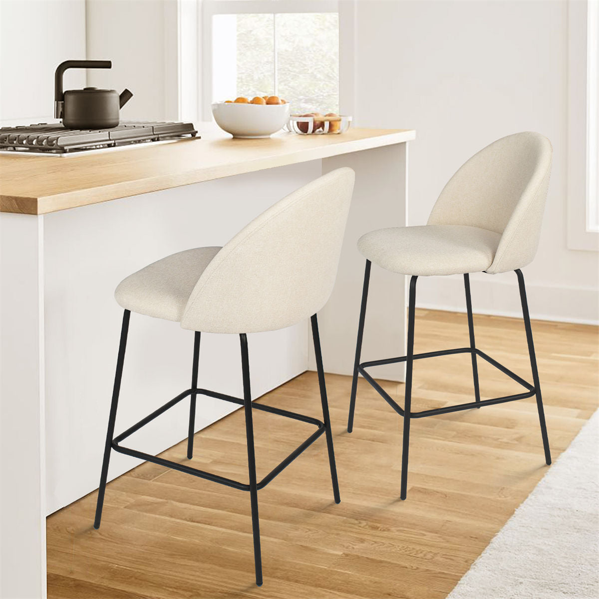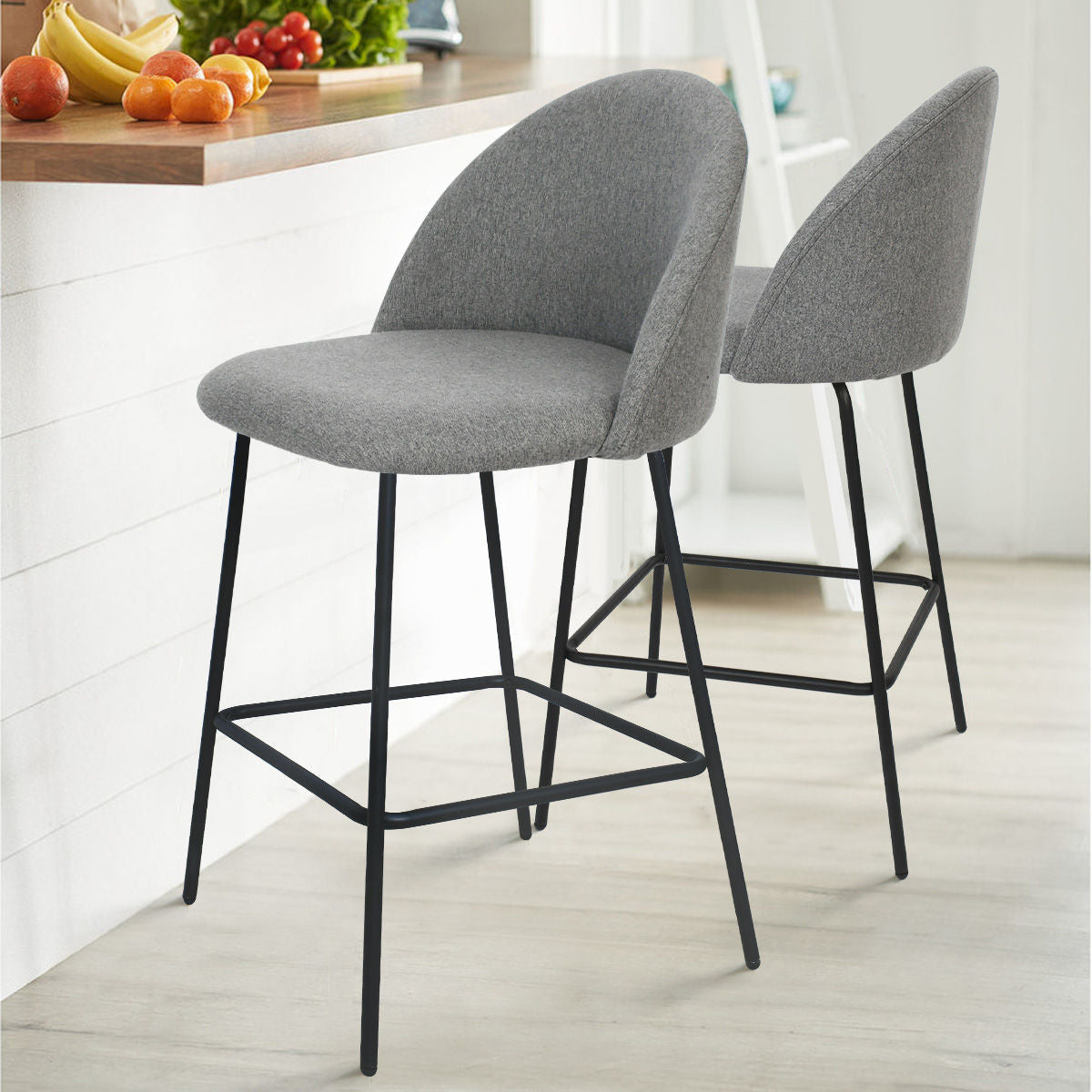 Bring a modern vibe to your kitchen or dining area with this pair of rounded, bucket-style stools. Contoured seats are foam-padded and upholstered in easy-care polyester. Slim black metal legs are braced with tubular stretchers for stability that also doubles as a footrest, while plastic glides help protect floors from scratches and scuffs. When dinner’s done—or the workday wraps—simply slide them under the counter or table to save space.
