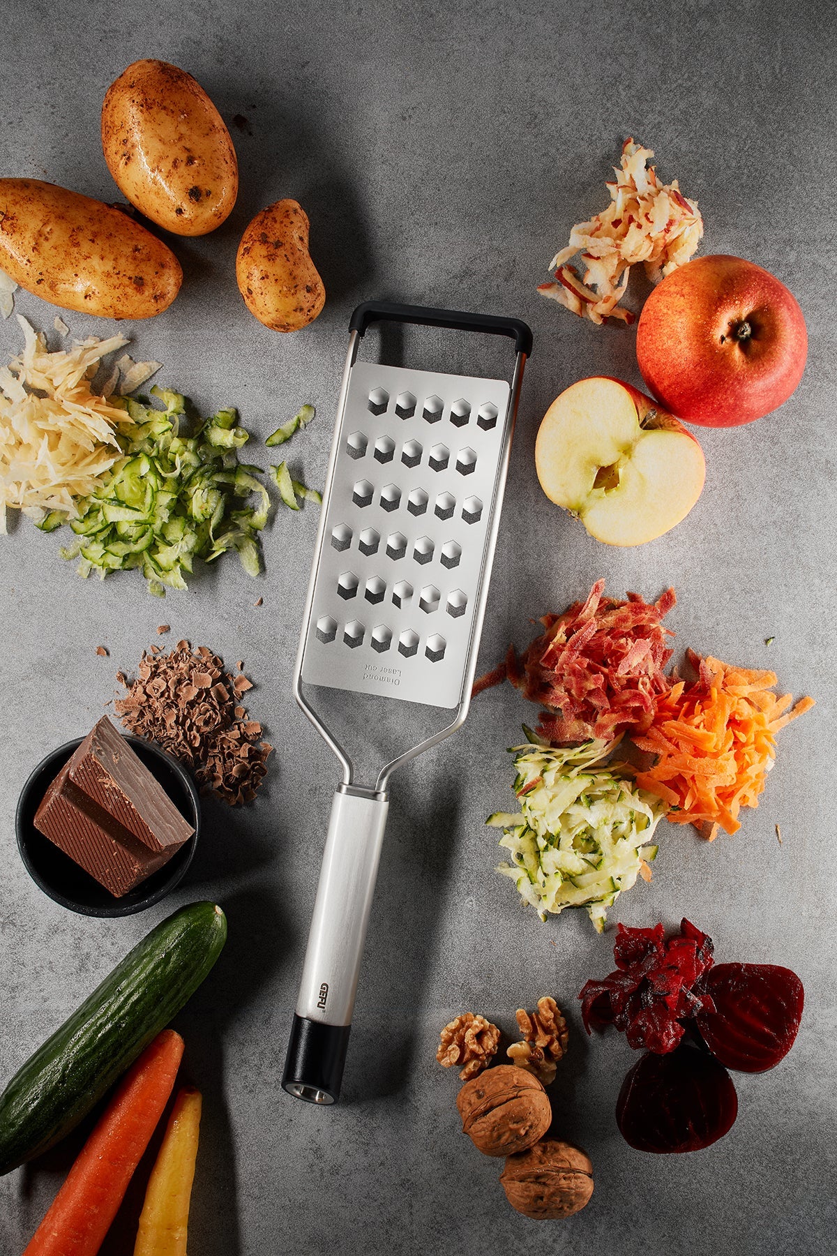The coarse grater delivers crunchy ingredients for raw-vegetable salads, dips and delicious, fried grated potato and vegetables: and thanks to its anti-slip foot everything can be grated directly and comfortably into bowls and pots.
