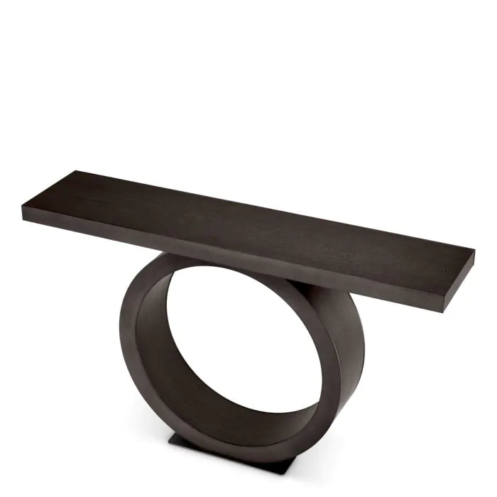 The Odis Console Table is a stunning piece crafted with a mocha oak veneer and a dark bronze finish. Its unique design...