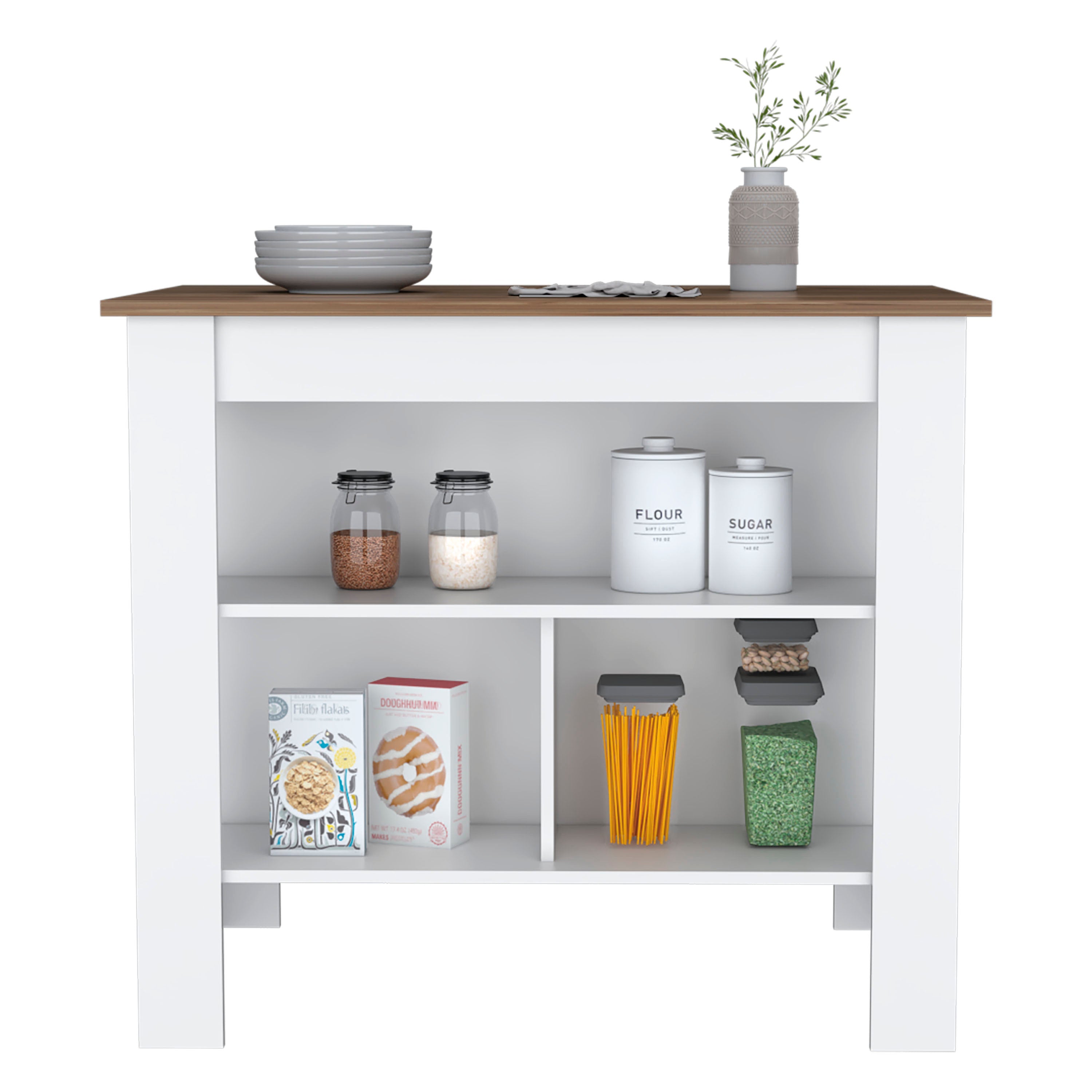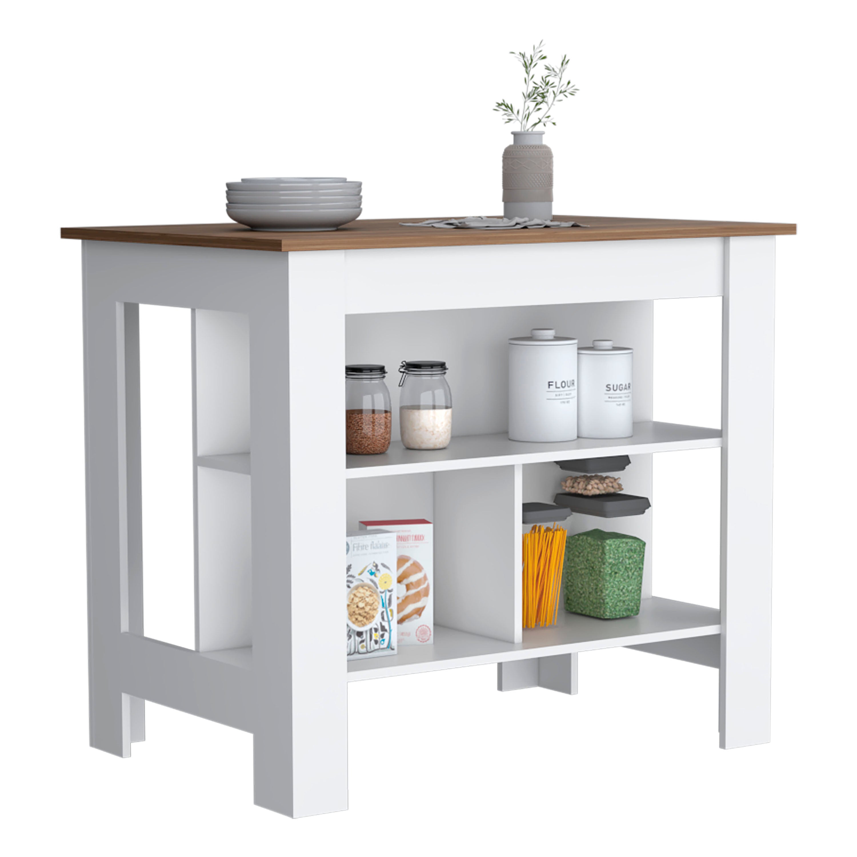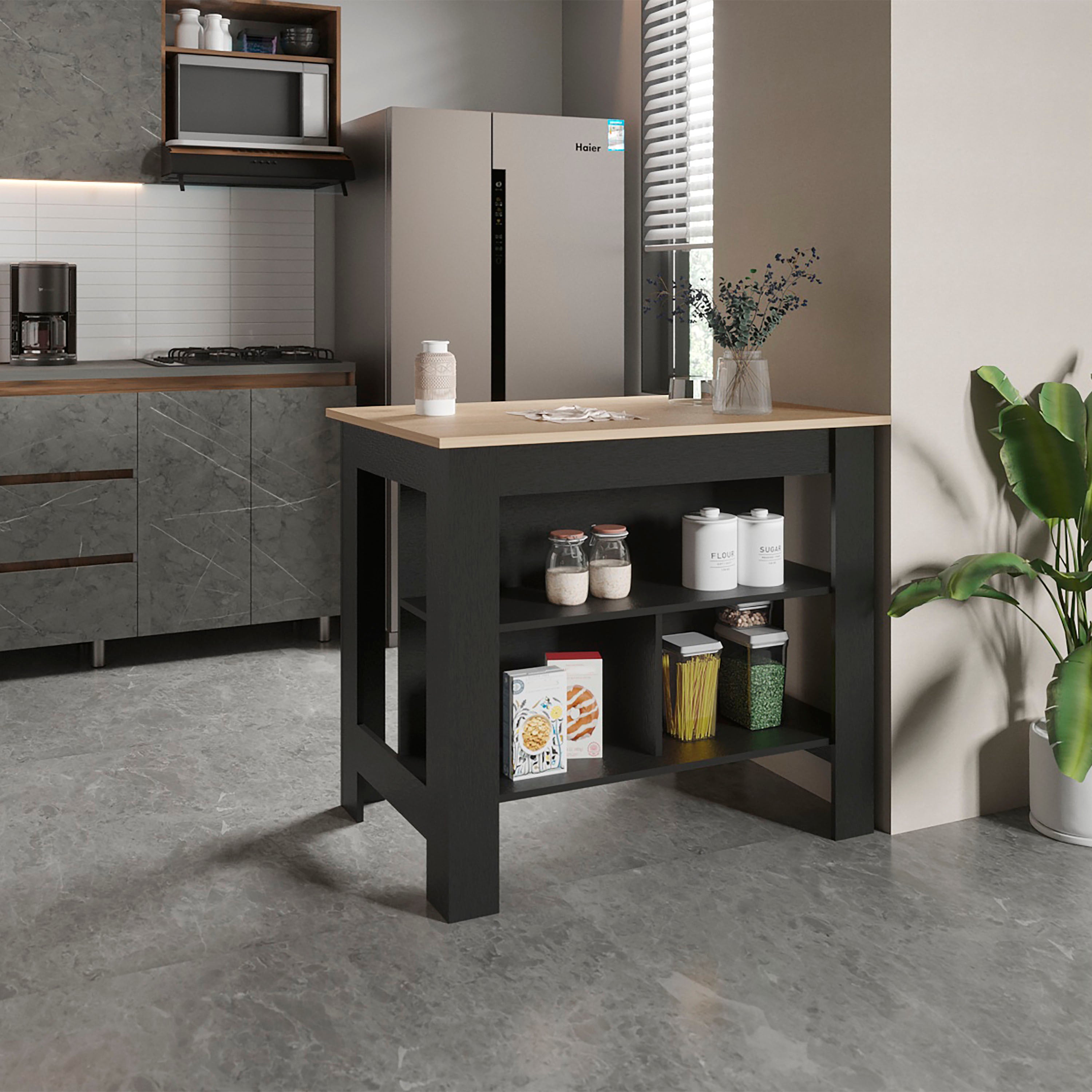 Introducing our versatile kitchen island, designed to elevate your culinary space with ample storage and functionality. This table features a built-in spice rack, a large shelving space for organizing all your kitchen essentials. The top serves as both a preparation area and an informal bar, perfect for entertaining guests. With its spacious design, this island fits seamlessly into any room, providing a practical solution for everyday use. Enhance your kitchen with this stylish and functional piece, ideal for any modern home.