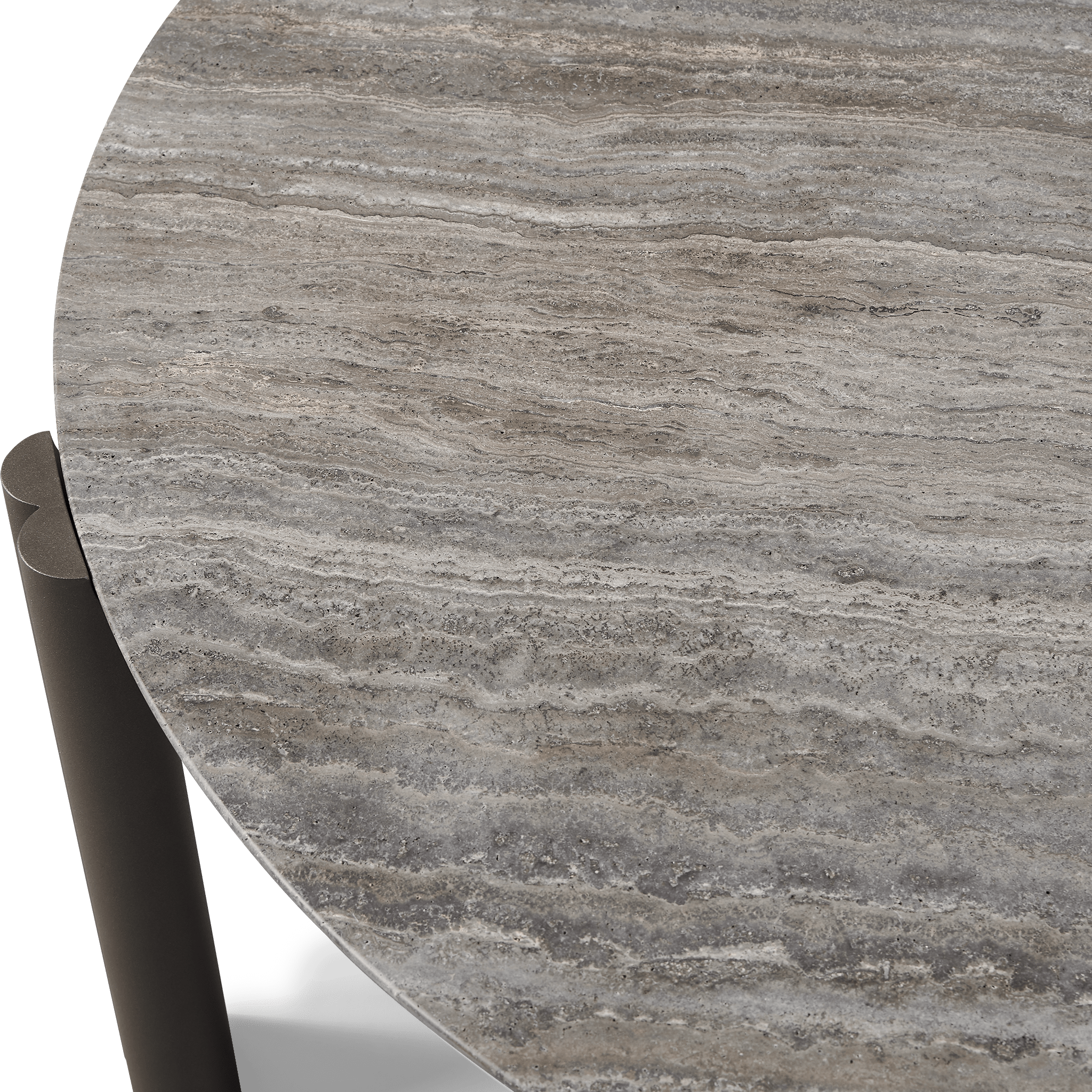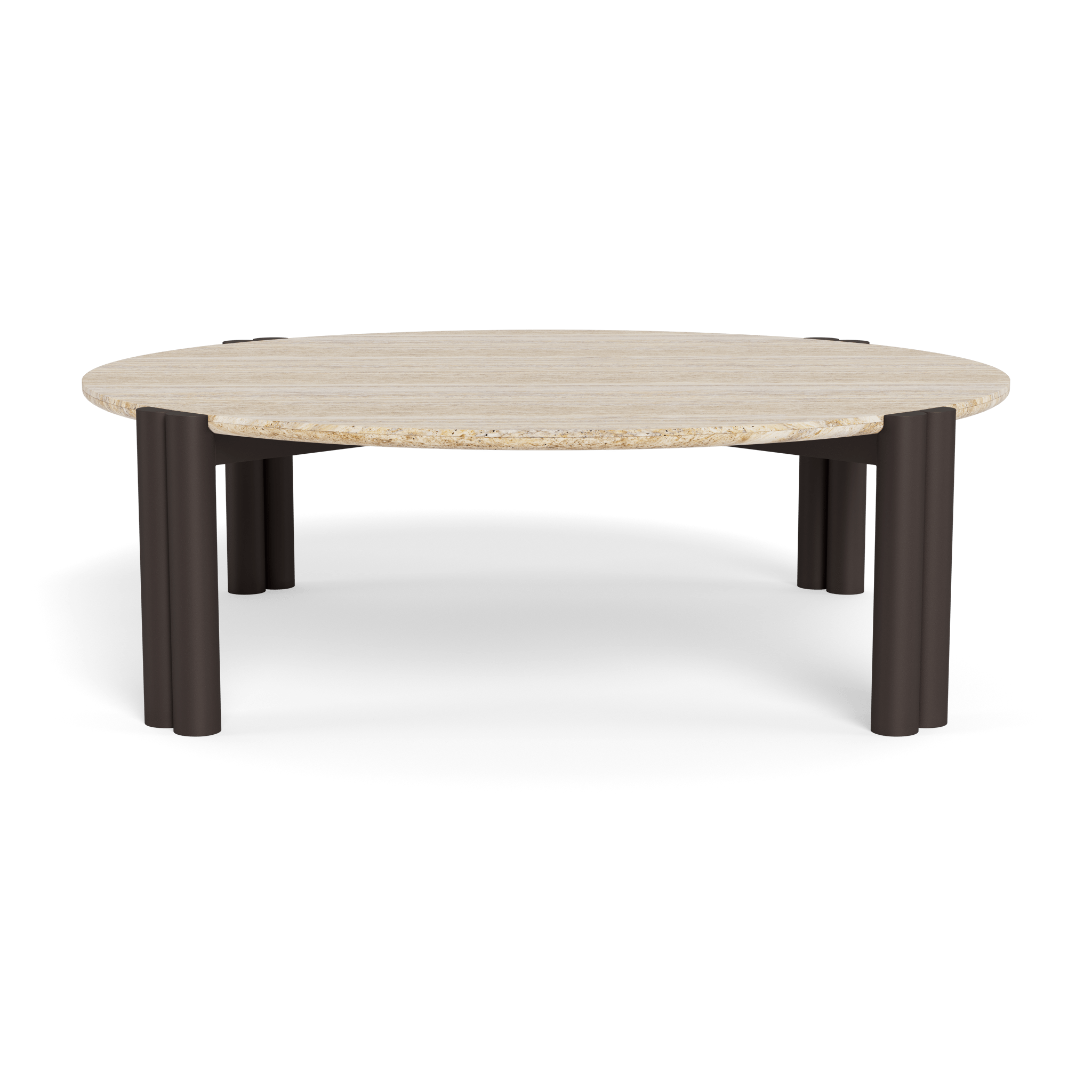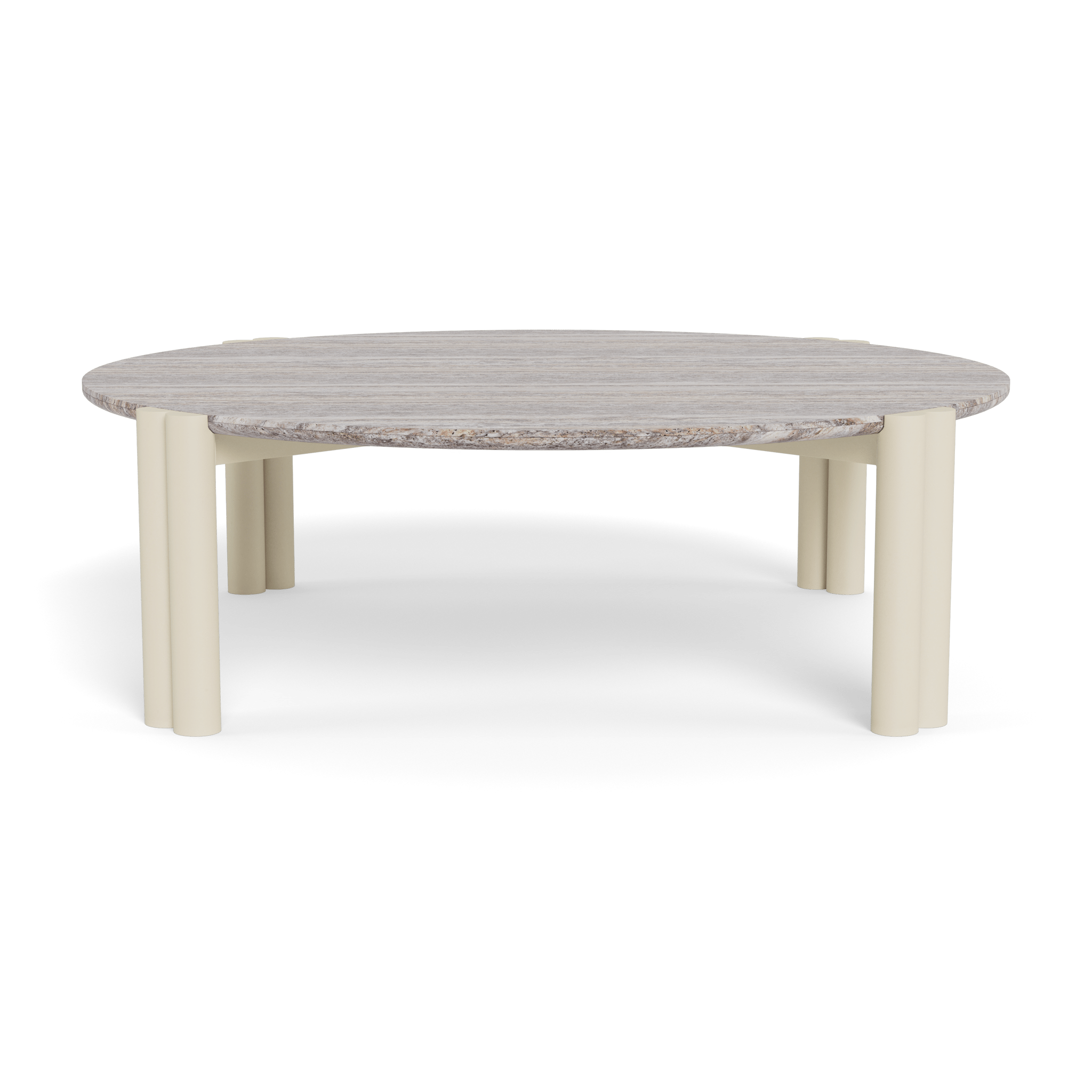 Influenced by modern Australian architecture and landscapes, our refined Cove collection features special details like double cylindrical legs and curved edges that create soft sculptural silhouettes. The mixed–material Cove Round Coffee Table completes your outdoor seating set — featuring a refined powder coated aluminum frame in Aluminum Bone with an architectural double leg detail suspending an organic travertine stone top in Cream. A classic round outdoor coffee table, this piece invites conversation and maximizes space efficiency.