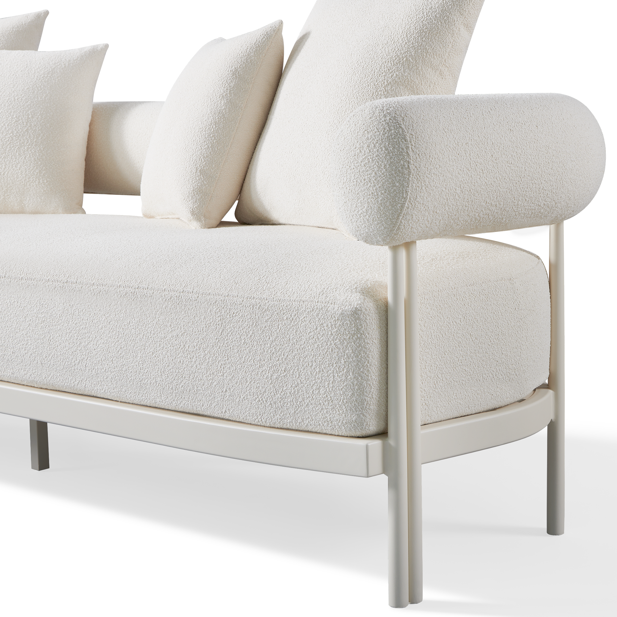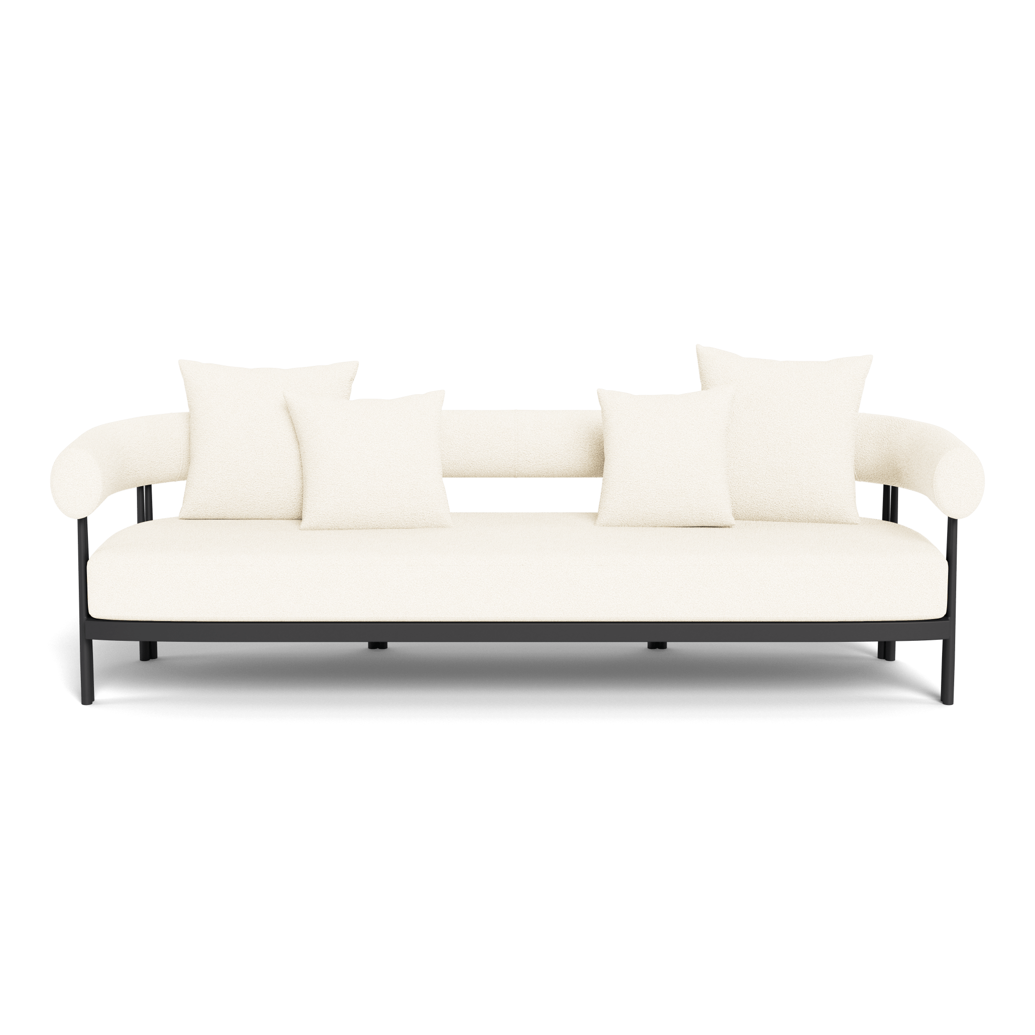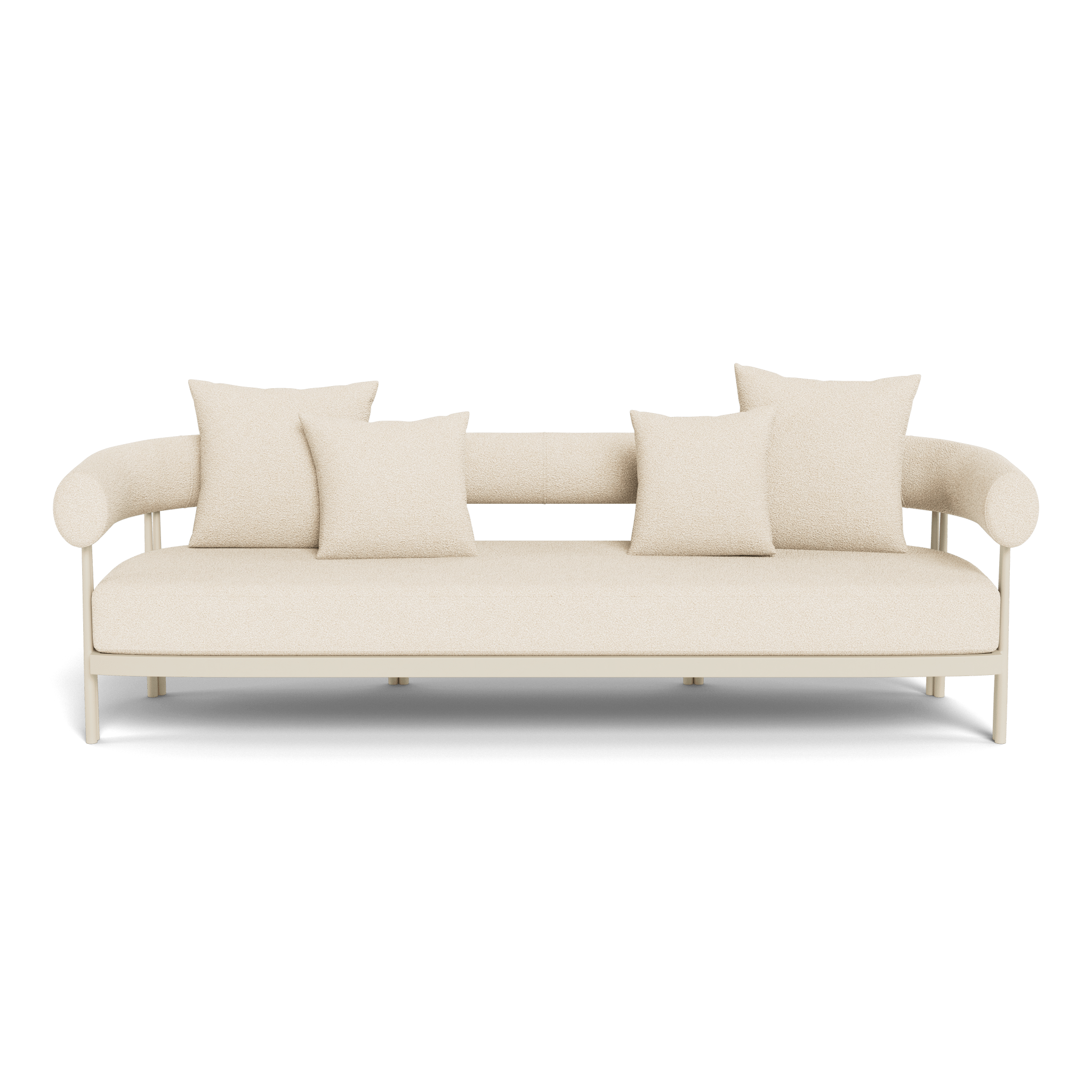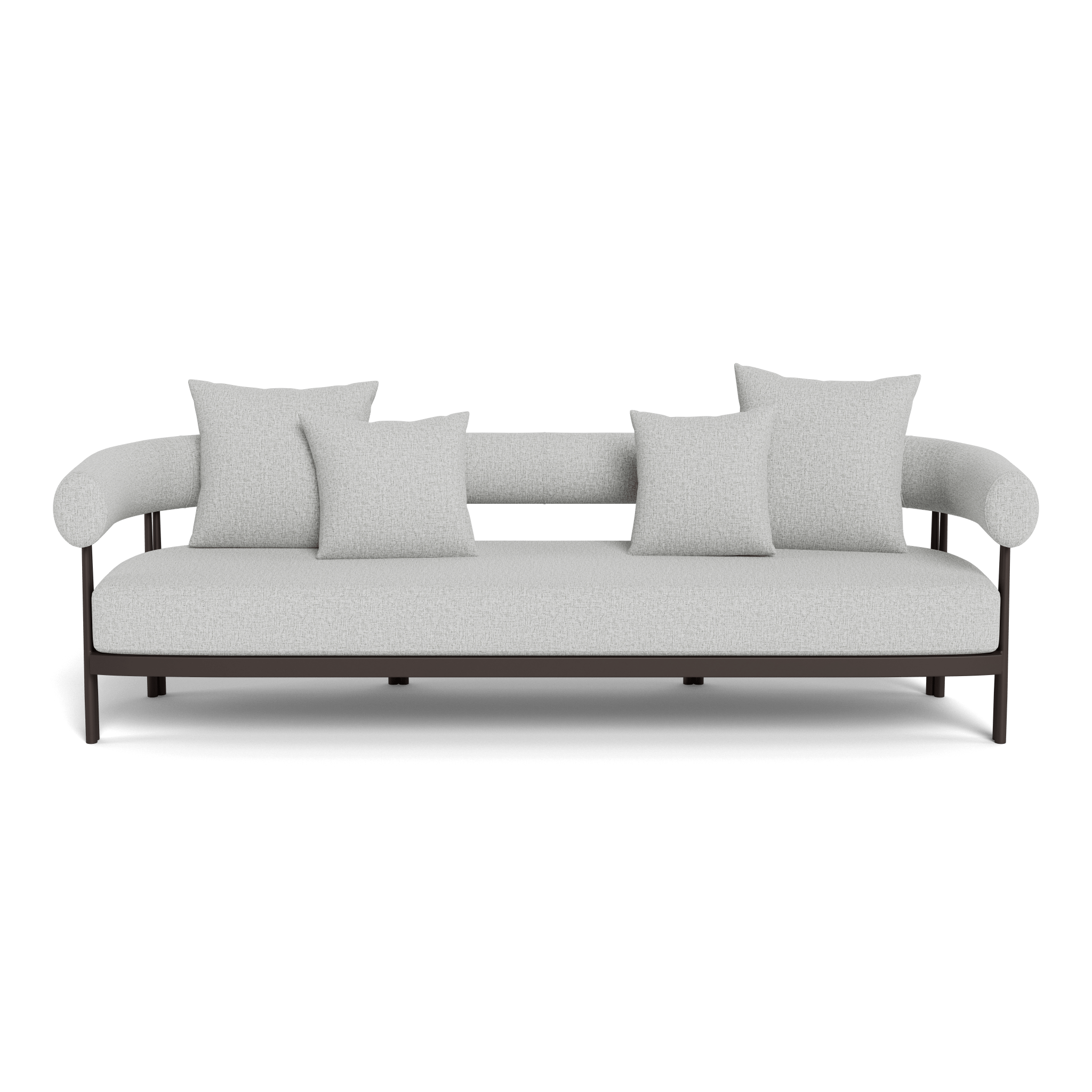 Influenced by modern Australian architecture and landscapes, our sophisticated Cove Luxe collection featureswith special details like double cylindrical legs and curved edges – refined with luxurious upholstered bolster backs – that create soft sculptural silhouettes. The Cove Luxe 3 Seat Sofa is contemporary comfort — featuring a powder coated aluminum frame in Aluminum Bone with an architectural double leg detail. Enjoy a signature sculpted bolster back with a plush all–weather bench cushion in Copacabana Natural for lounging. With a sleek and efficient footprint, this outdoor sofa is a versatile design element for any space.