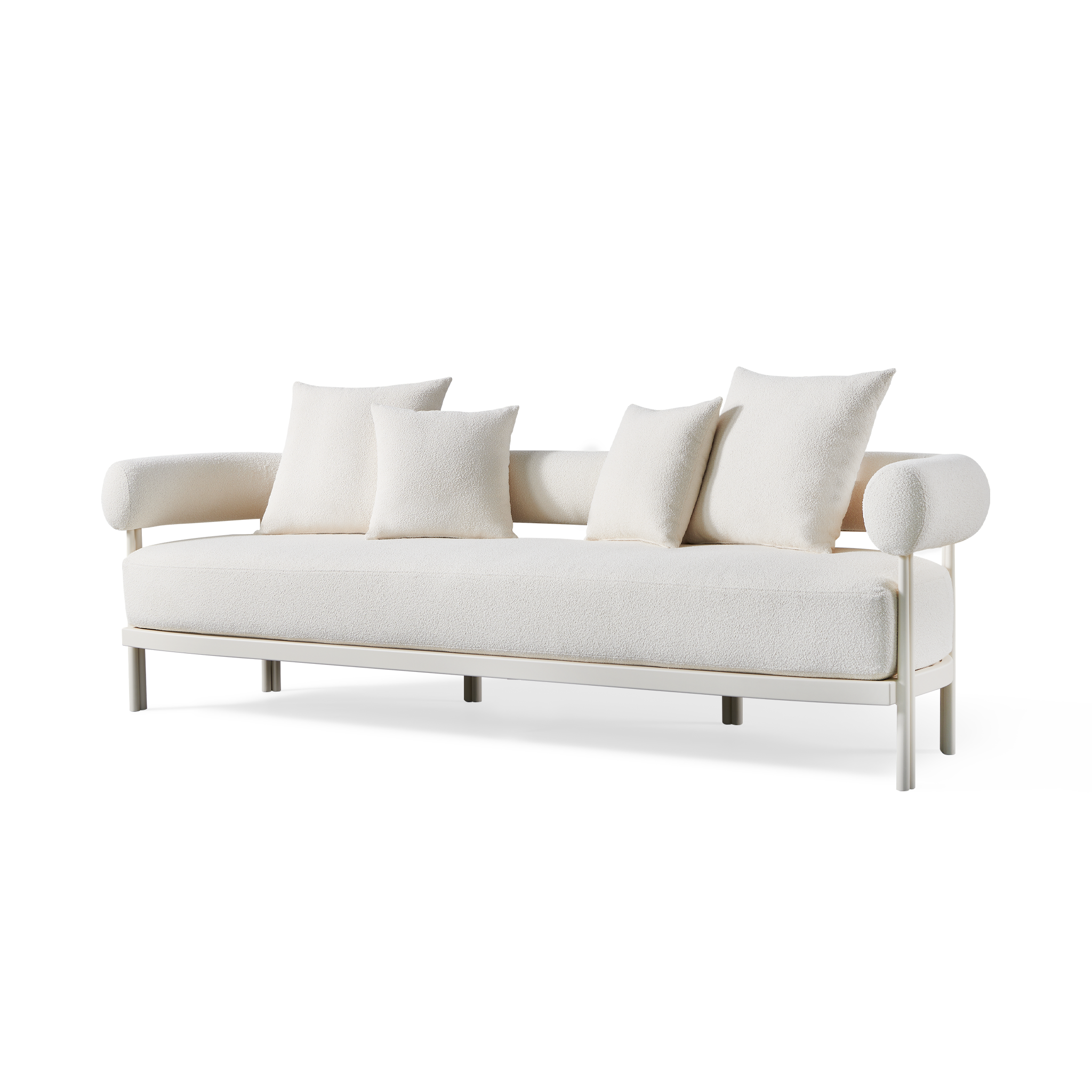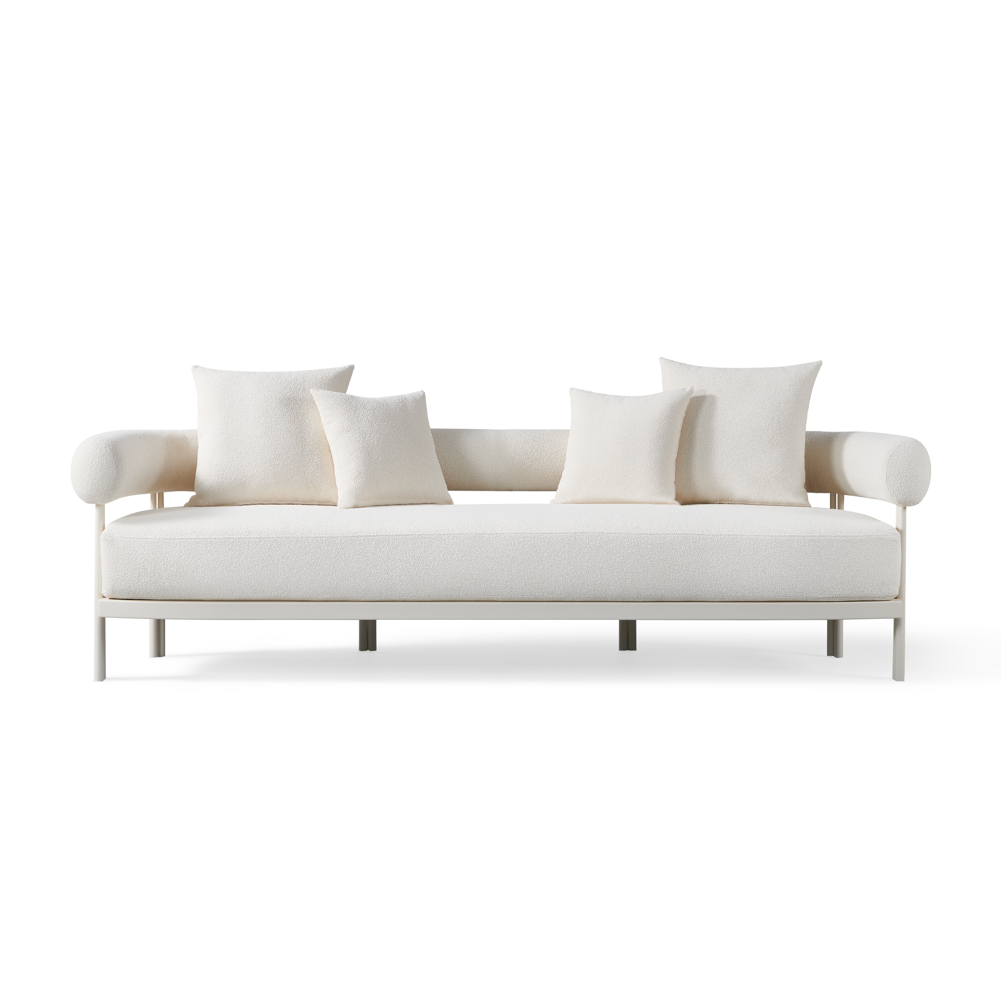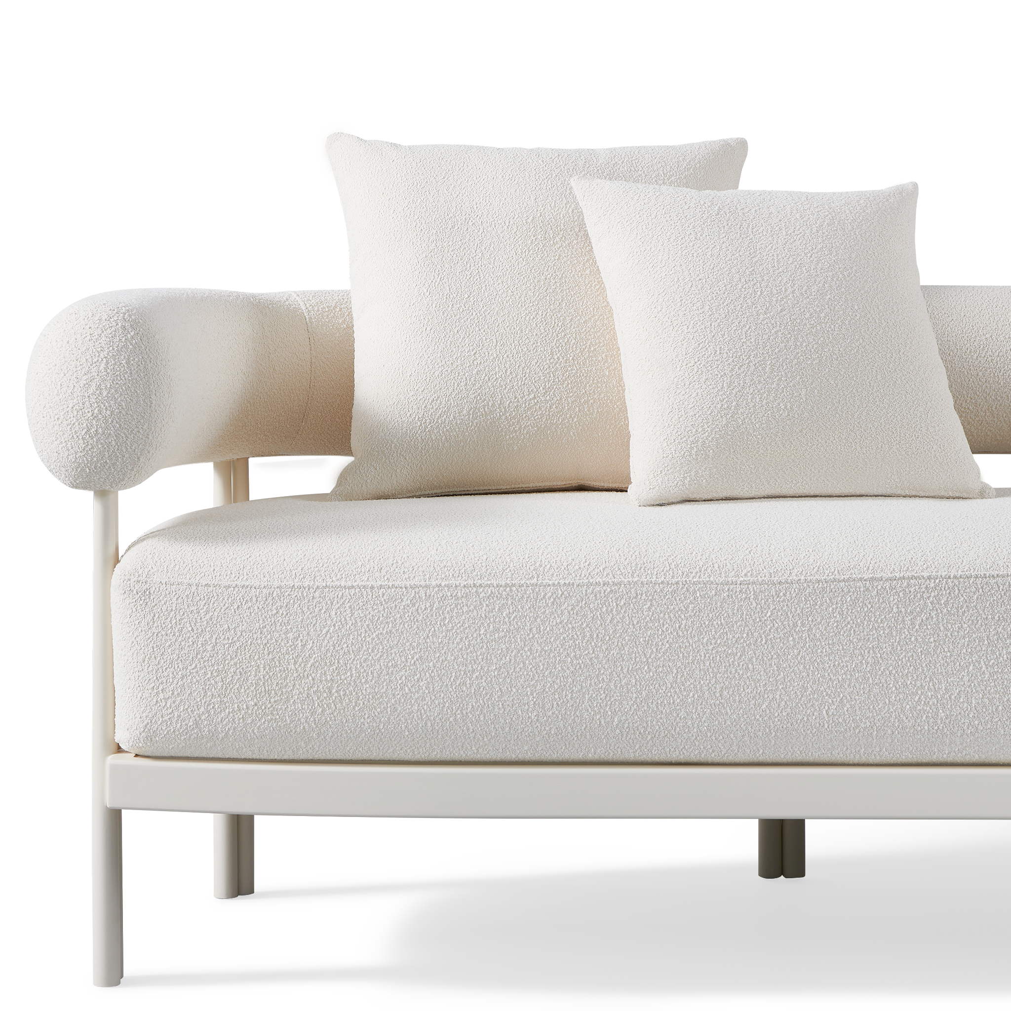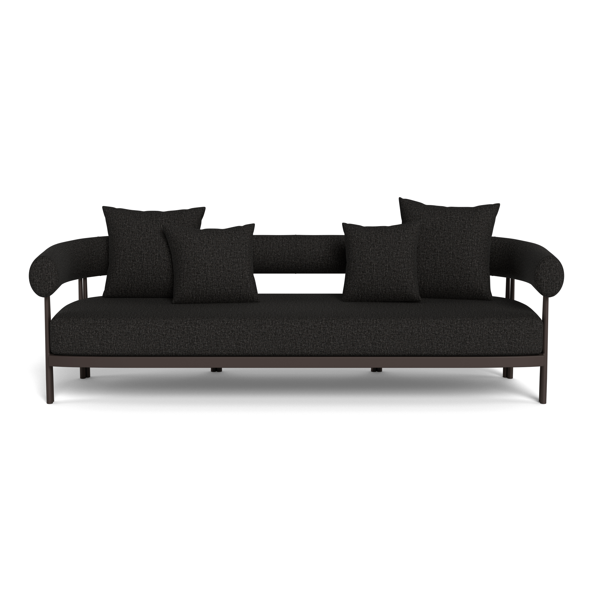 Influenced by modern Australian architecture and landscapes, our sophisticated Cove Luxe collection featureswith special details like double cylindrical legs and curved edges – refined with luxurious upholstered bolster backs – that create soft sculptural silhouettes. The Cove Luxe 3 Seat Sofa is contemporary comfort — featuring a powder coated aluminum frame in Aluminum Bone with an architectural double leg detail. Enjoy a signature sculpted bolster back with a plush all–weather bench cushion in Copacabana Natural for lounging. With a sleek and efficient footprint, this outdoor sofa is a versatile design element for any space.