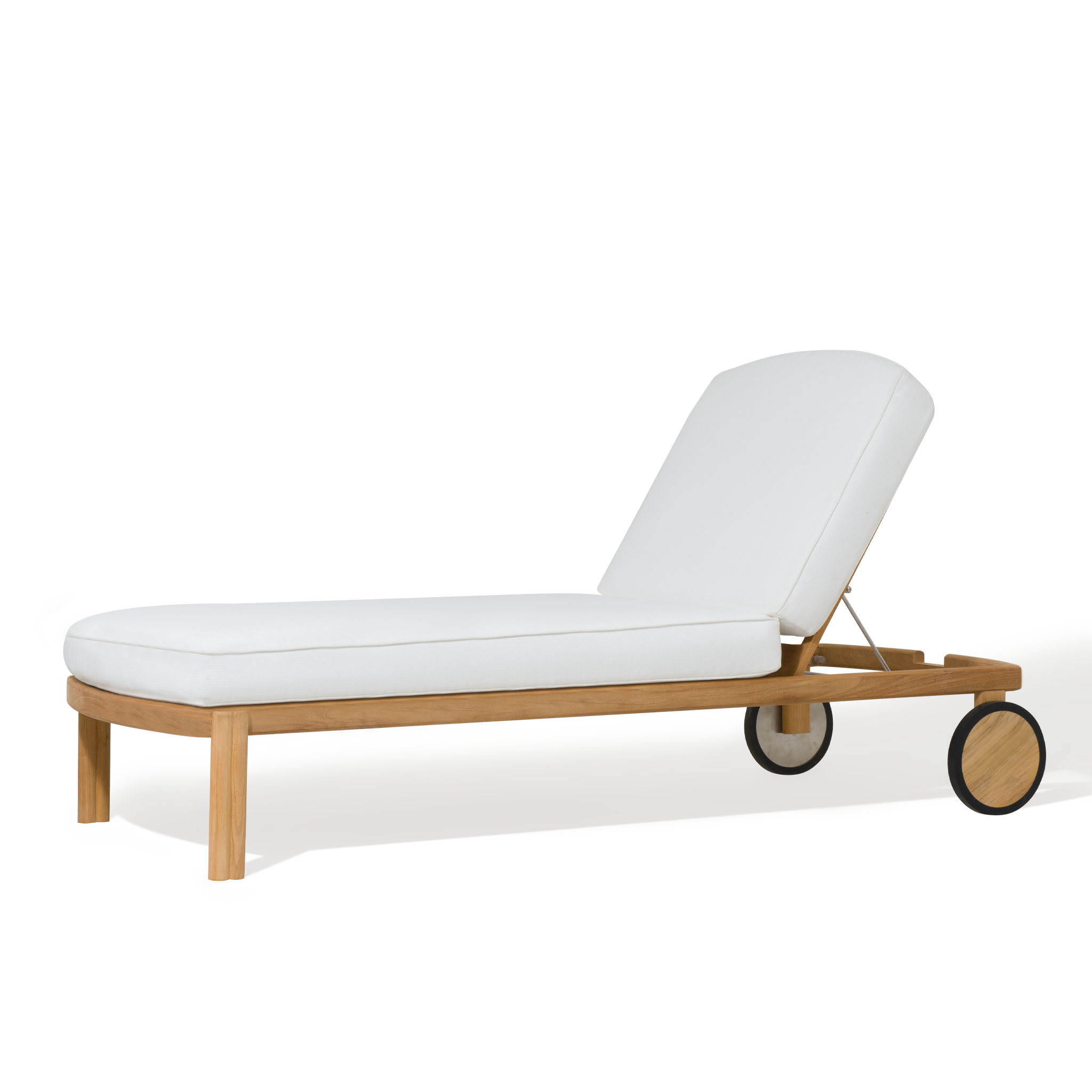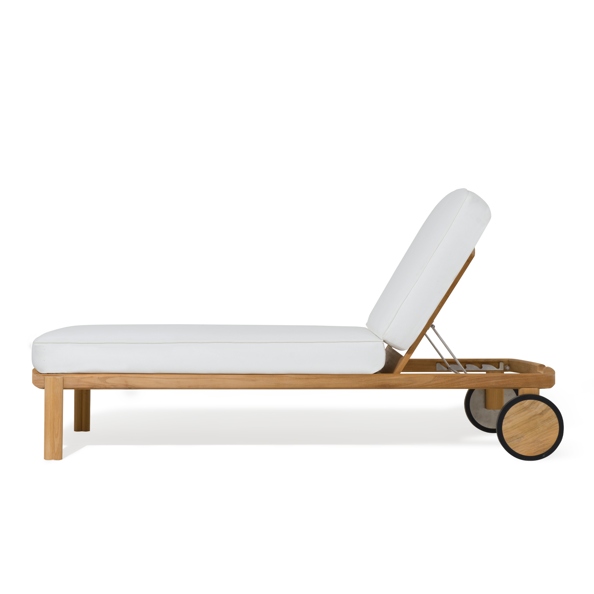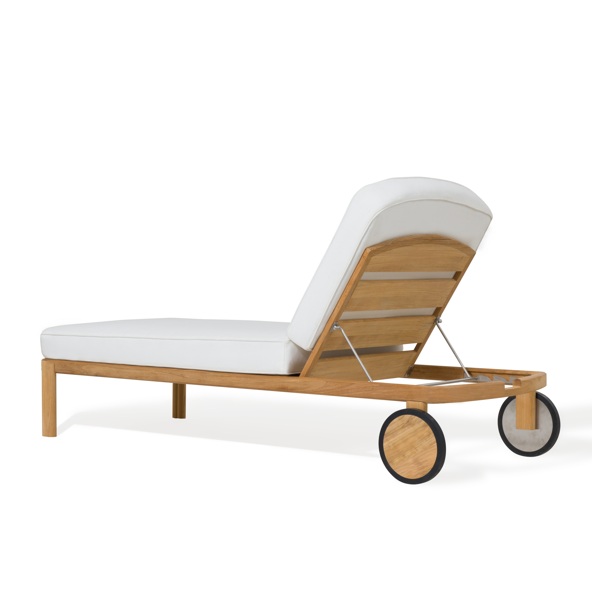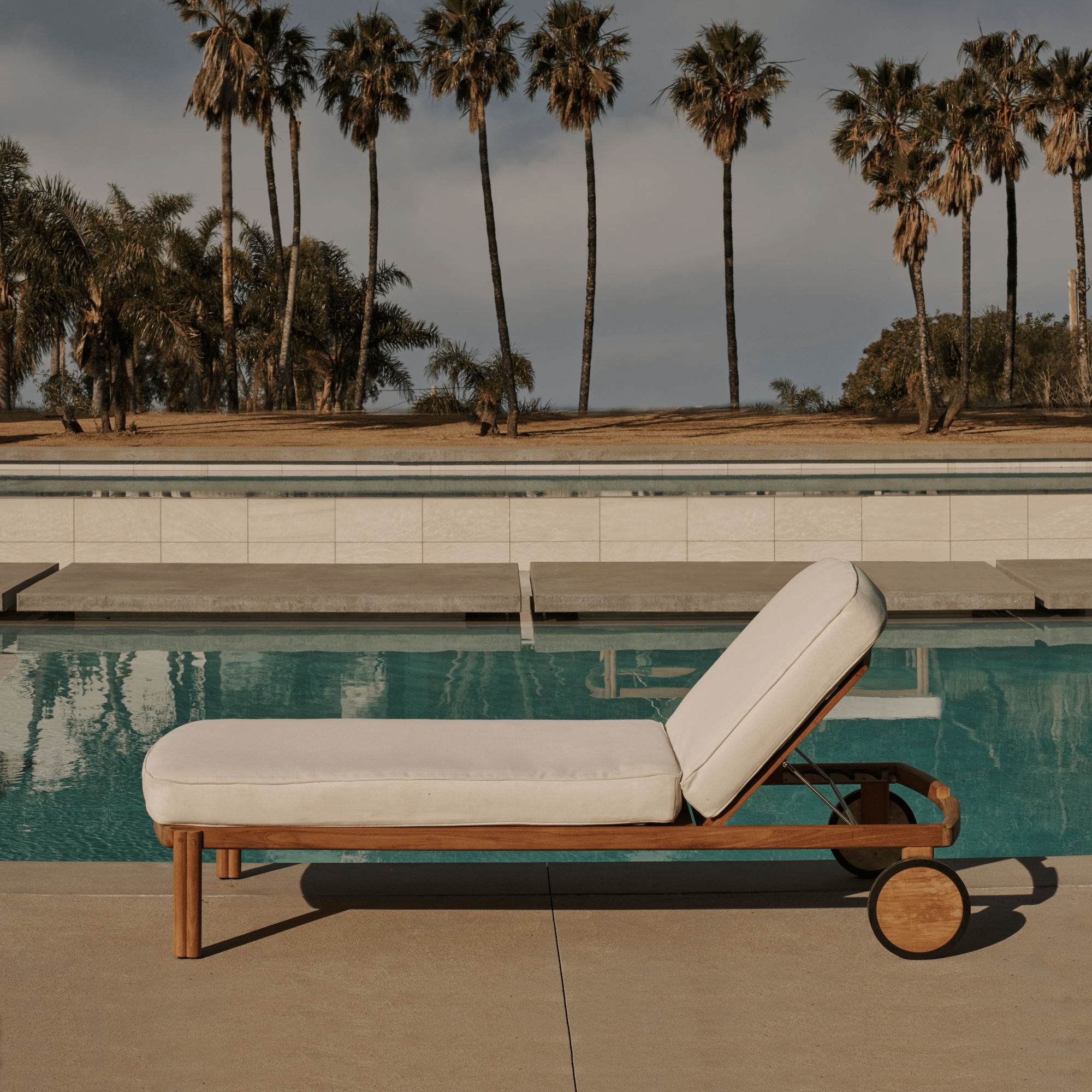 Influenced by modern Australian architecture and landscapes, our refined Cove collection features special details like double cylindrical legs and curved edges that create soft sculptural silhouettes. The Cove Sun Lounge is contemporary comfort — featuring a refined solid teak frame in Natural with an architectural double leg detail and special curved shape that echoes the design language signature to this series. Enjoy a plush all–weather hinged cushion in Copacabana Natural that invites sink–in comfort. Rear rubberized wheels add function and style. Tracery and light with a footprint to match, this comfort–driven outdoor sun lounge is a versatile design element for any space.