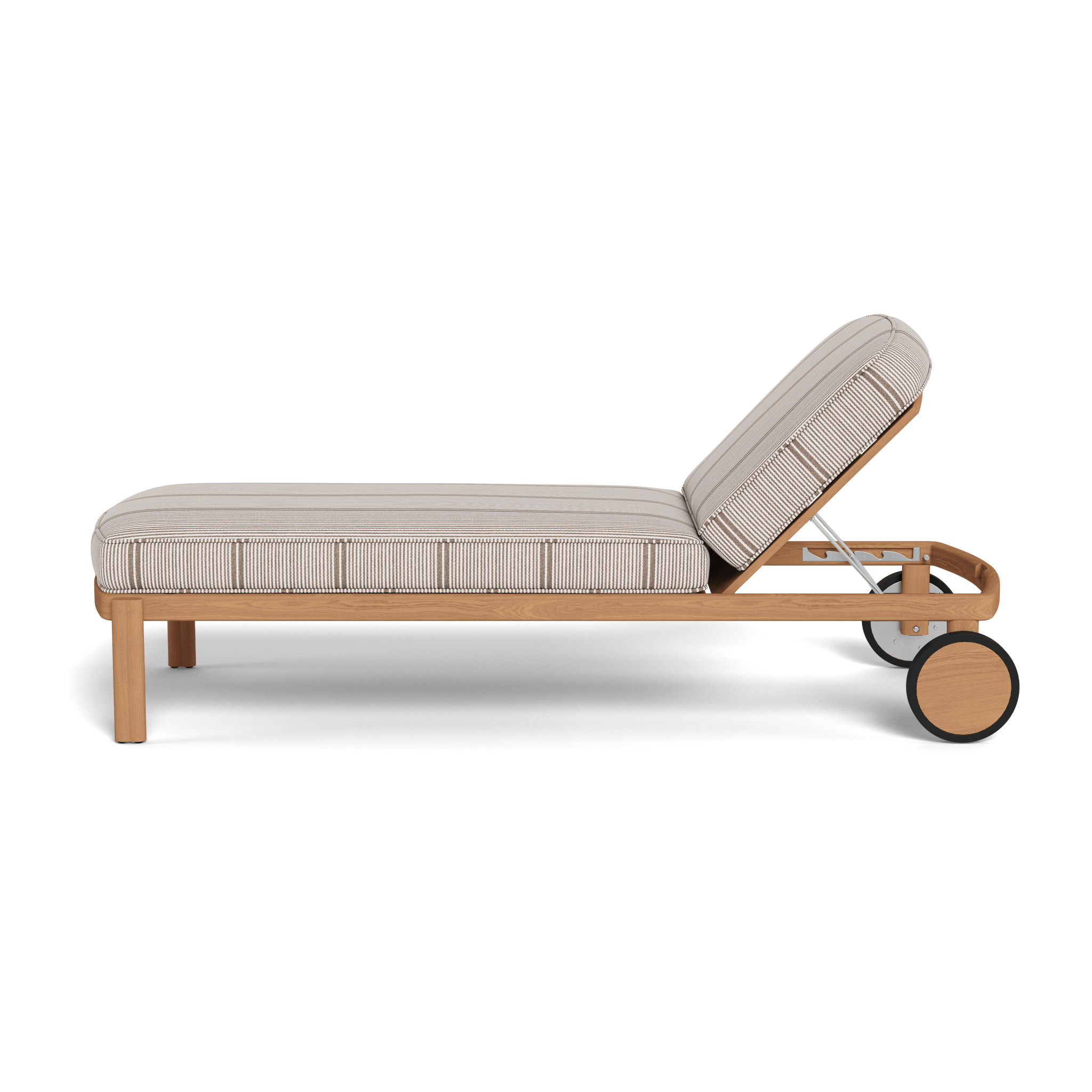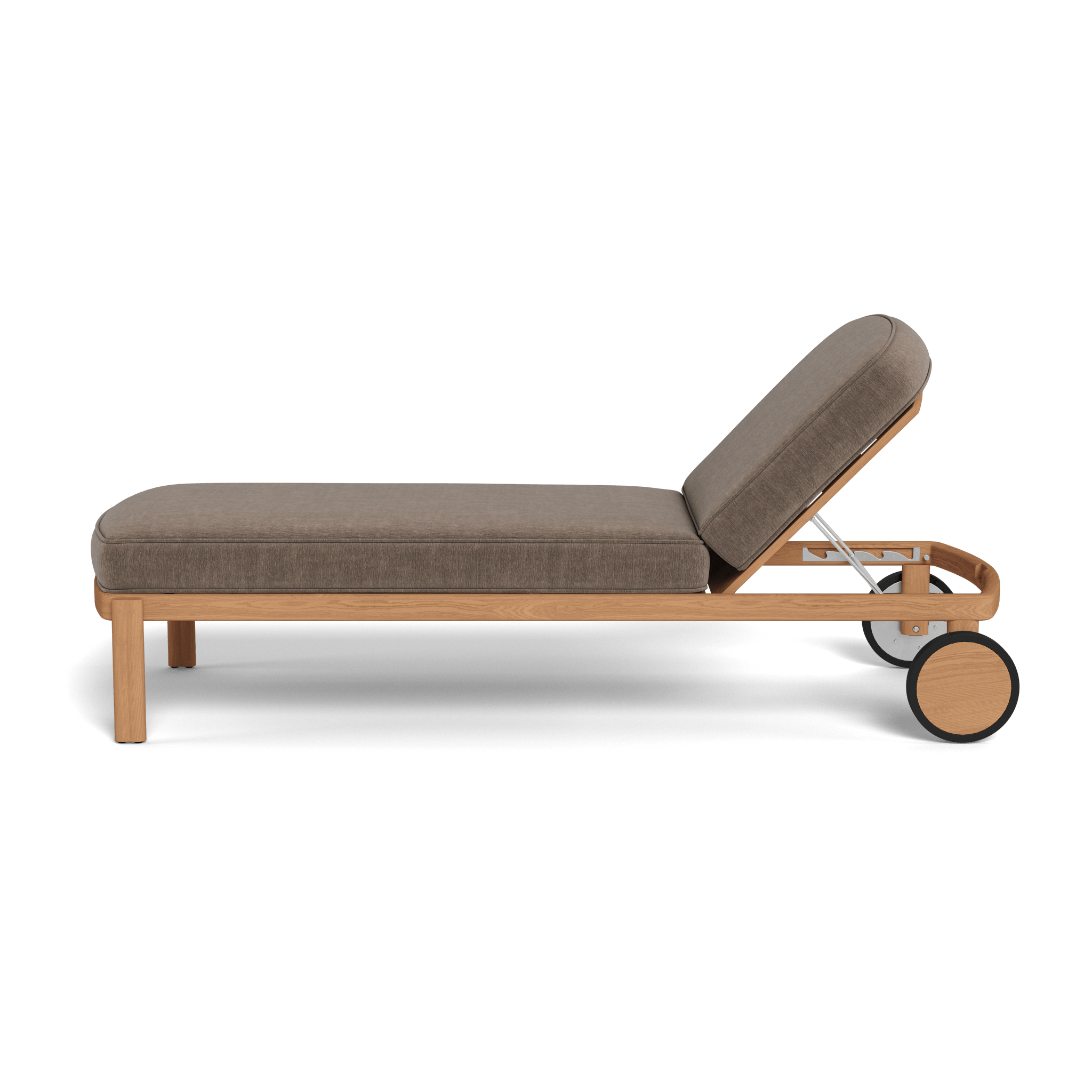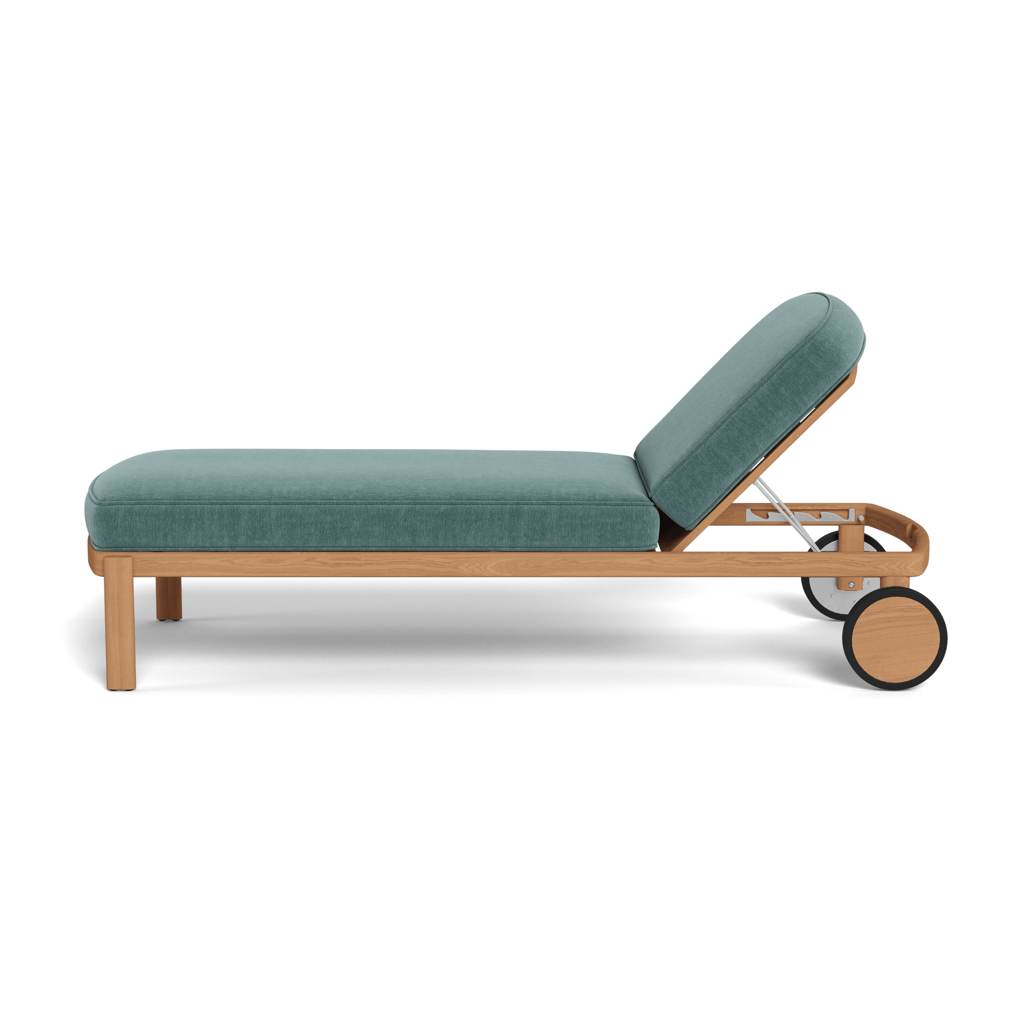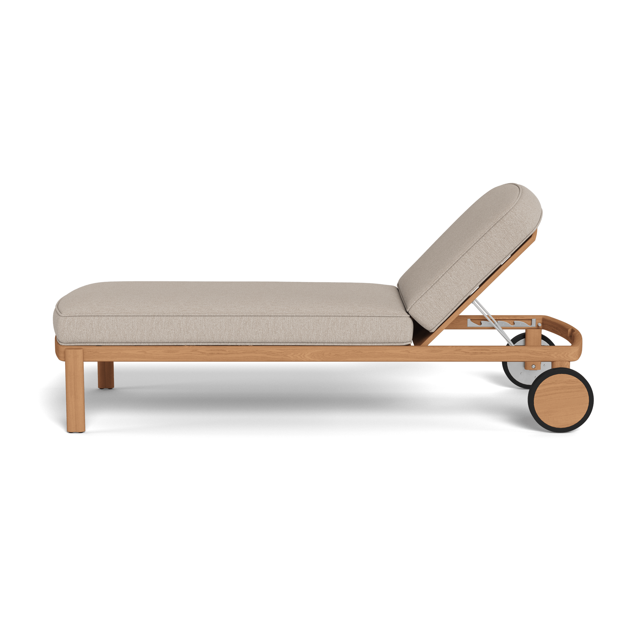 Influenced by modern Australian architecture and landscapes, our refined Cove collection features special details like double cylindrical legs and curved edges that create soft sculptural silhouettes. The Cove Sun Lounge is contemporary comfort — featuring a refined solid teak frame in Natural with an architectural double leg detail and special curved shape that echoes the design language signature to this series. Enjoy a plush all–weather hinged cushion in Copacabana Natural that invites sink–in comfort. Rear rubberized wheels add function and style. Tracery and light with a footprint to match, this comfort–driven outdoor sun lounge is a versatile design element for any space.