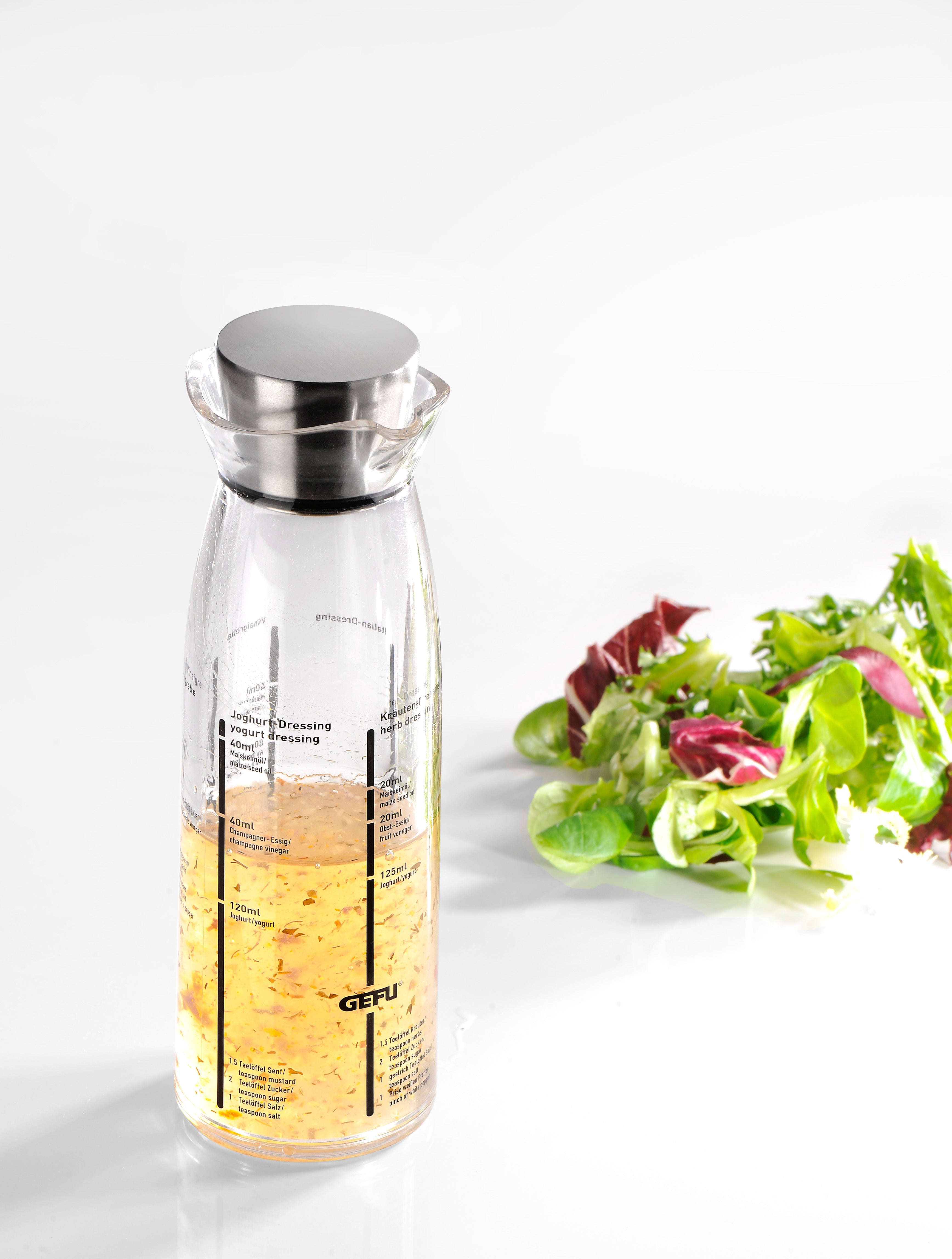 The dressing shaker is the perfect aid for preparing “healthy greens” in lots of tasty varieties. The recipes for five different dressings – Classical Vinaigrette, Herb Dressing, Yogurt, Italian dressing and Dijon vinaigrette – your salad dressings will come out perfectly at the flick of a wrist. The stainless steel stopper with its silicon seal and the pouring spout keep everything in place.
