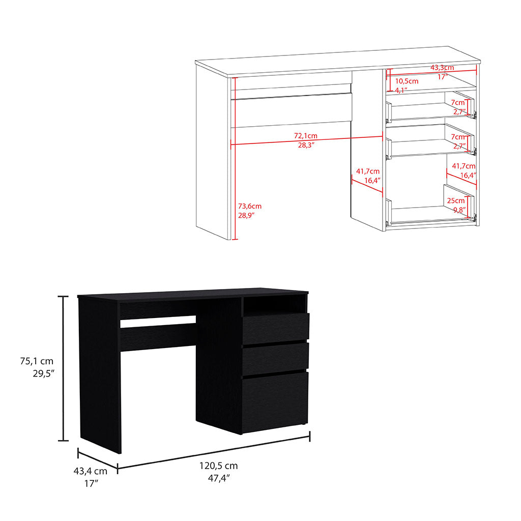 With its elegant and modern touch, the Dublin Three Drawer desk is a complete and compact solution for a small workspace. This desk is the perfect way to work from home. With three drawers( 4,13''H X 17,04''W 5,7''H X 18,22''W 11,41''H) for storage, it has plenty of room to keep your office supplies organized. The black finish gives it a modern look that will complement any home décor. With ideal size (47,44''W X 17,08''D X 29,52''H)