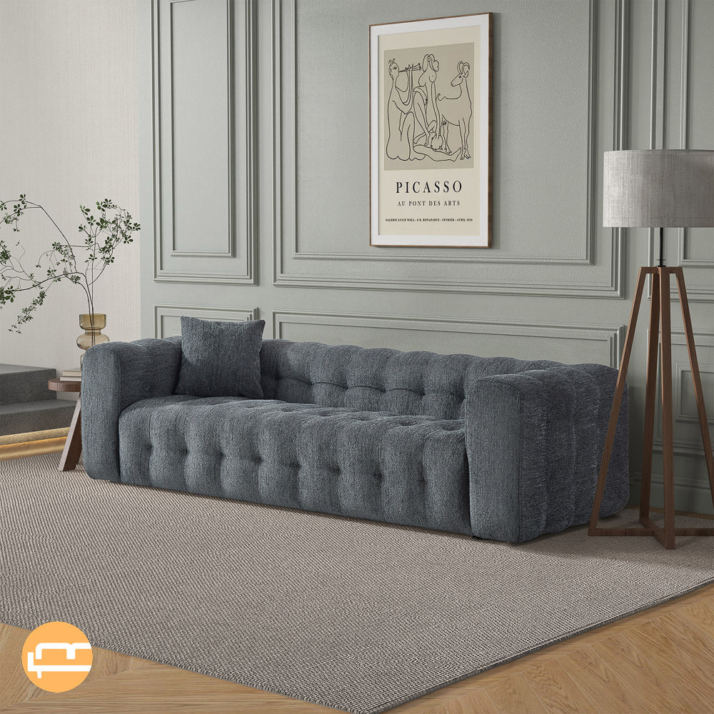 Eden comfortable living room couch will provide a fresh and pleasing look to your space and will be the center of attention thanks to its tufted chesterfield design. This designer style french boucle sofas creates an inviting space for your guests or family entertainment activities. Combining top-quality craftmanship and high-density foam, this set will provide you with great comfort and undoubtedly become the centerpiece of your aparment , living room, den, urban loft, condo. All pieces are made of top quality fabric and can be cleaned with a microfiber cloth. Removable legs allow for simple delivery for tight spaces. Easy assembly, everyday use comfortable, affordable and durable quality boucle fabric couches.